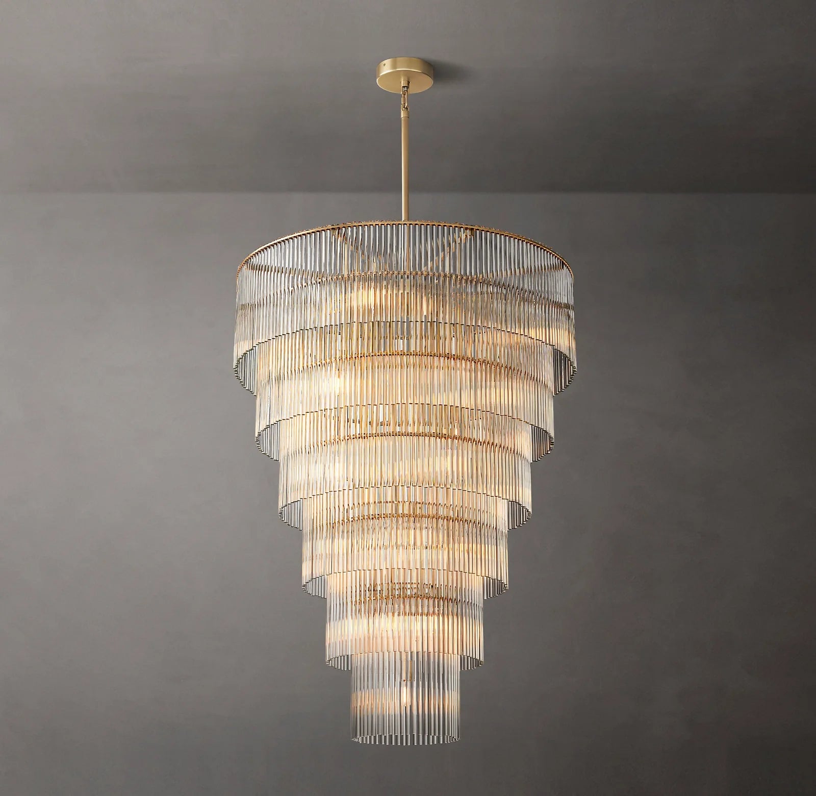 Composed of prismatic crystal rods, the Amadeo collection captures the glamour of the Jazz Age while celebrating the craft of Italian glassmaking. Resplendent and refined, the chandelier exudes a sense of movement, reflecting and refracting the light. Seen from below, the arrangement appears as if stars are shimmering overhead.