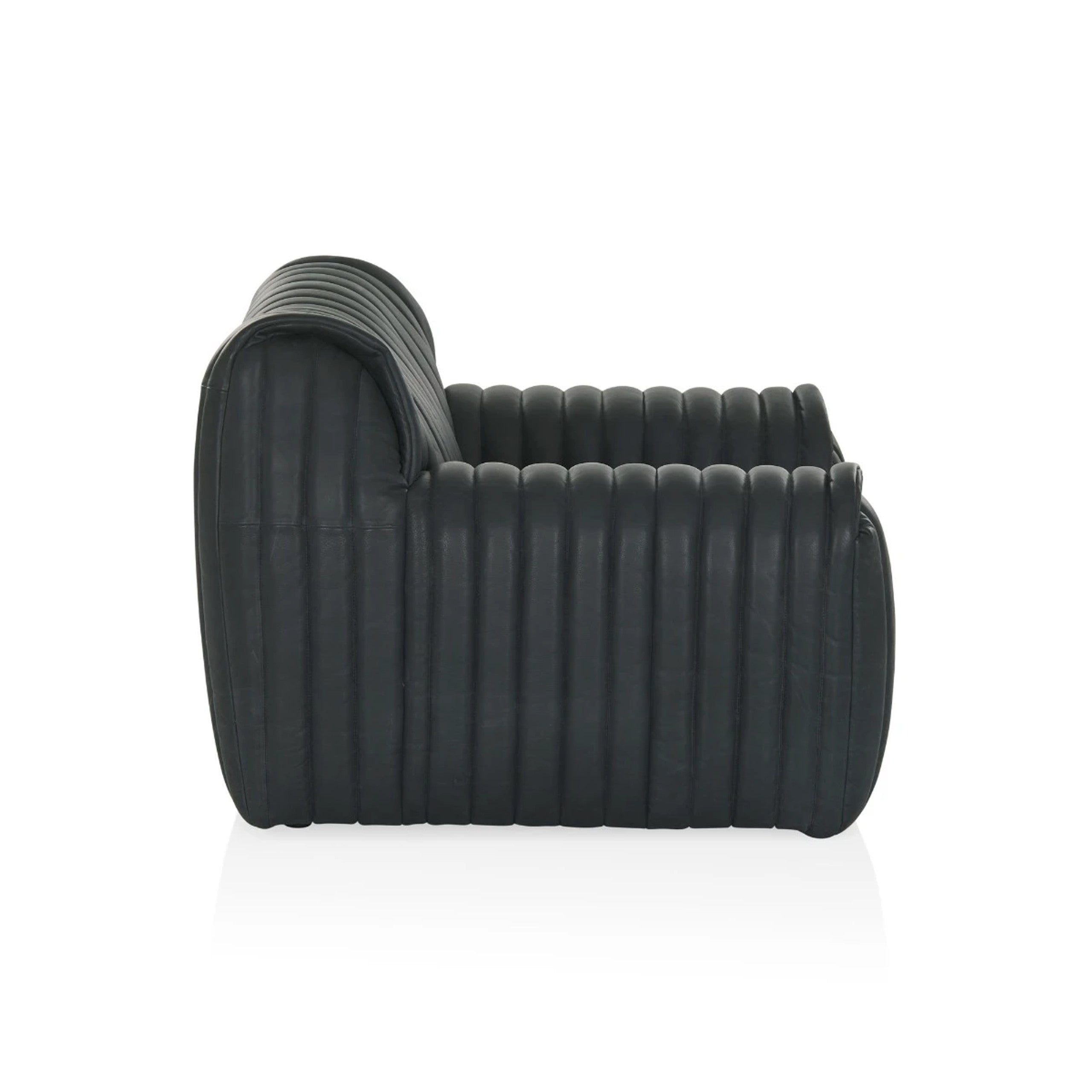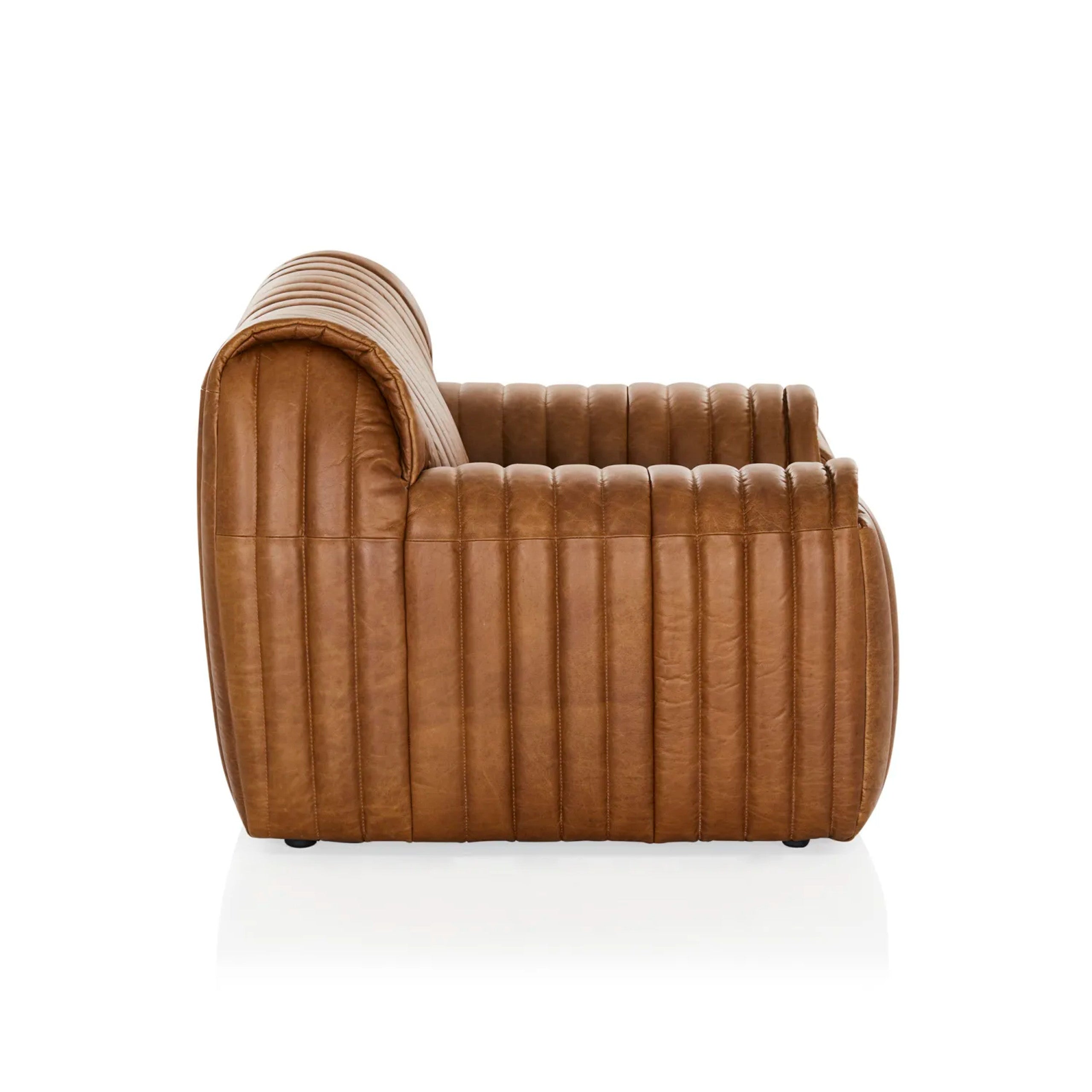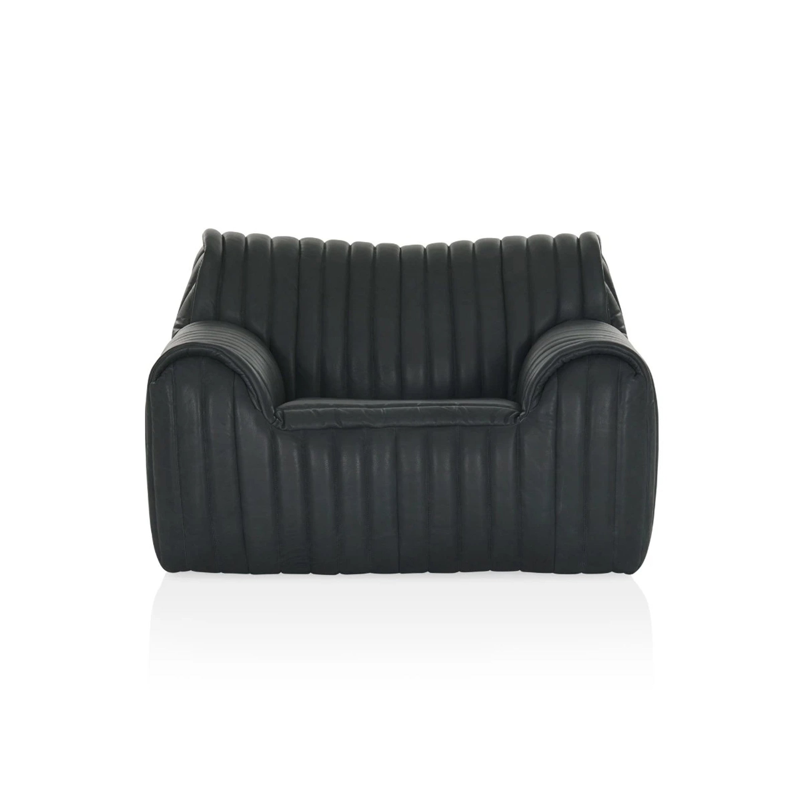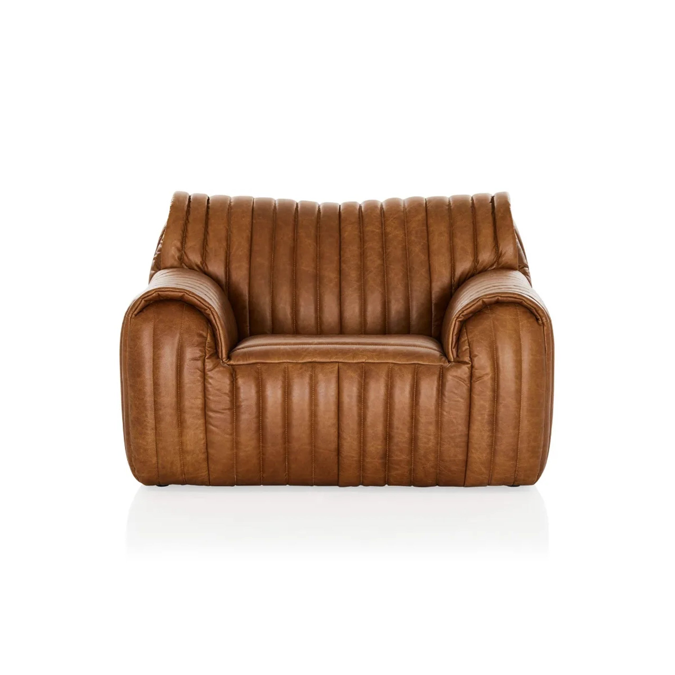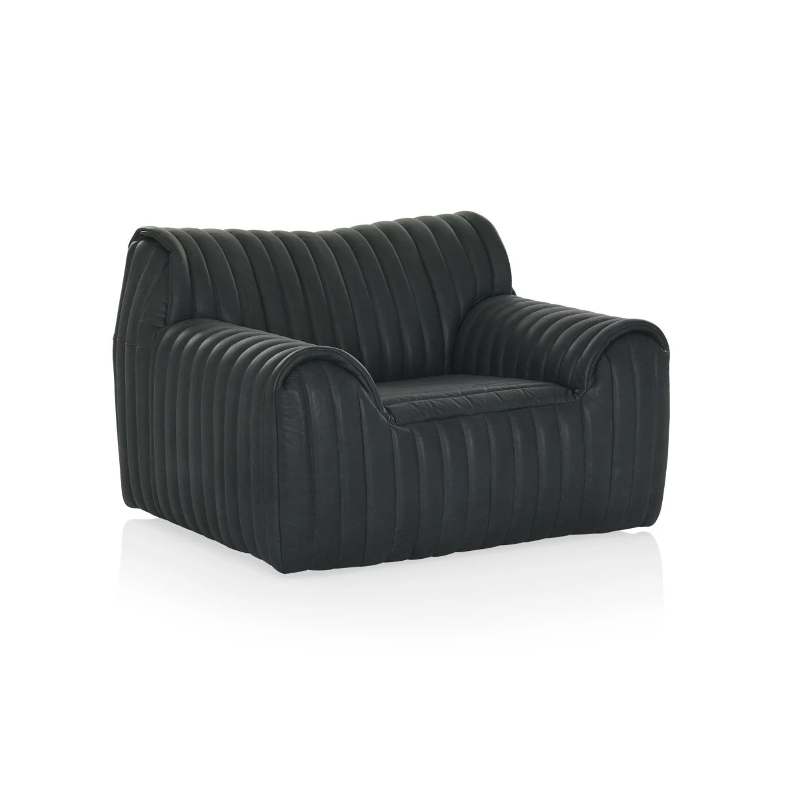Vintage inspired channeled design in top grain leather.|The Aspen Channel Leather Occasional Chair is a vintage inspired design with a monolithic silhouette and narrow channel detailing. Tightly upholstered in top grain leather in either sleek black or classic tan leather. As comfortable as it is cool the Aspen Channel range is a contemporary take on a vintage 1970's vibe.