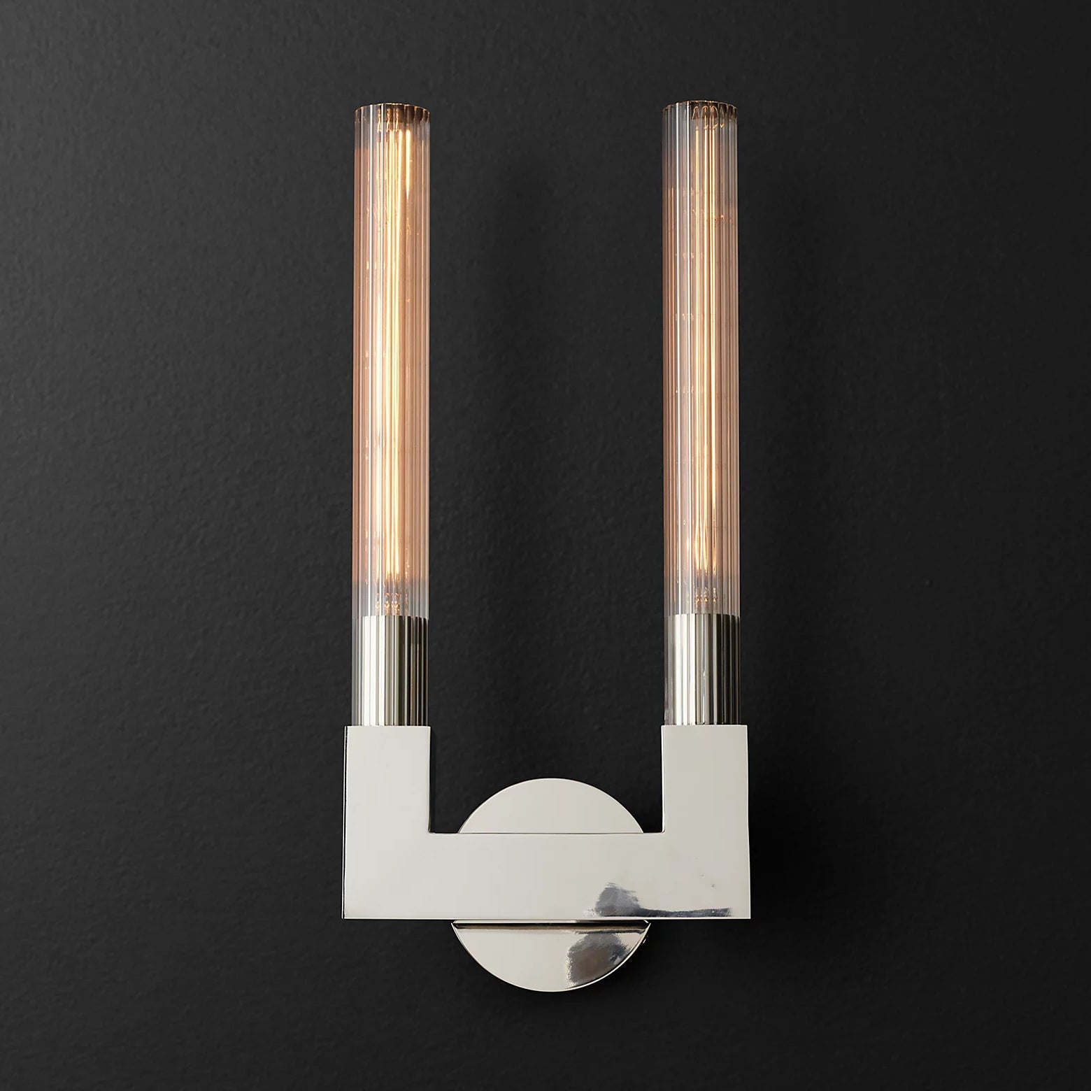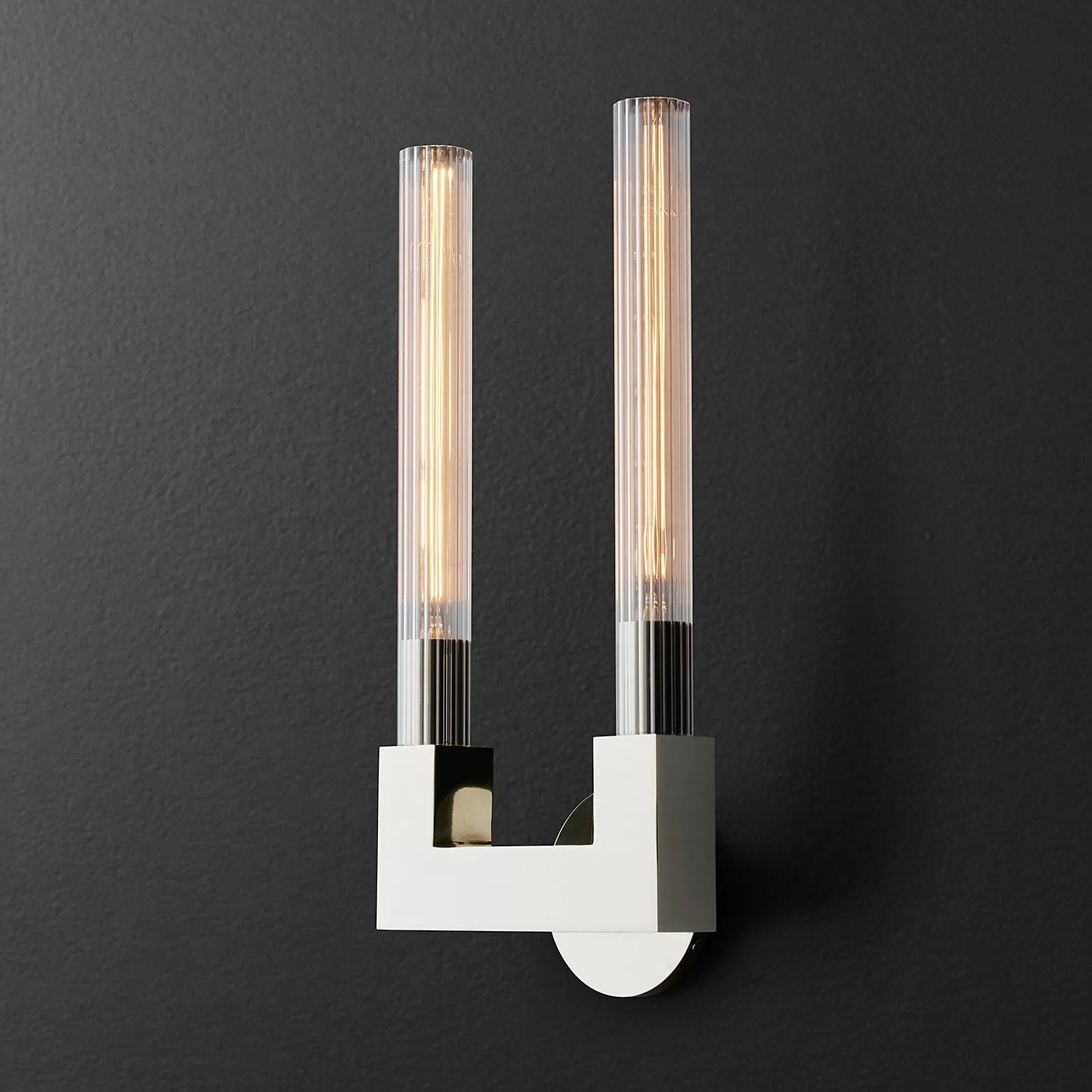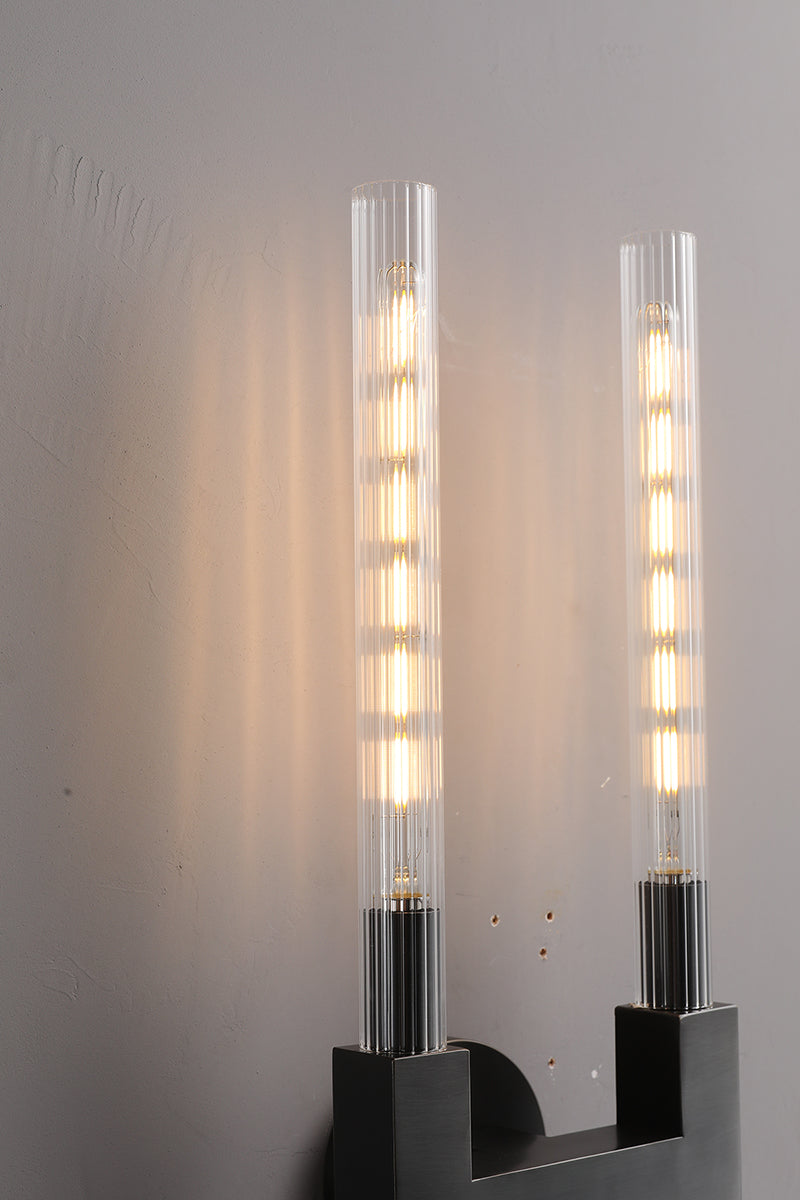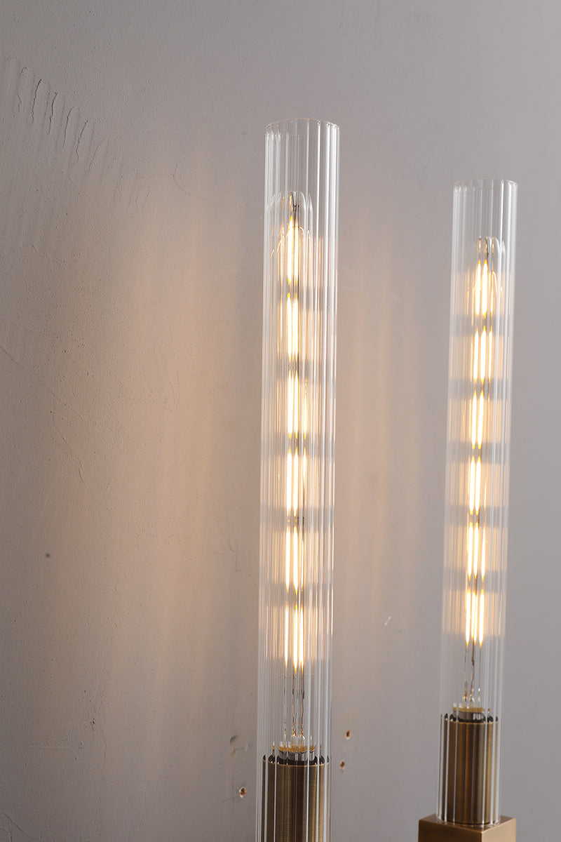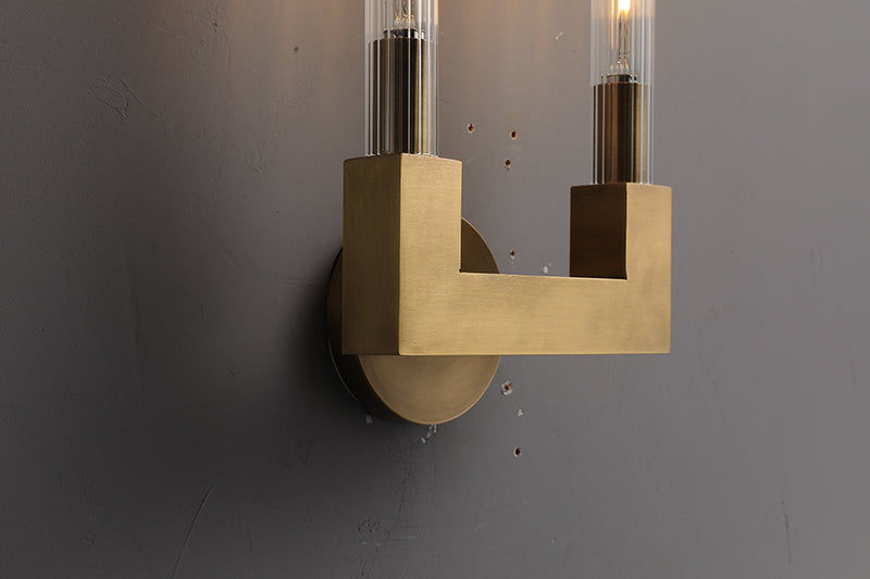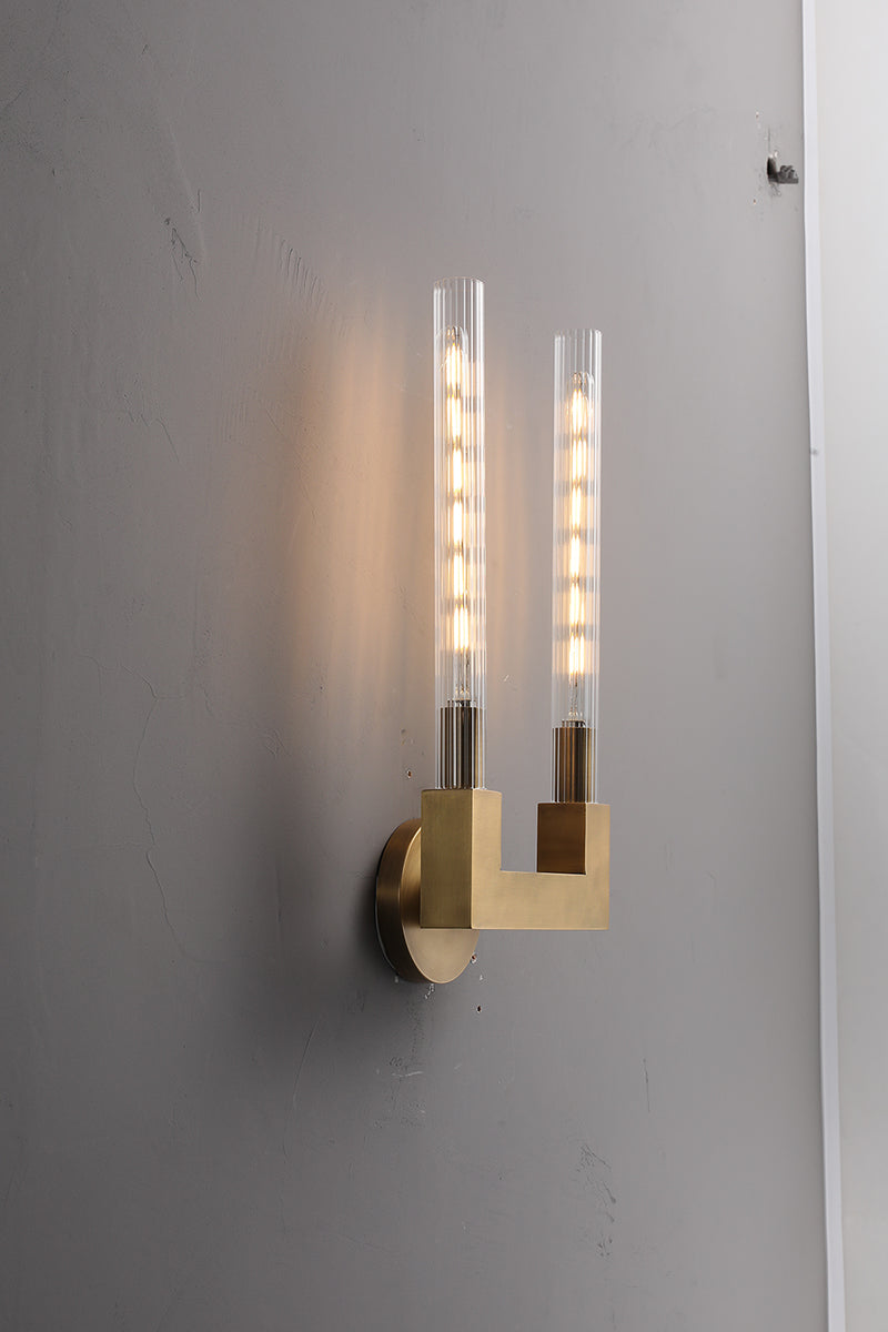 This Wall Sconce is a reinterpretation of the simple artistic chandelier form of solid brass. The lamp has simple lines and sharp angles. Its elegant prism Glass Hurricane shows an Edison filament bulb, which flashes like a candle.