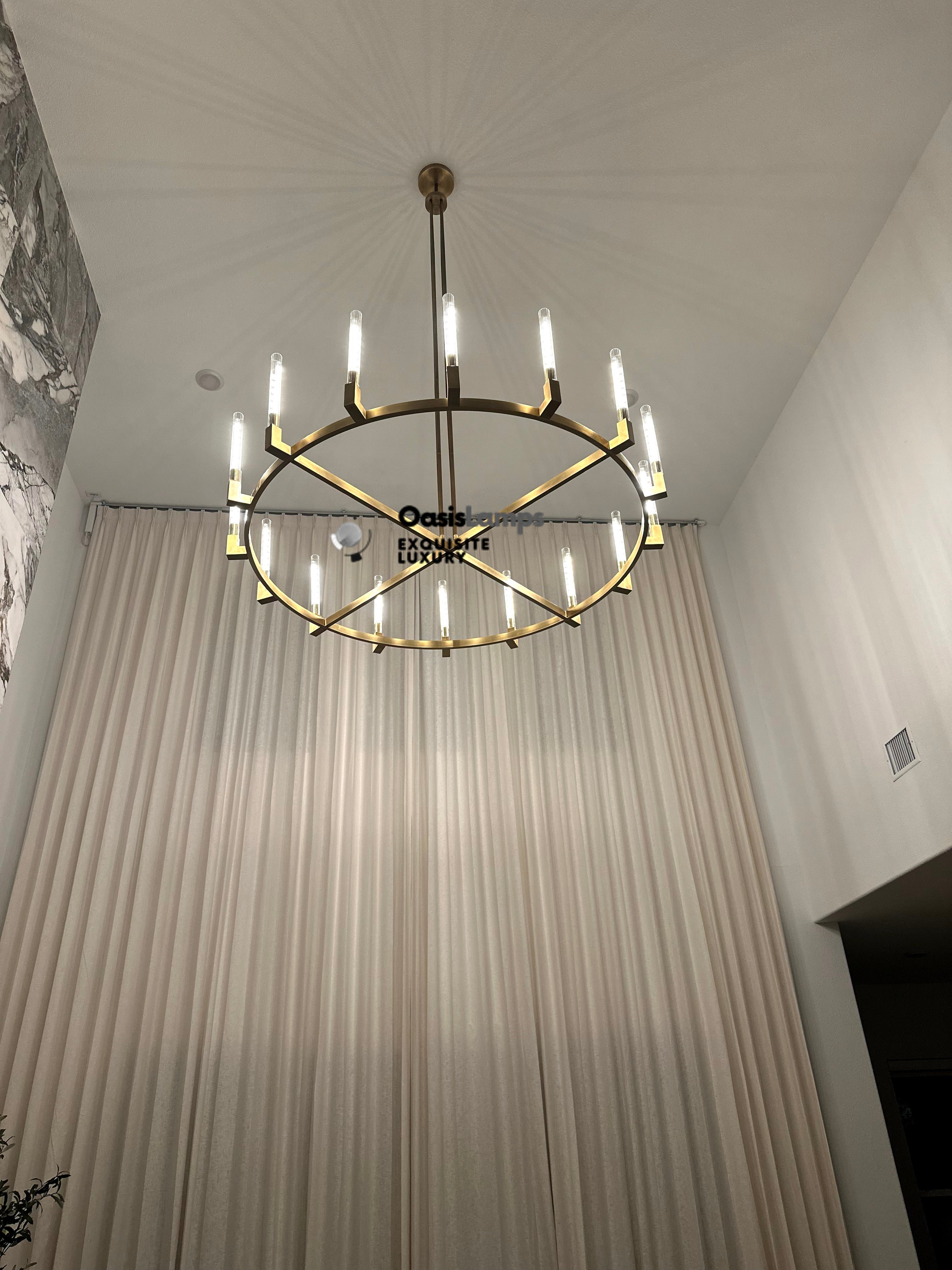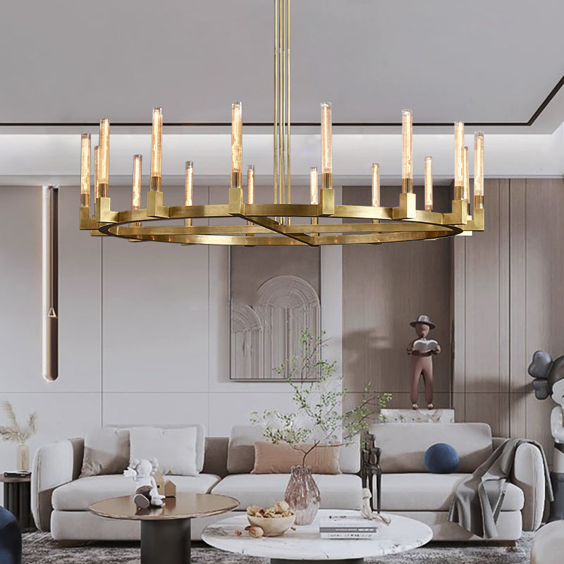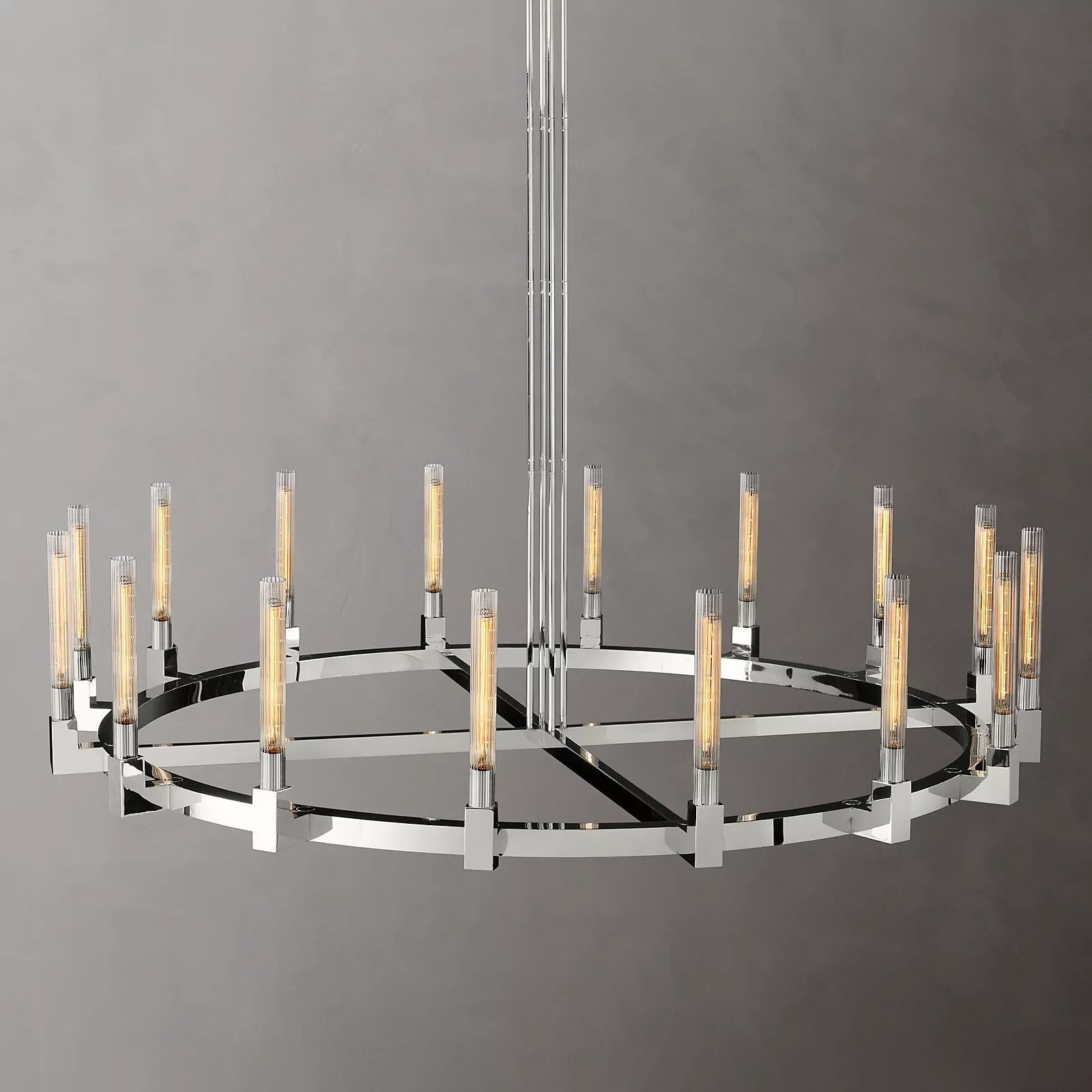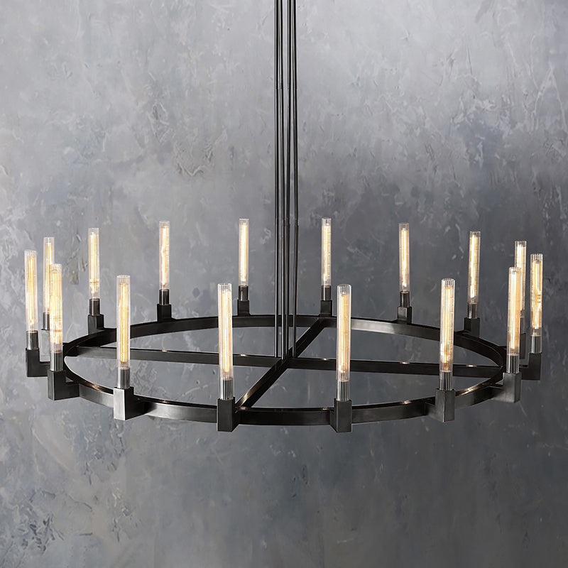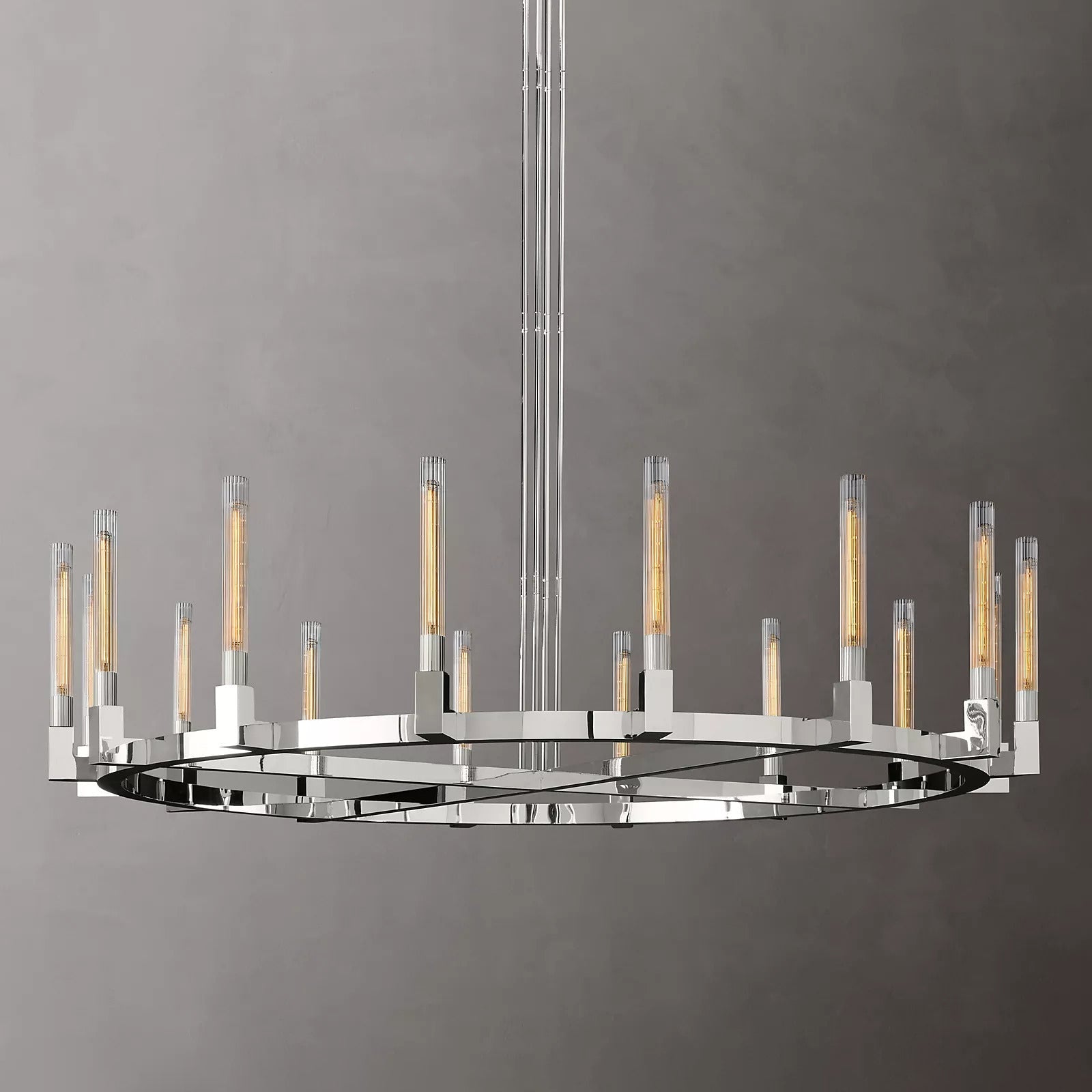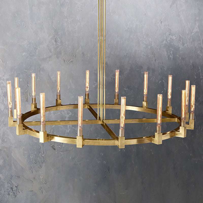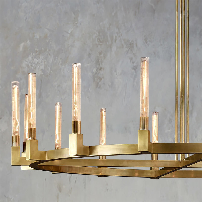 This chandelier reinterprets the American art chandelier form in solid brass. Featuring clean lines and sharp angles, the fixture's elegant prismatic glass showcases Edison filament bulbs that flicker like candles. You can use it in the living room, dining room and more spaces.