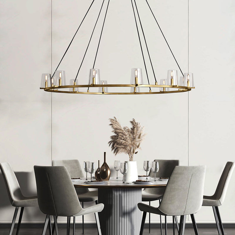 Inspired by French design of the 1940s, this chandelier is a study in balance and proportion. The tapered shade rests lightly on an X-shaped base made of solid brass, creating a contrast of mass and air. The clear glass refracts the light and shimmers as if it were a candle.