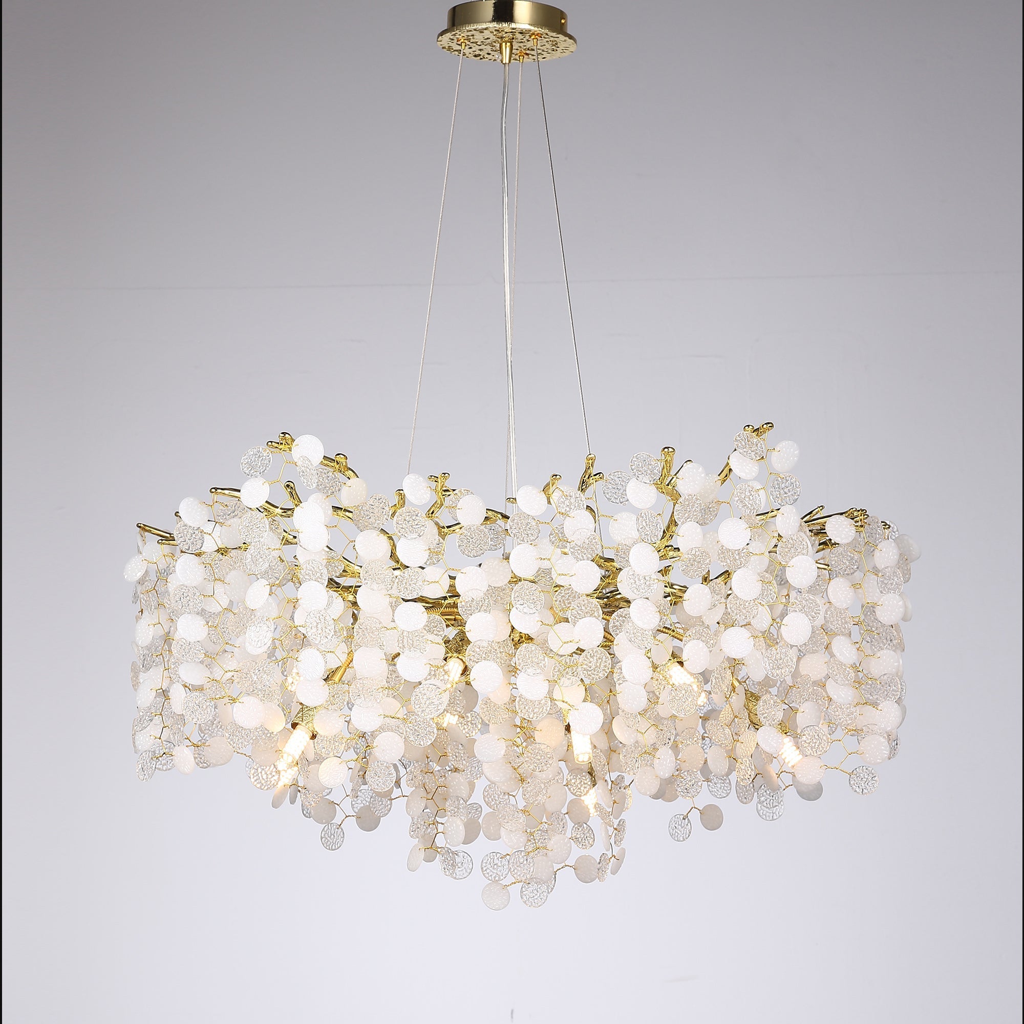 Introducing a contemporary branch chandelier crafted from brass and Crystal Glass. Each brass branch is meticulously twisted and shaped by hand, creating a natural and organic aesthetic adorned with exquisite coin-shaped glass elements. This elegant and charming fixture resembles a blossoming tree, adding a touch of grace to any space.