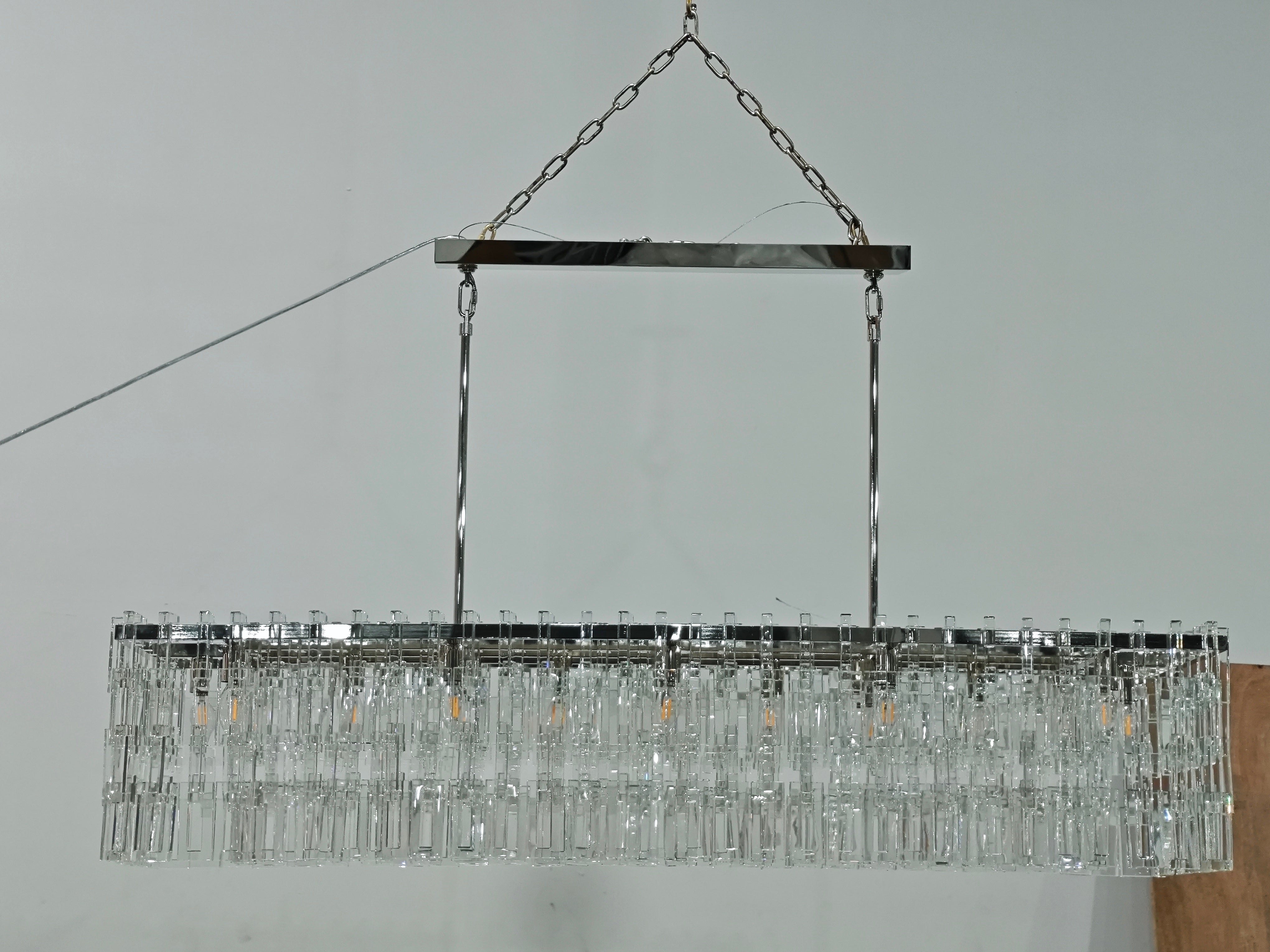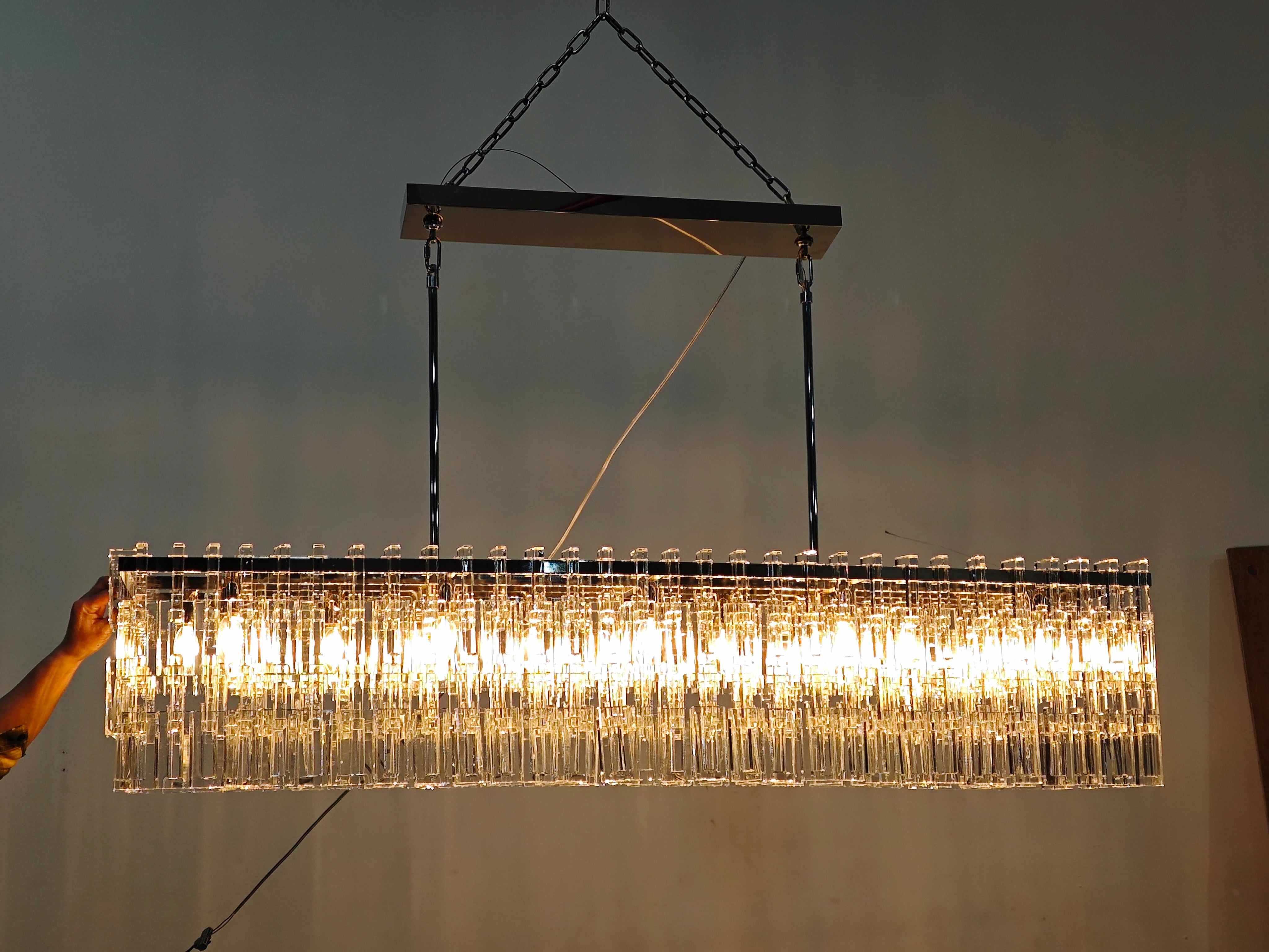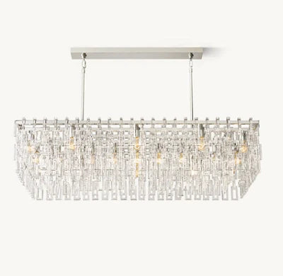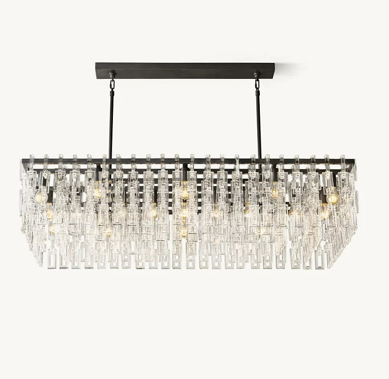 The chandelier is made of sand cast brass and K9 glass, a crystal used to make optical lenses and prisms. Connected with the O-shaped crystal. Inspired by industrial metal chains, it reimagines staggered open and closed links with amazing crystal glass. The pure, simple and stylized chain link is made of more than 600 crystals without wire suspension, creating a bright cascade and shining light.