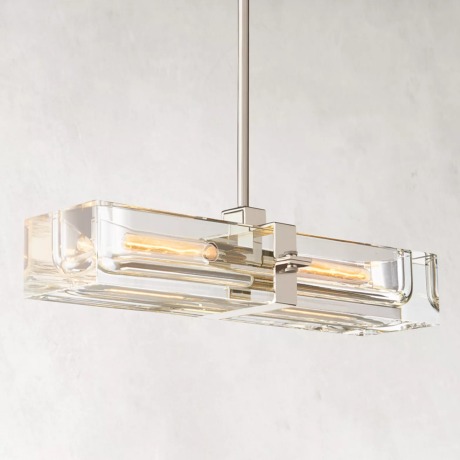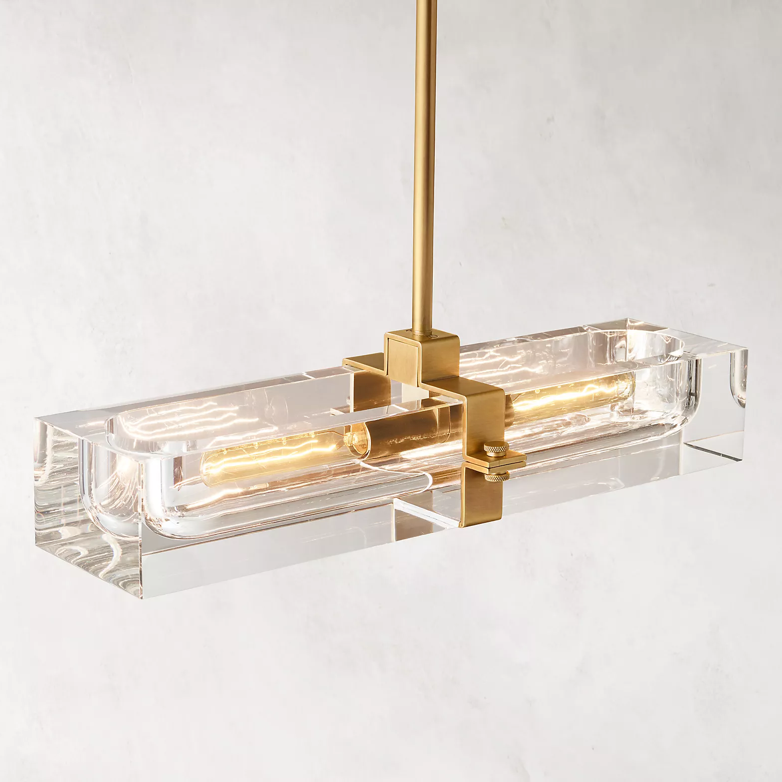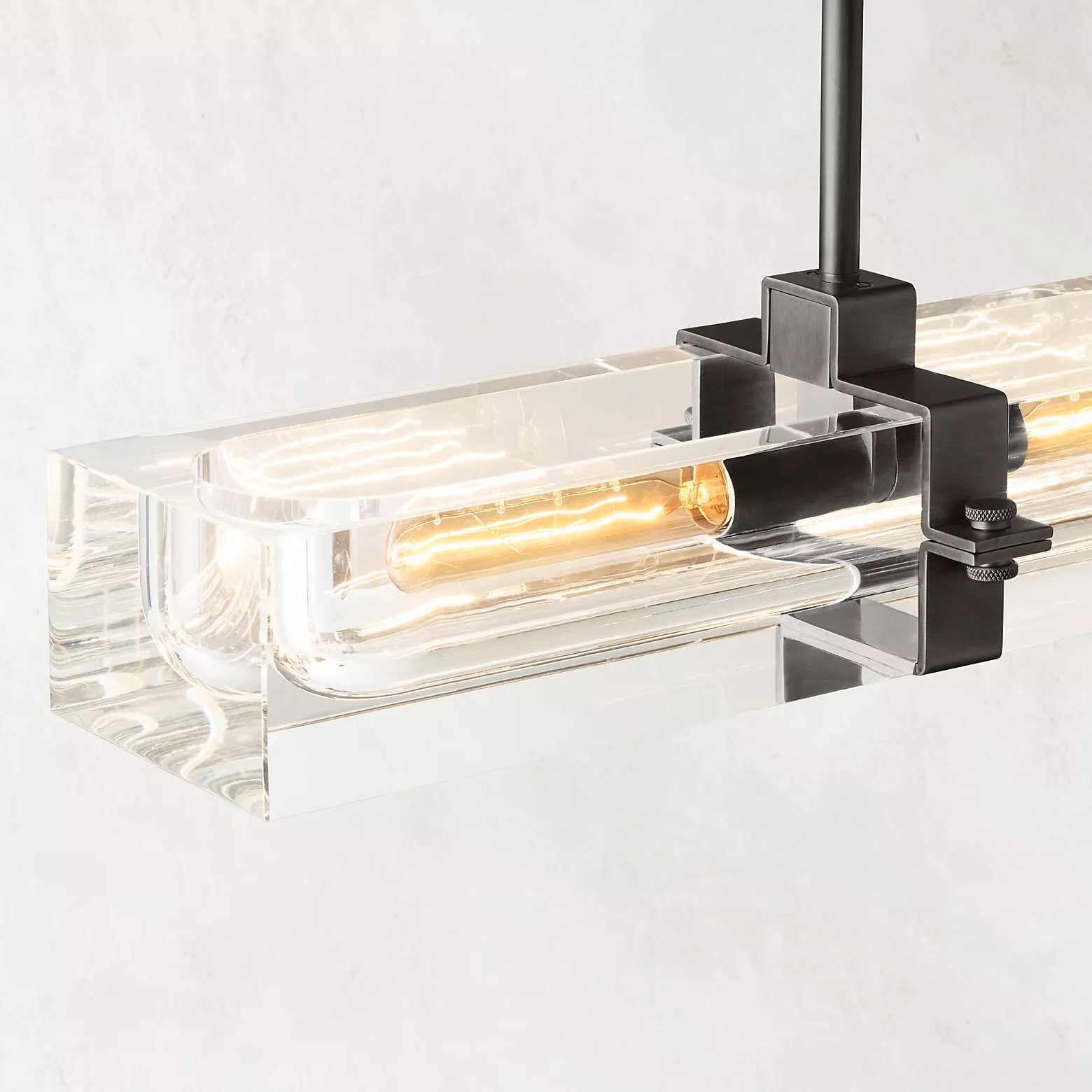 A massive piece of crystal is carved into a recessed channel to accommodate an Edison bulb set in a solid brass frame. The crystal shows its solidity when illuminated, refracting and reflecting the light bulb inside, yet exhibiting a weightless transparency in the dark.