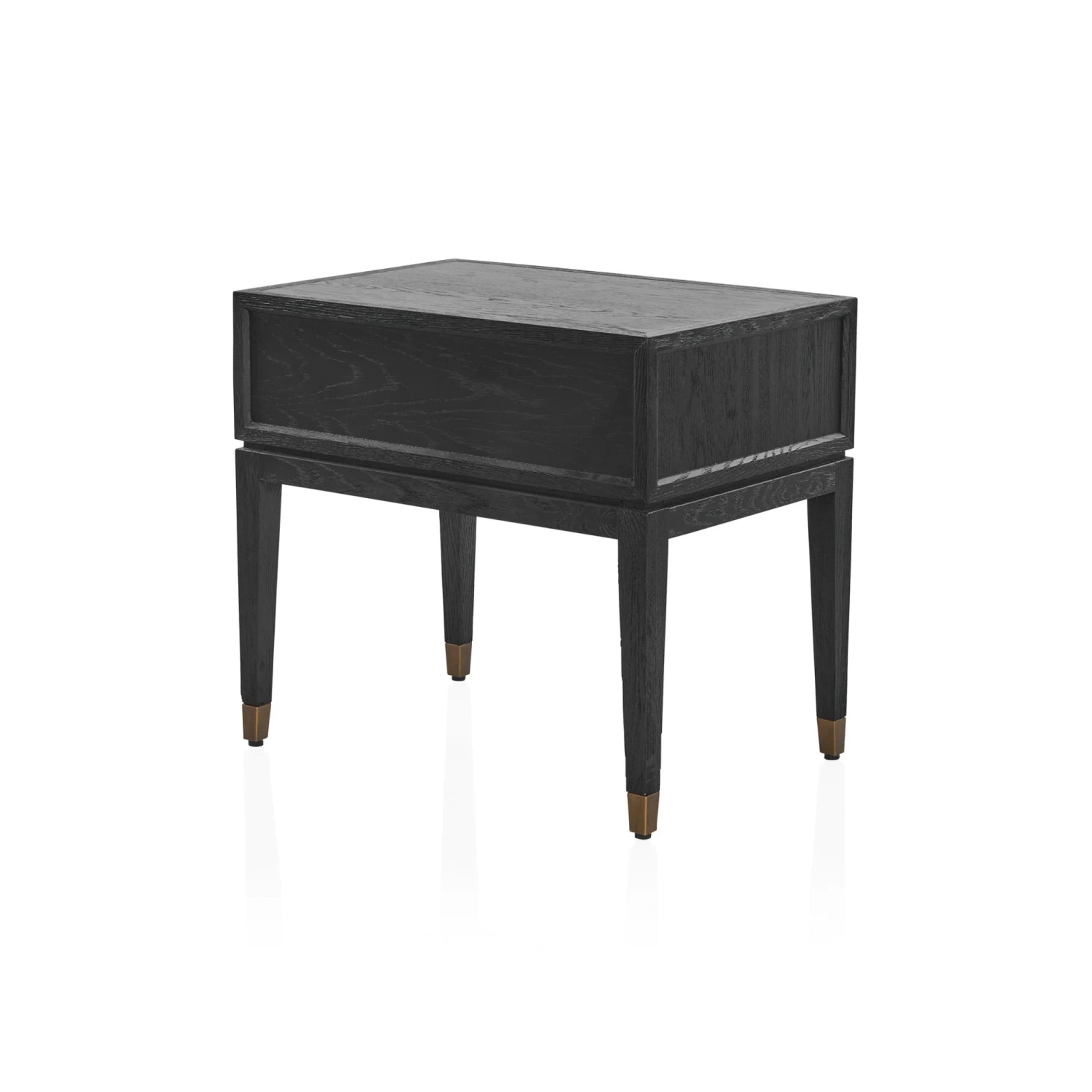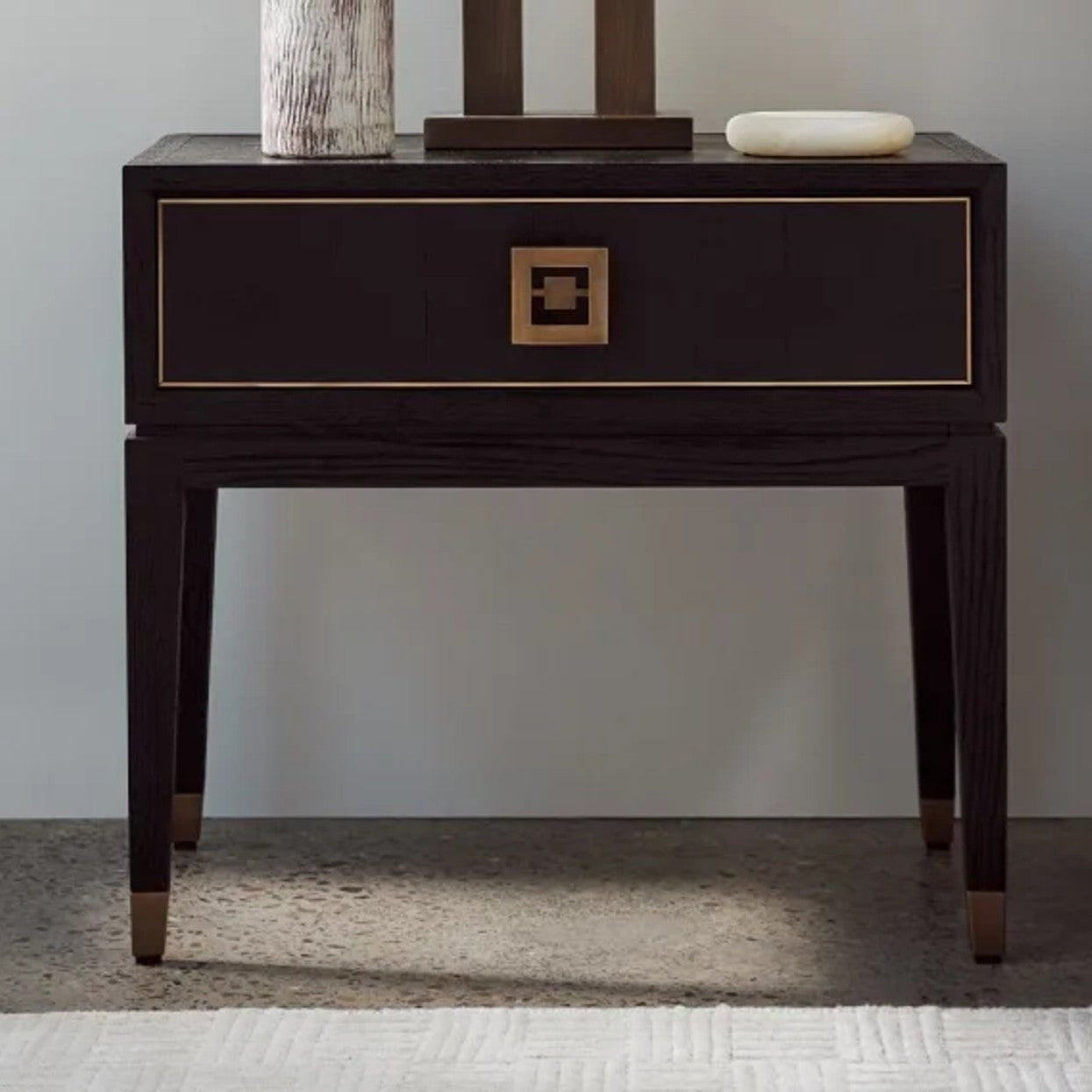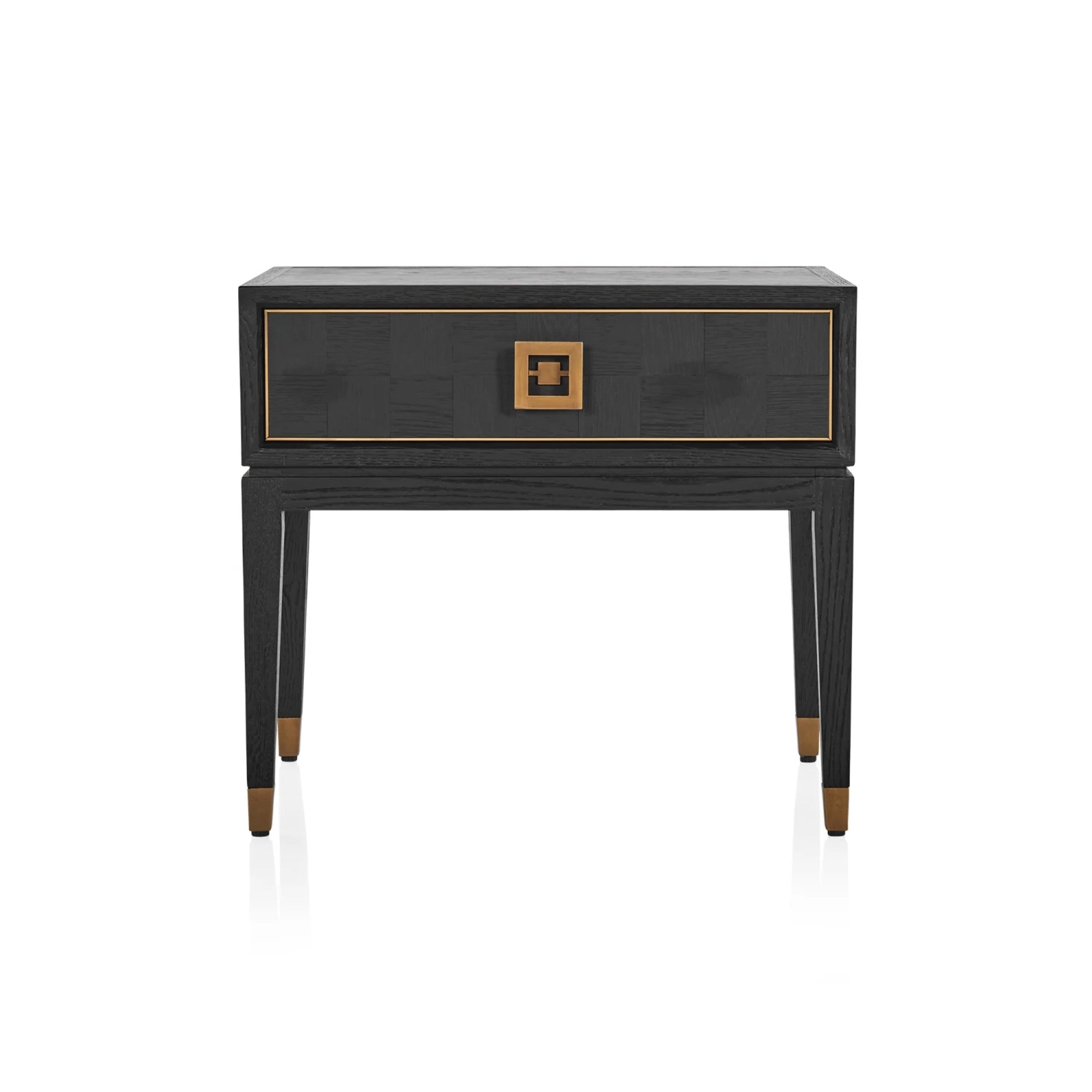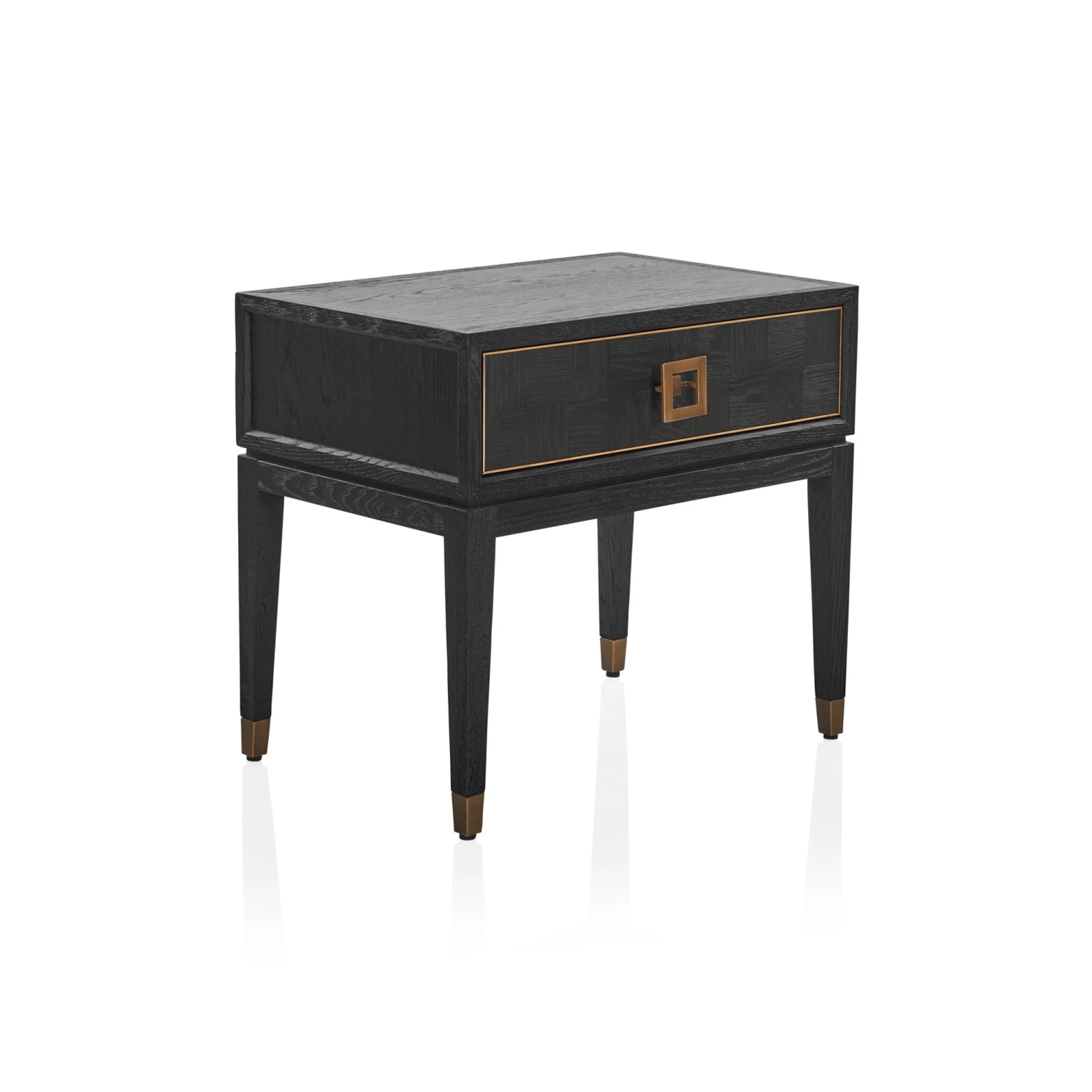 A sophisticated side table featuring square timber paneling with metal accents.|A classic design for the sophisticated home the Hermitage Side Table boasts hand-crafted blackened oak square paneling inlaid with brass to offer a subtle hint of luxury set atop elegantly tapered legs. Curated for the sophisticated home the Gramercy collection is inspired by interiors of chic Parisian homes. Handcrafted from timber with elegant metal accents the colour palette lends a refined modern edge to classic forms.