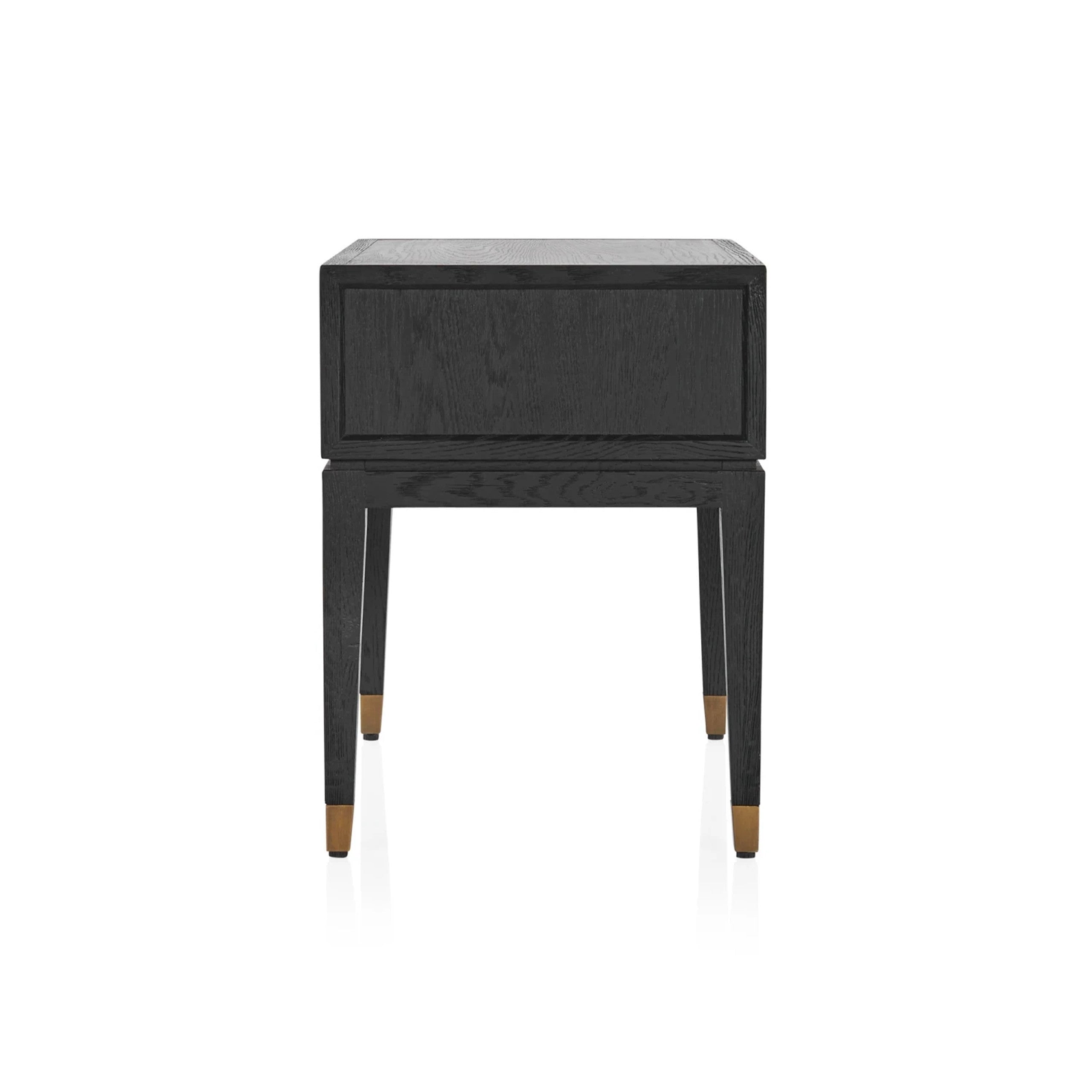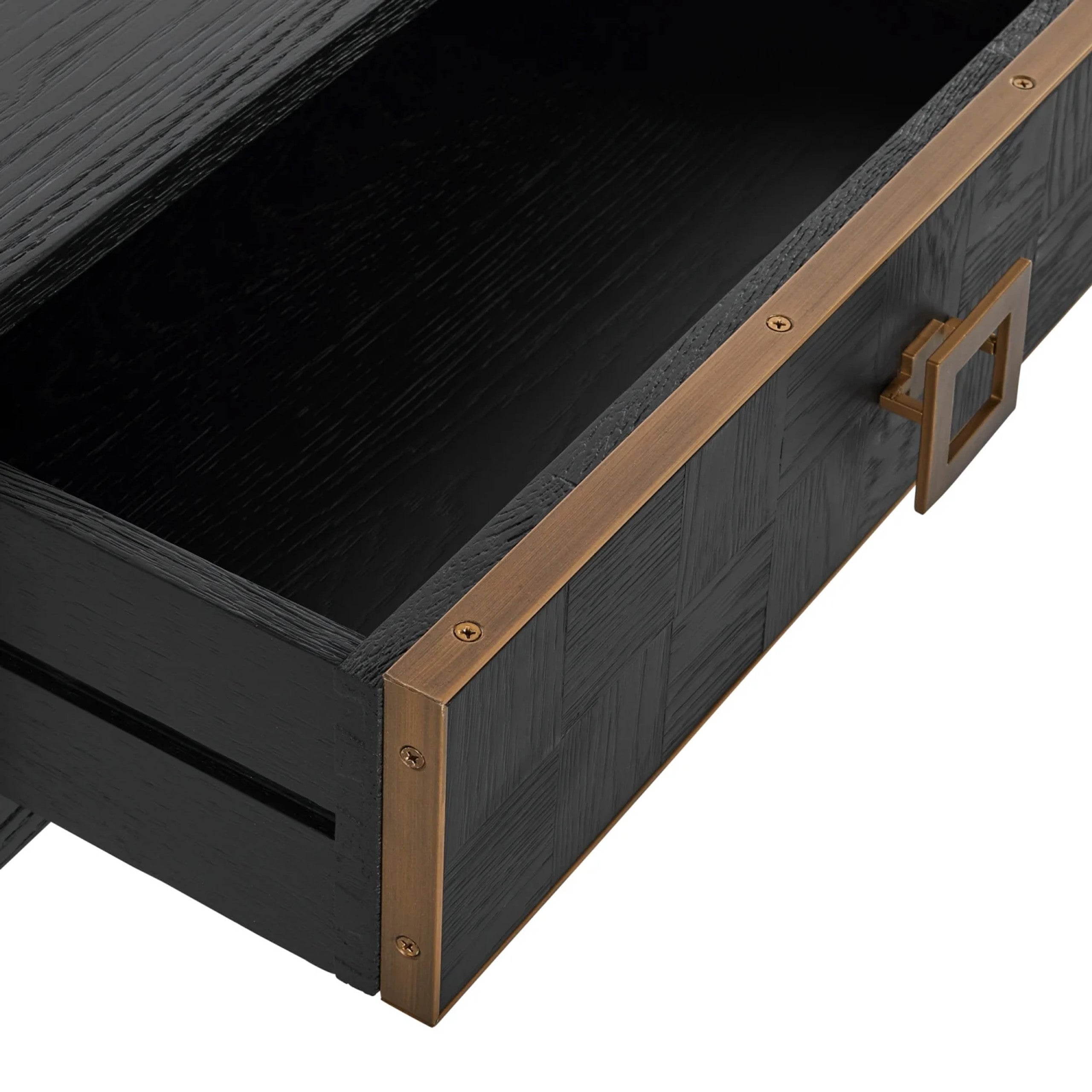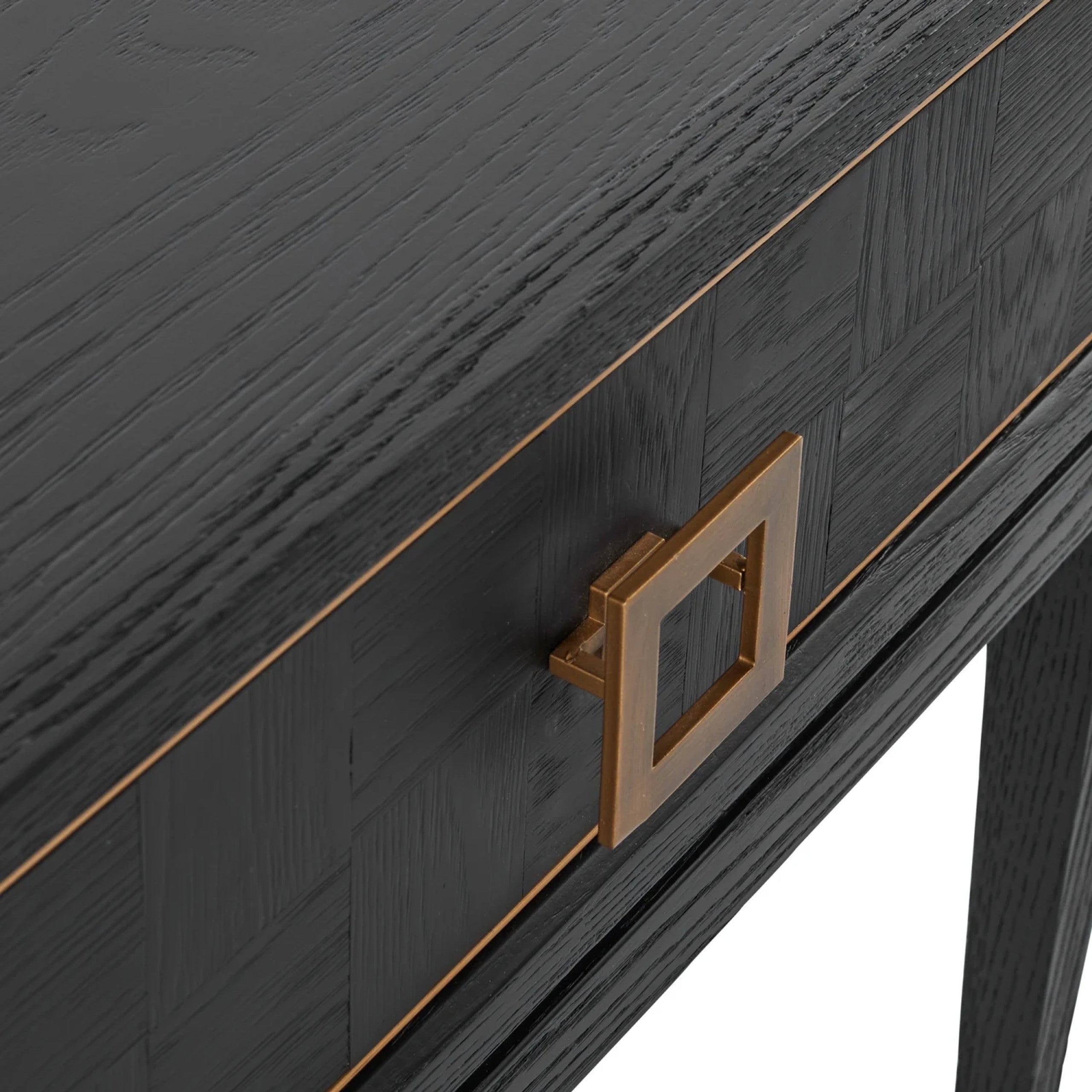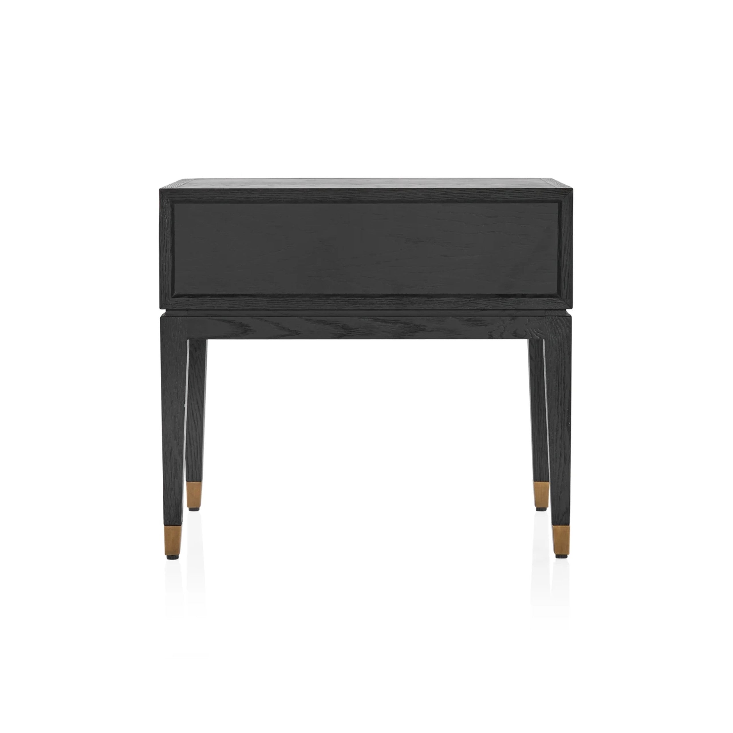 A sophisticated side table featuring square timber paneling with metal accents.|A classic design for the sophisticated home the Hermitage Side Table boasts hand-crafted blackened oak square paneling inlaid with brass to offer a subtle hint of luxury set atop elegantly tapered legs. Curated for the sophisticated home the Gramercy collection is inspired by interiors of chic Parisian homes. Handcrafted from timber with elegant metal accents the colour palette lends a refined modern edge to classic forms.