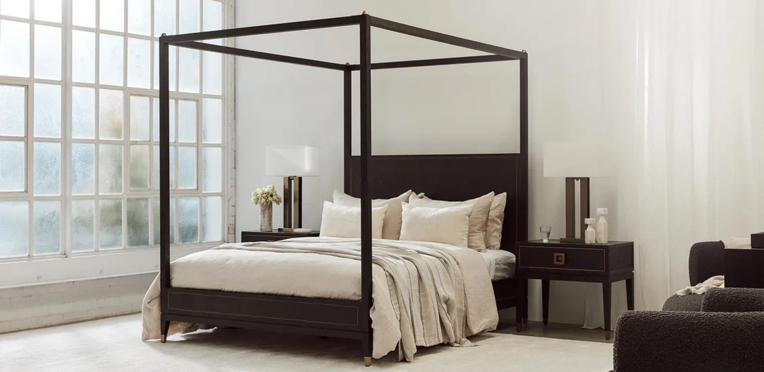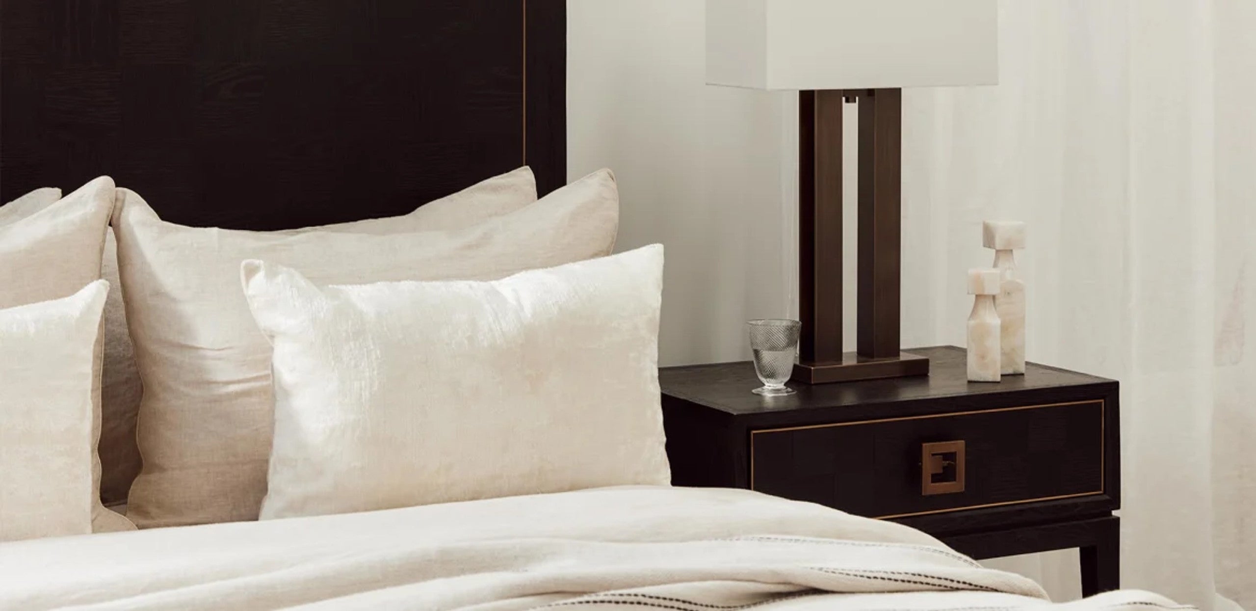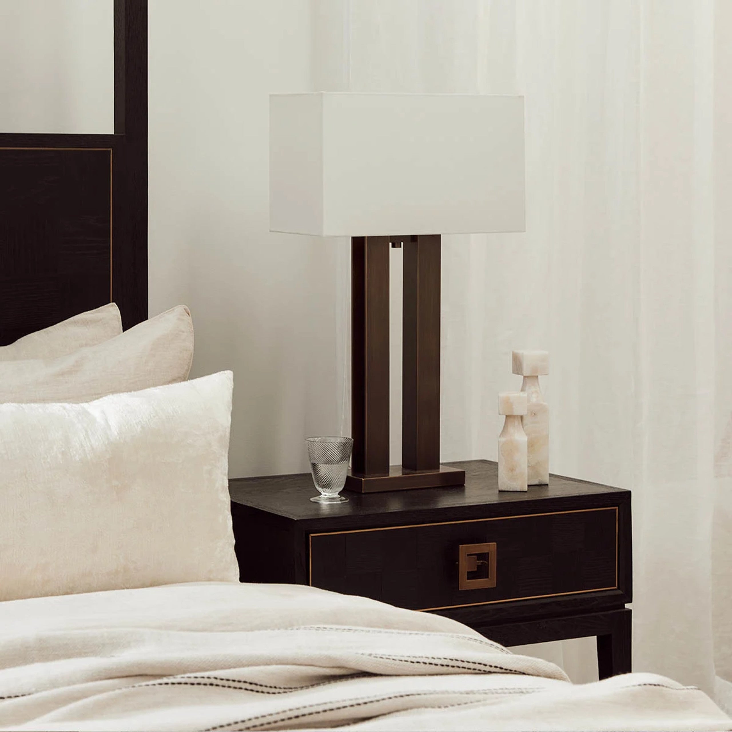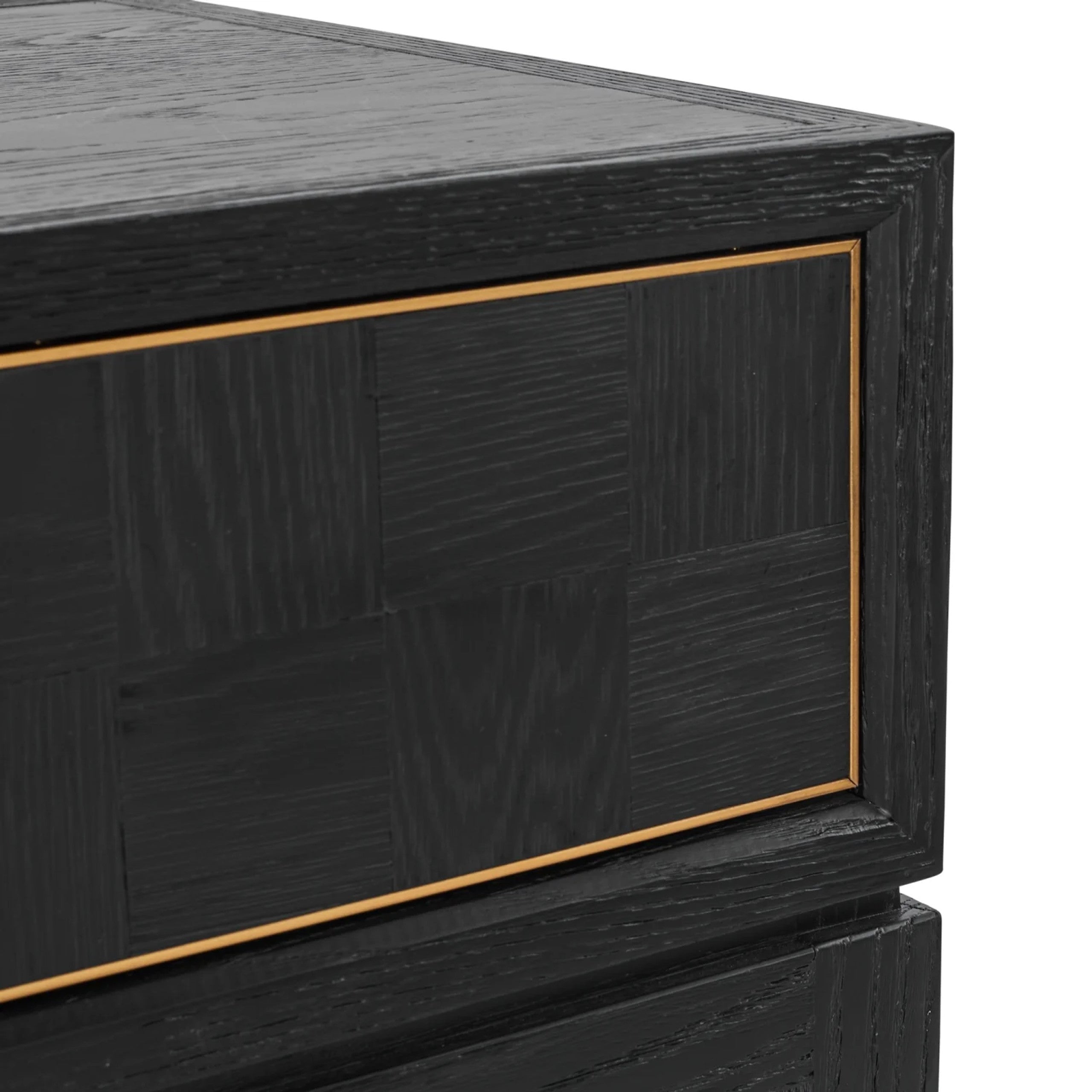 A sophisticated side table featuring square timber paneling with metal accents.|A classic design for the sophisticated home the Hermitage Side Table boasts hand-crafted blackened oak square paneling inlaid with brass to offer a subtle hint of luxury set atop elegantly tapered legs. Curated for the sophisticated home the Gramercy collection is inspired by interiors of chic Parisian homes. Handcrafted from timber with elegant metal accents the colour palette lends a refined modern edge to classic forms.