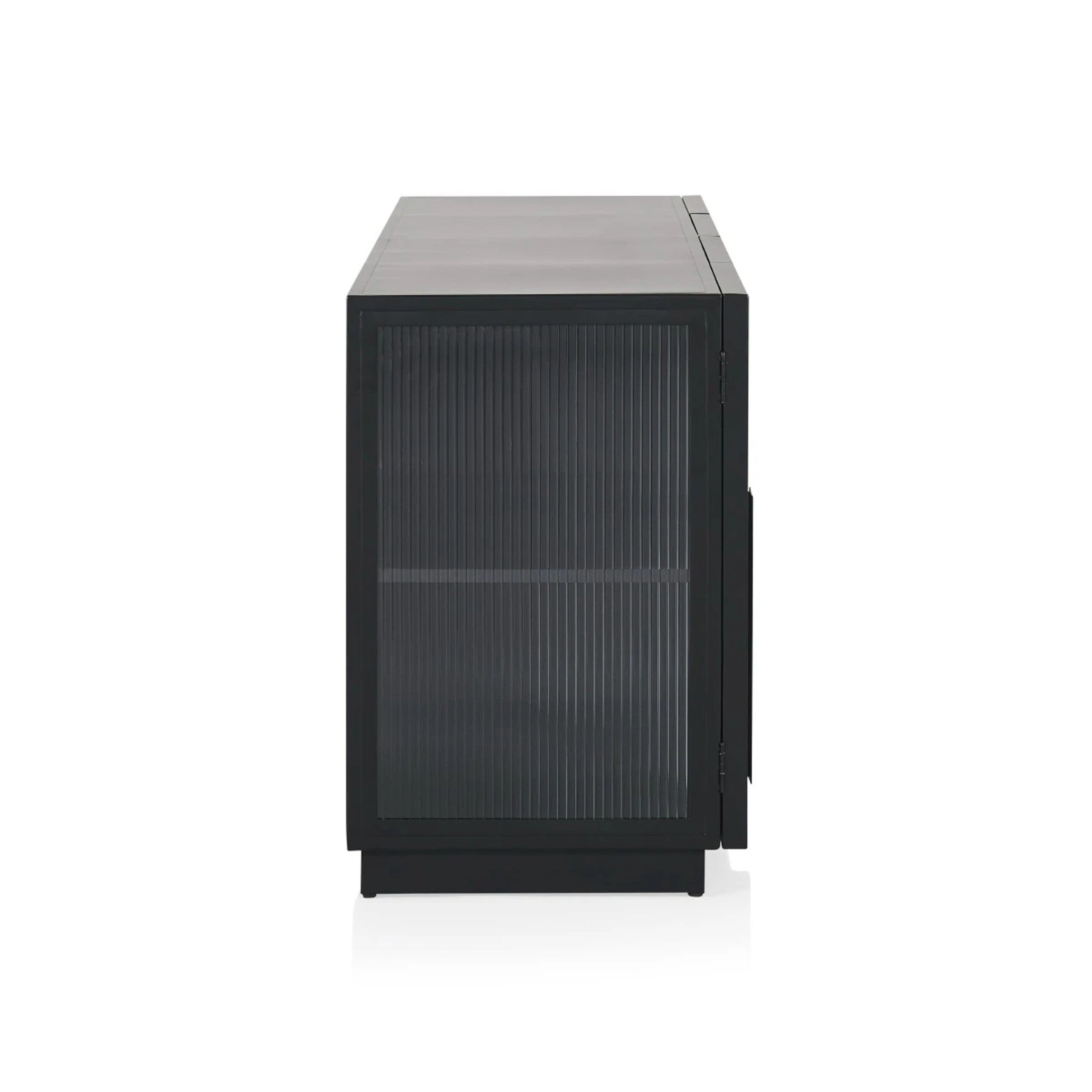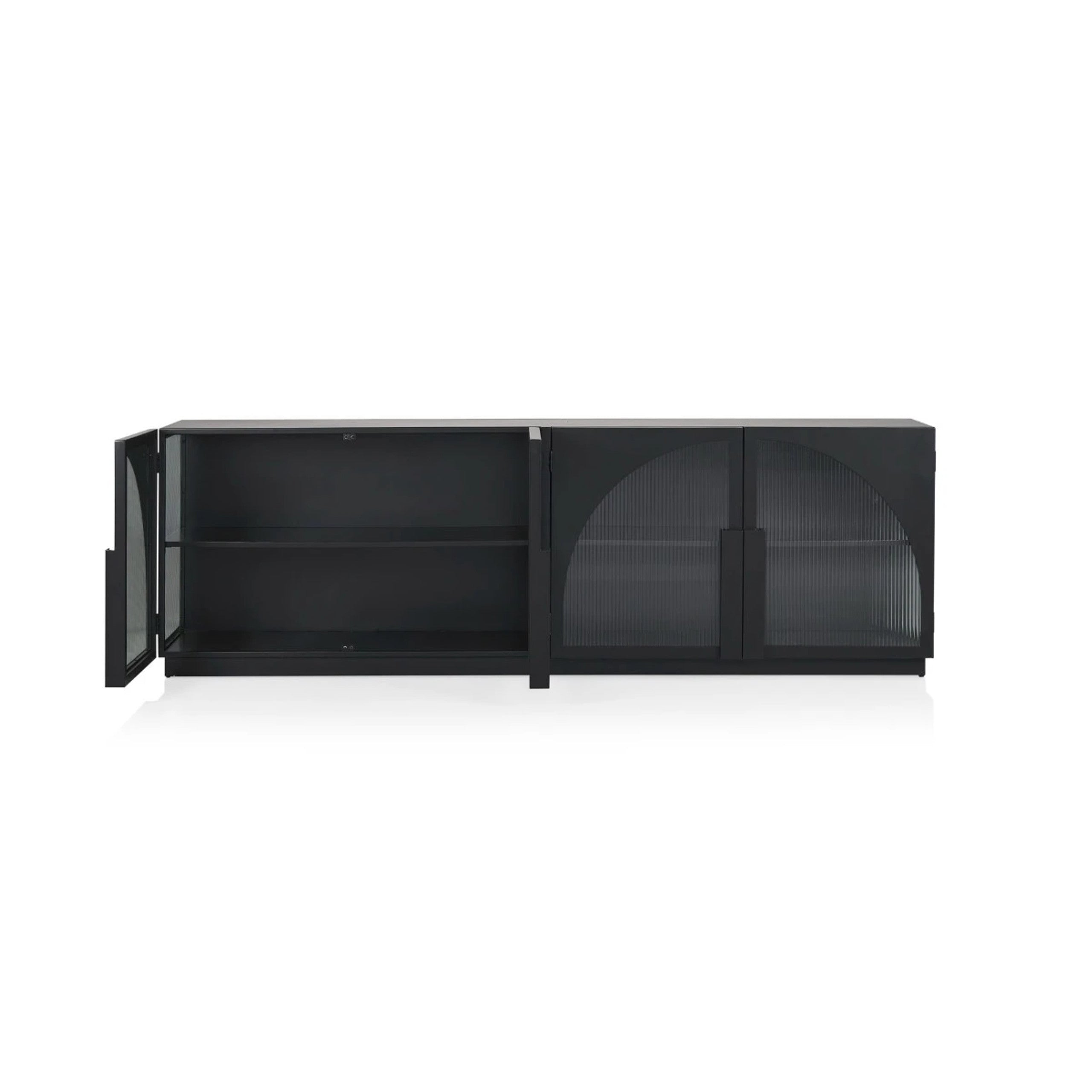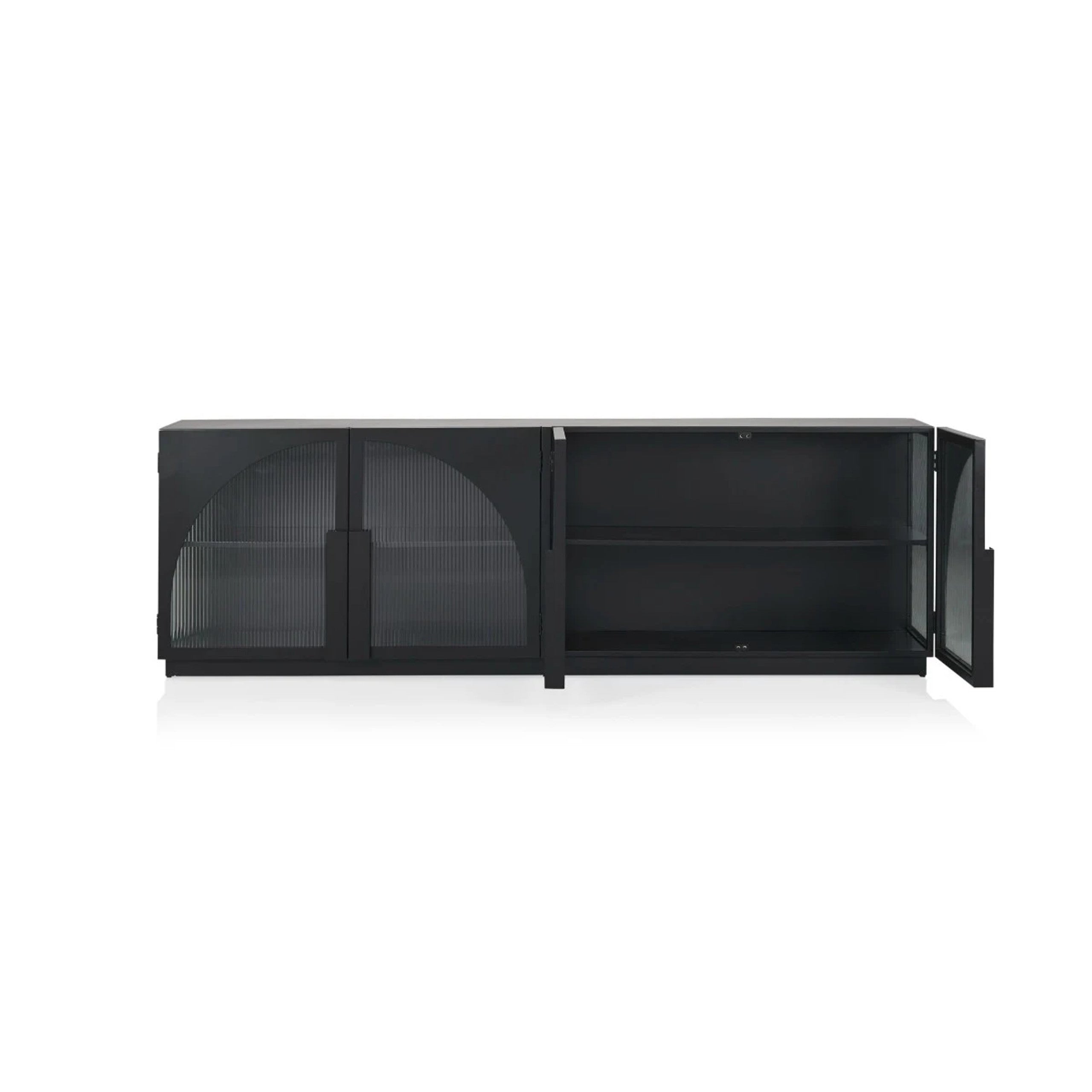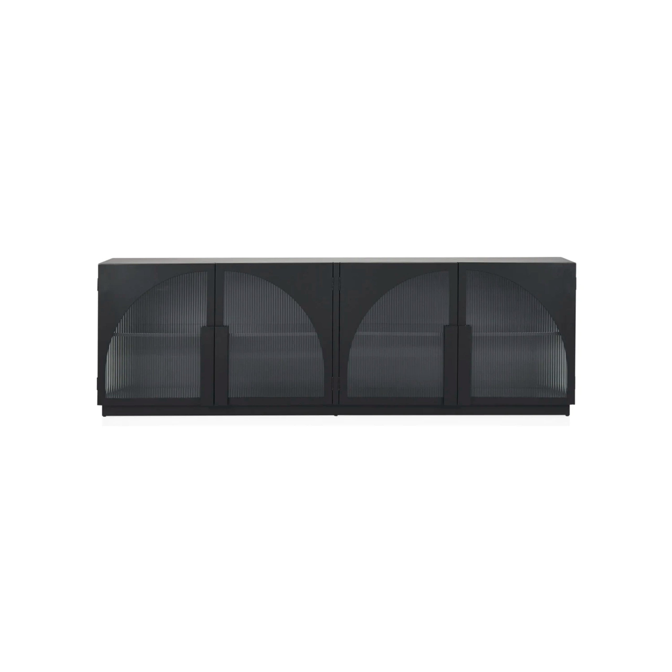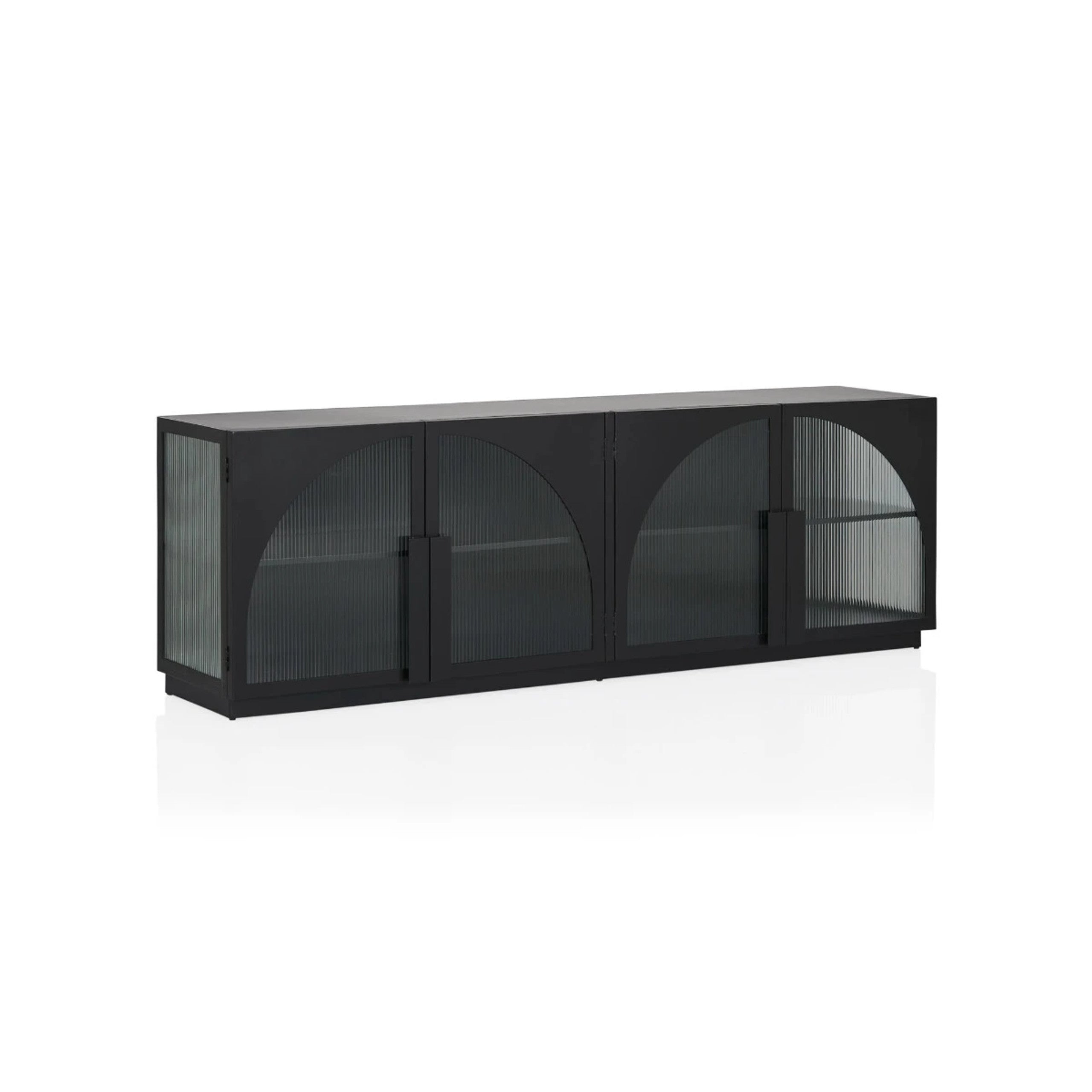 Contemporary steel frame entertainment unit with fluted glass.|Referencing french romanesque architecture with its distinctive round arches and strong angles the Isabella desk makes an impressive statement with its matt black steel frame and fluted glass.