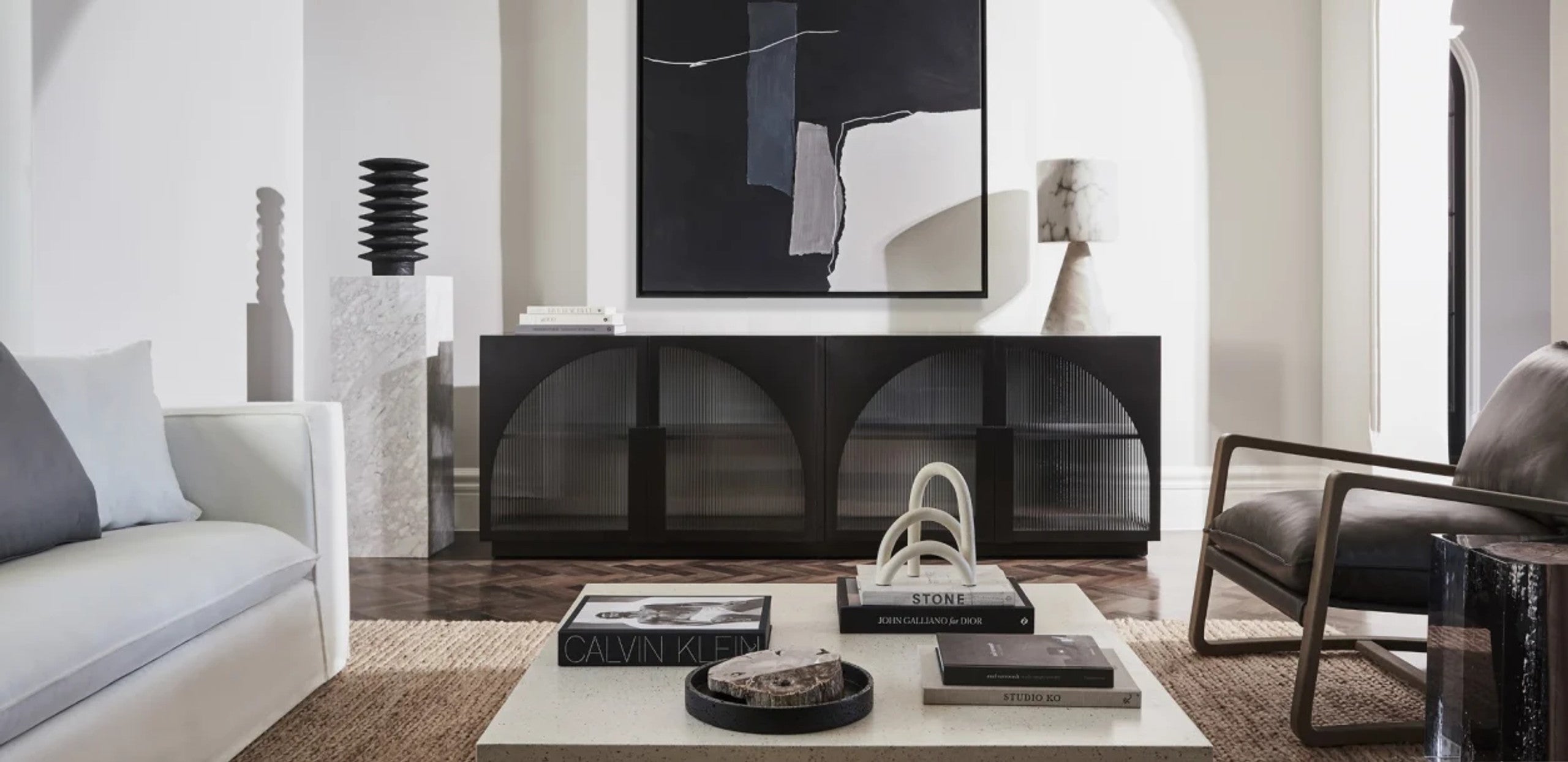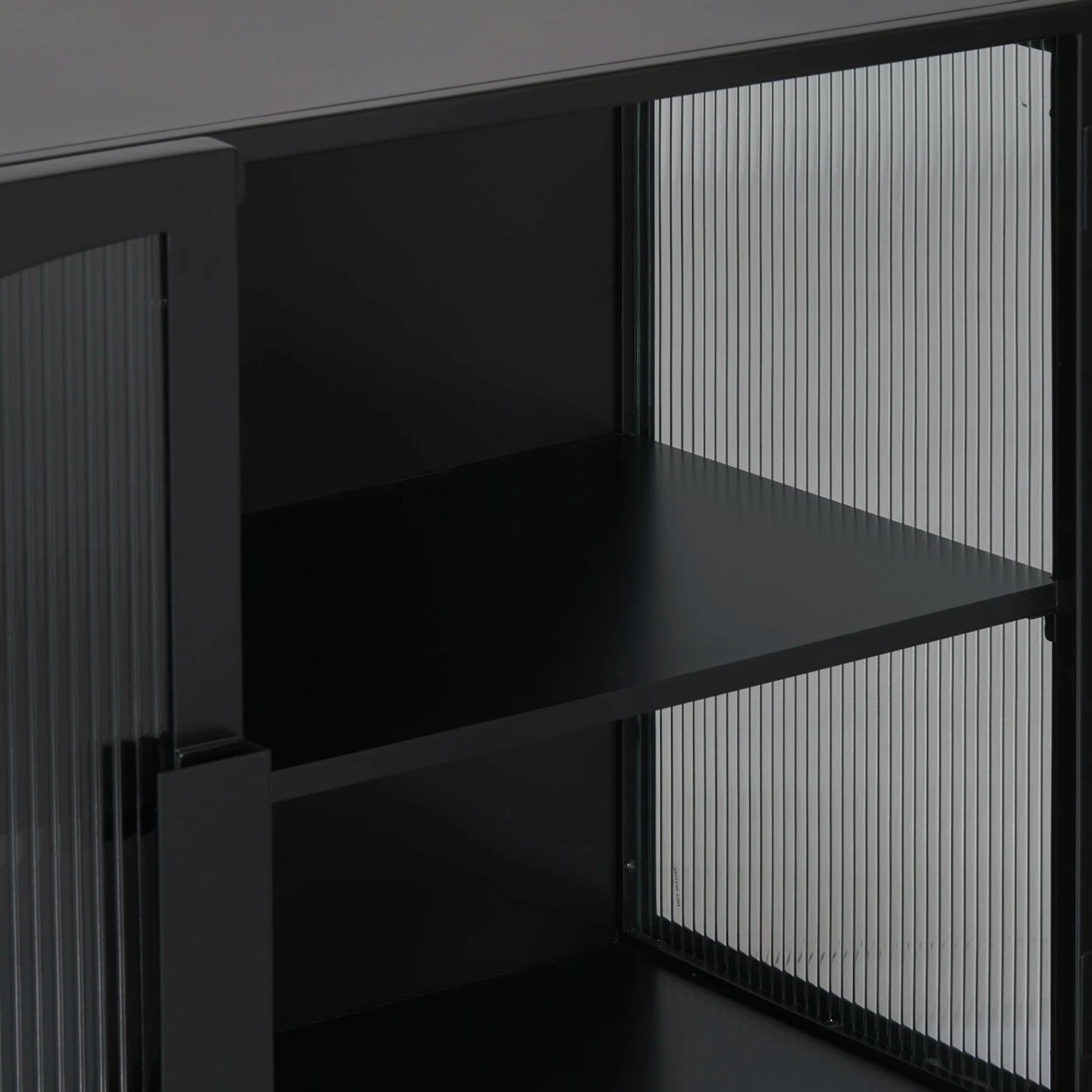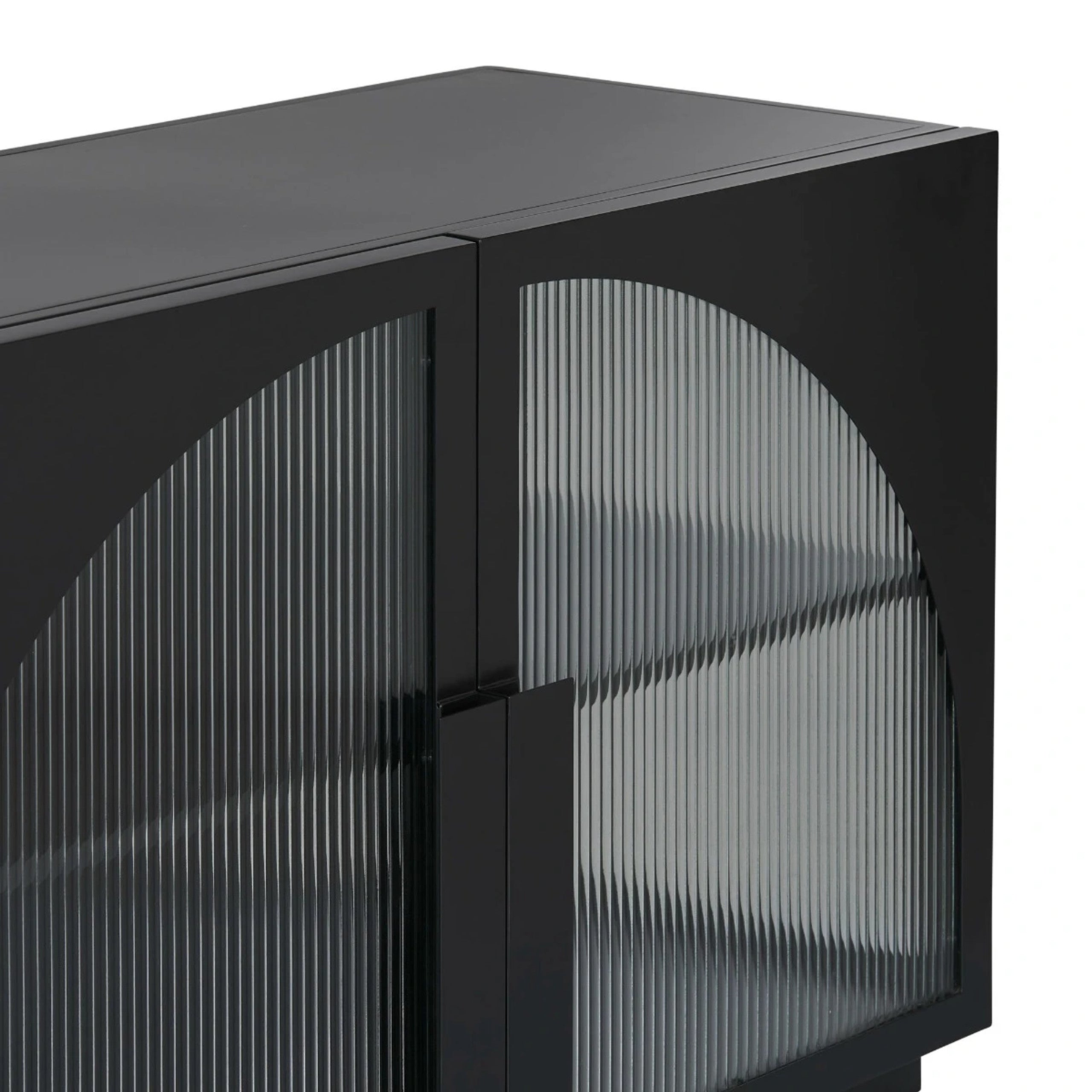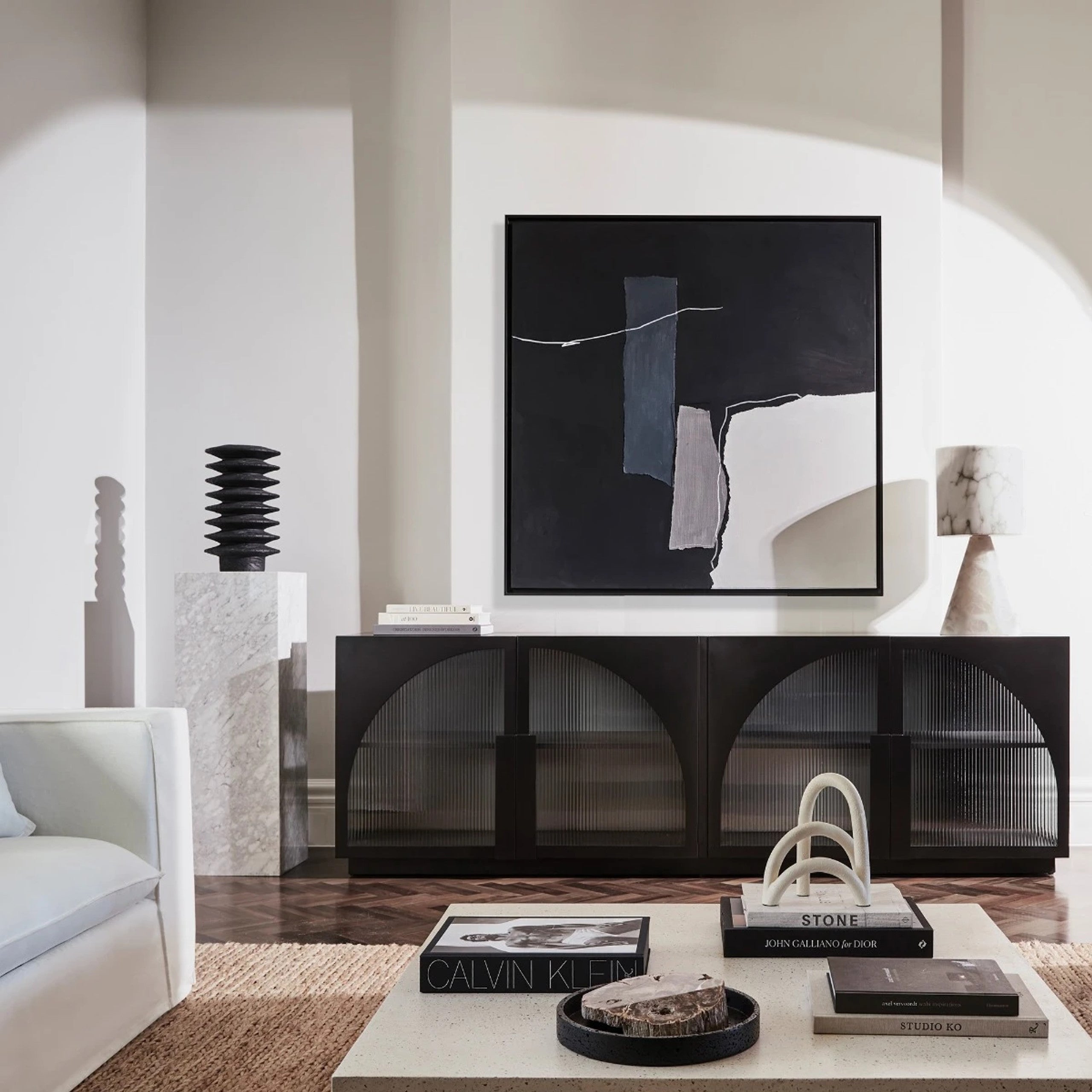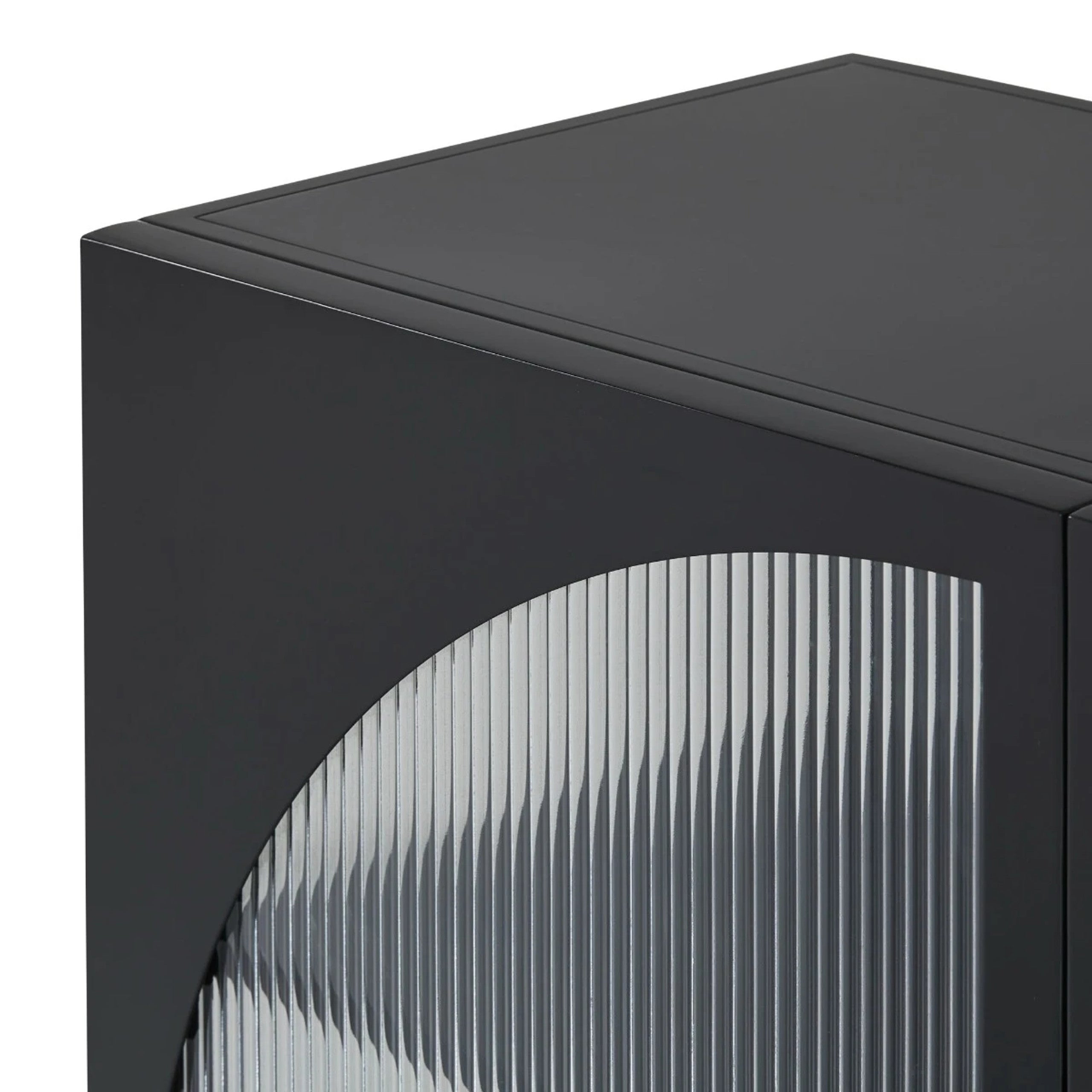Contemporary steel frame entertainment unit with fluted glass.|Referencing french romanesque architecture with its distinctive round arches and strong angles the Isabella desk makes an impressive statement with its matt black steel frame and fluted glass.