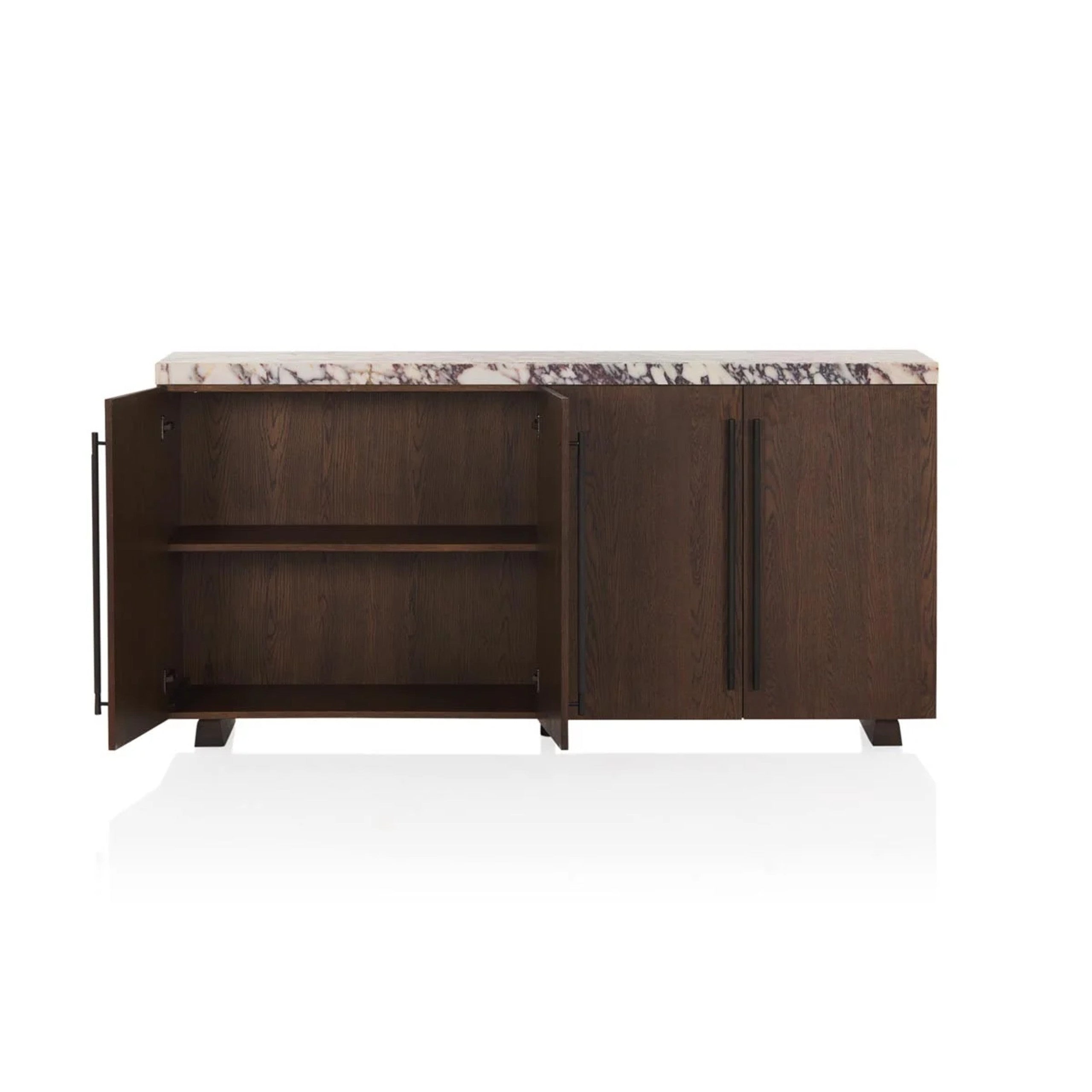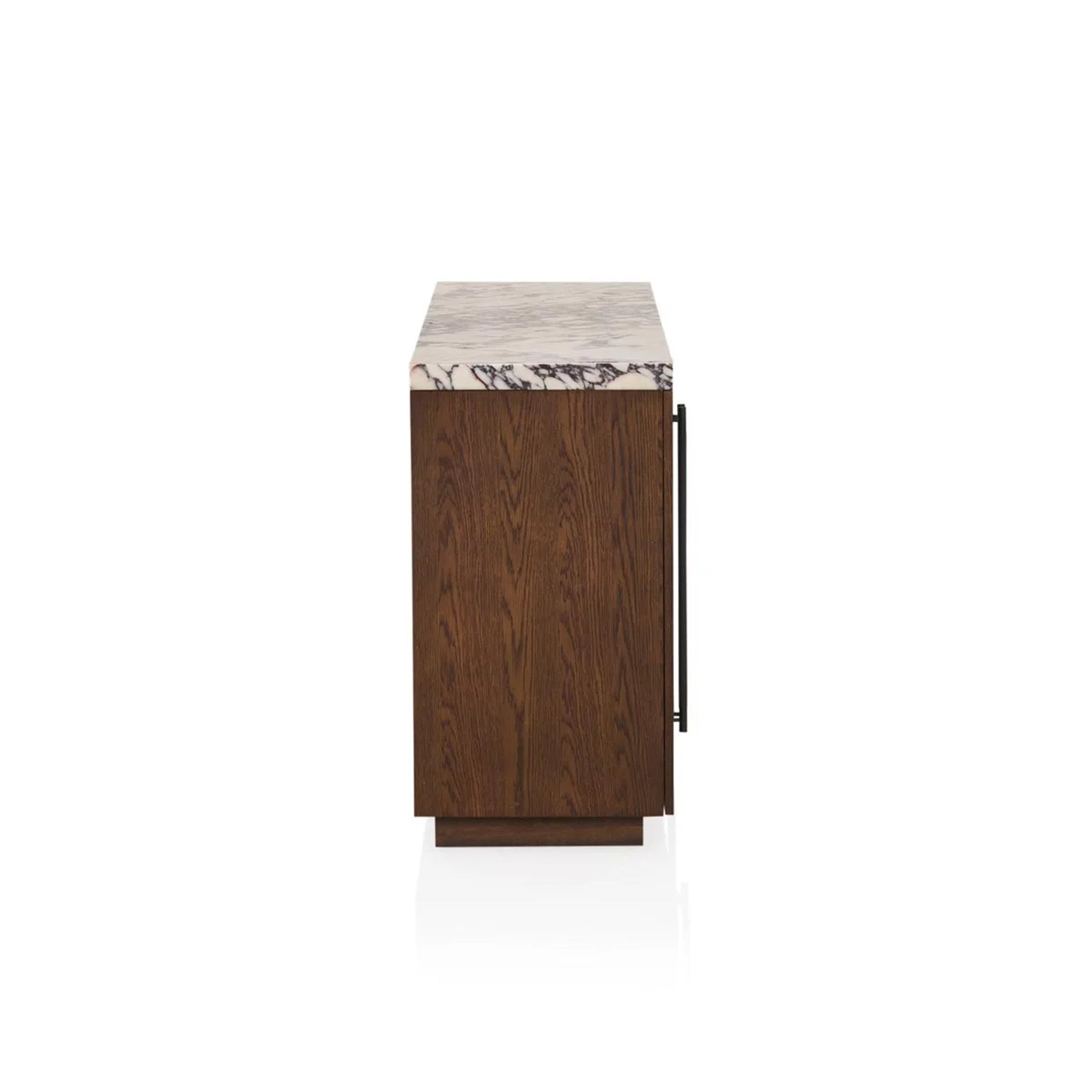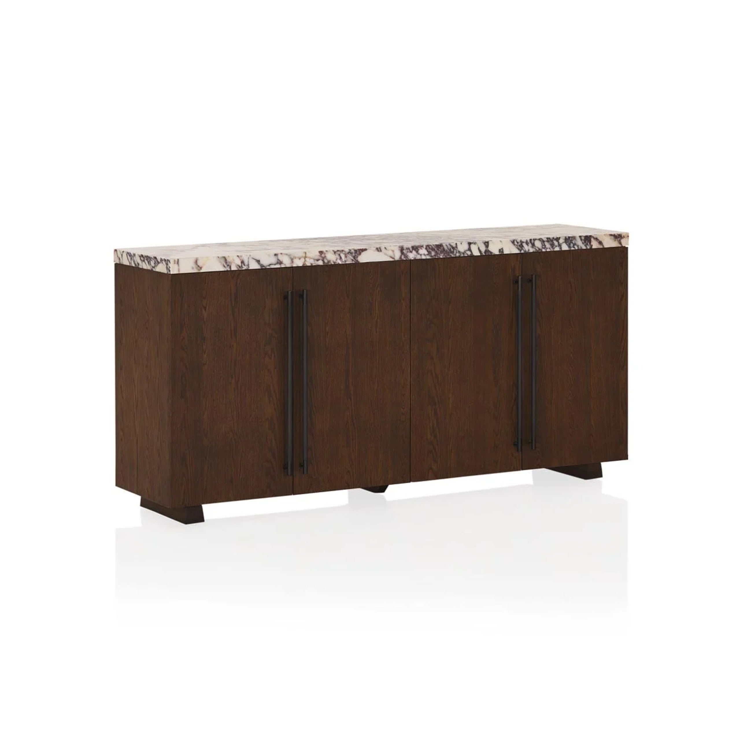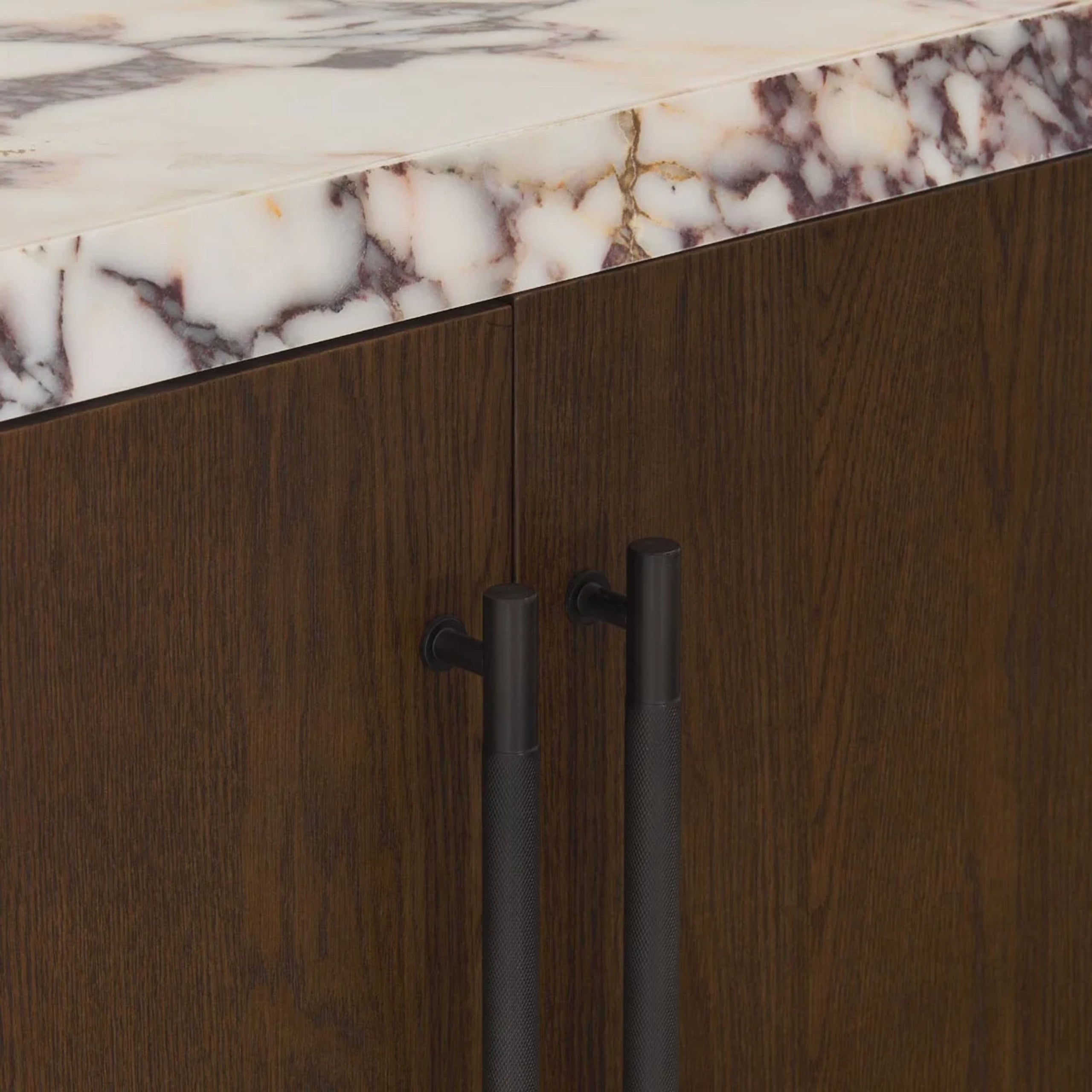 An eye-catching statement sideboard that combines luxurious materials.|The Khodier Sideboard captures the spotlight with its exceptional aesthetics and blend of materials. It boasts a Calacatta Viola marble tabletop resting on a frame crafted from a blend of solid oak and plywood adorned with an oak veneer. The handles featuring a bronze knurling effect with a diamond pattern are crafted from stainless steel. Not only aesthetically captivating but highly practical featuring ample storage space. Marble is a natural material and Coco Republic advises that distinctive variations in veining markings and colours can be expected as standard and do not compromise the integrity of the stone. Each piece is one-of-a-kind.