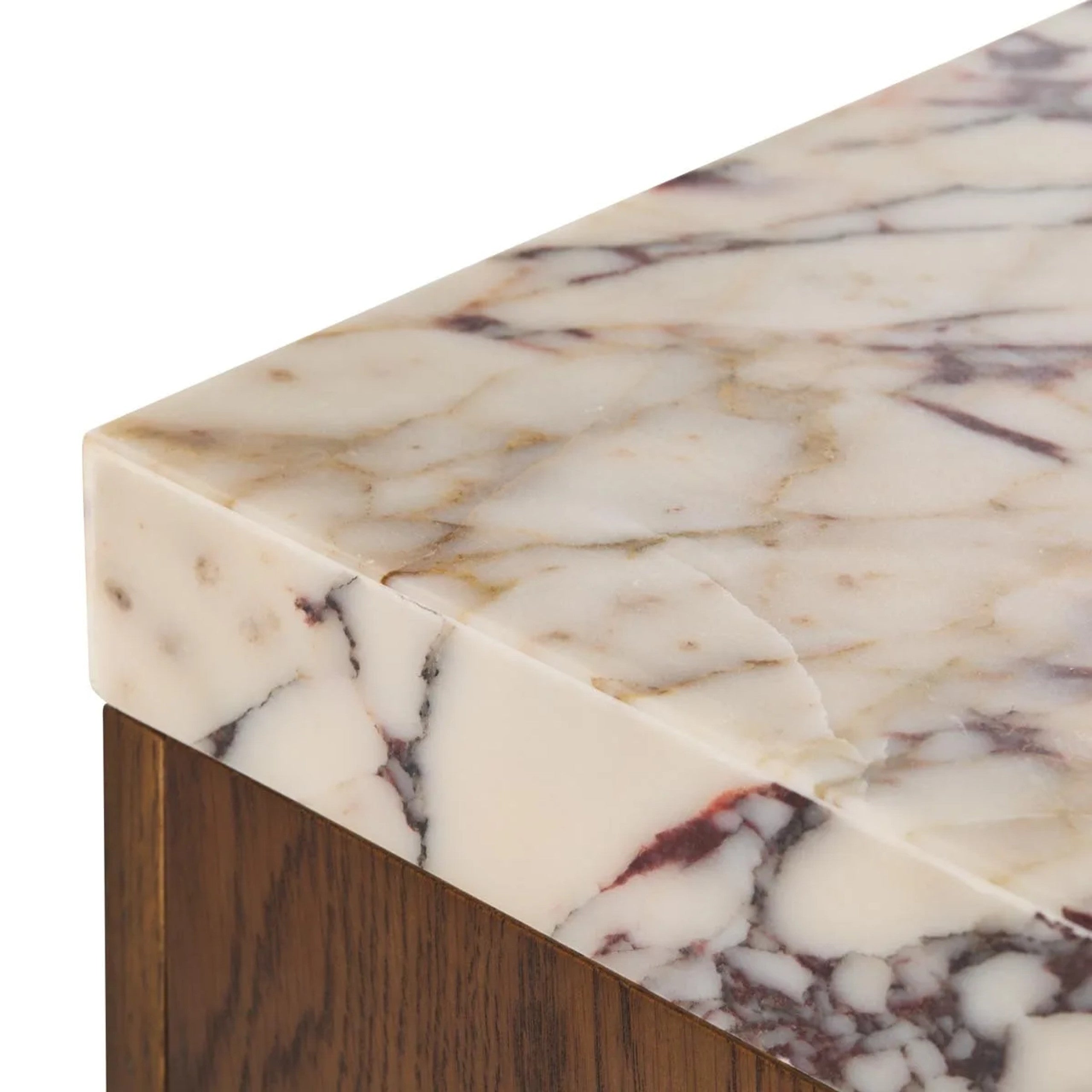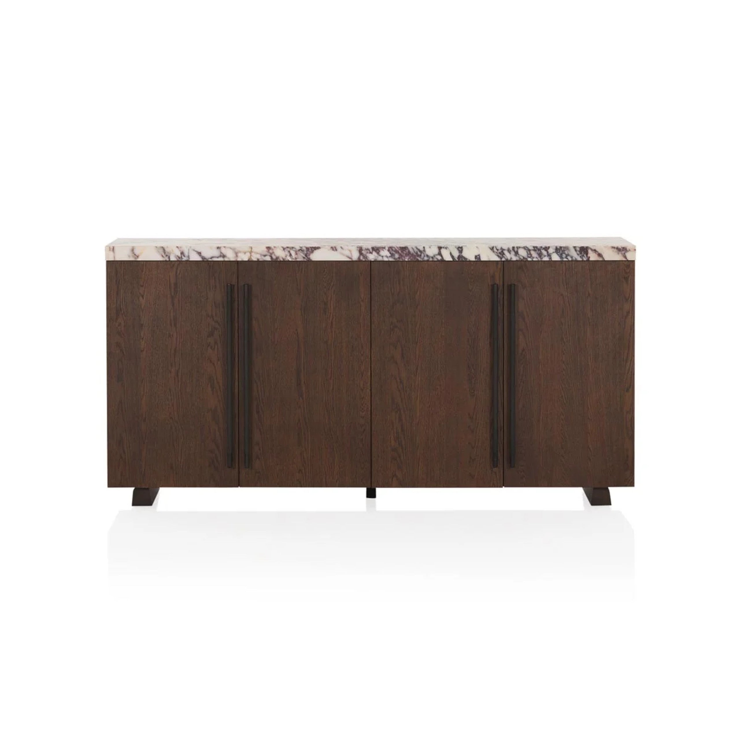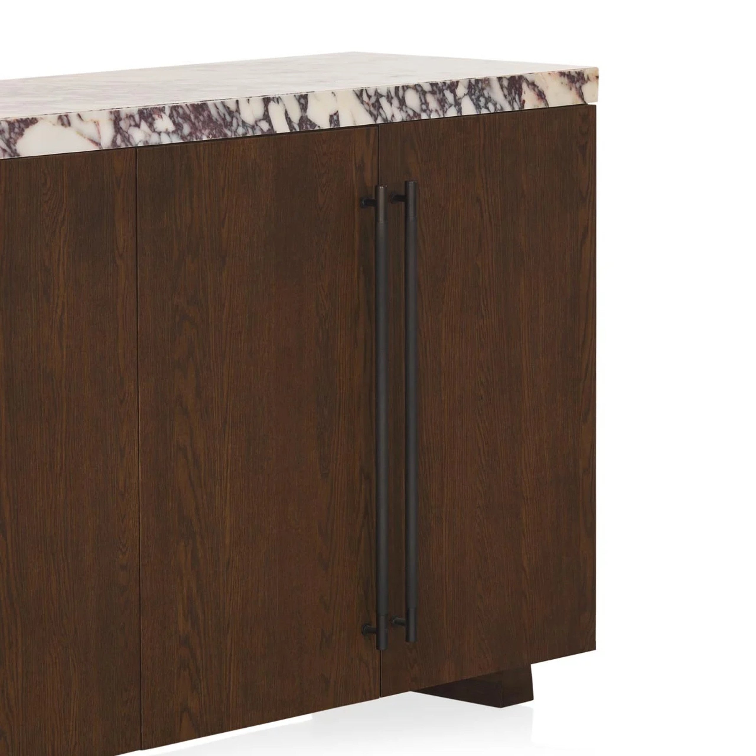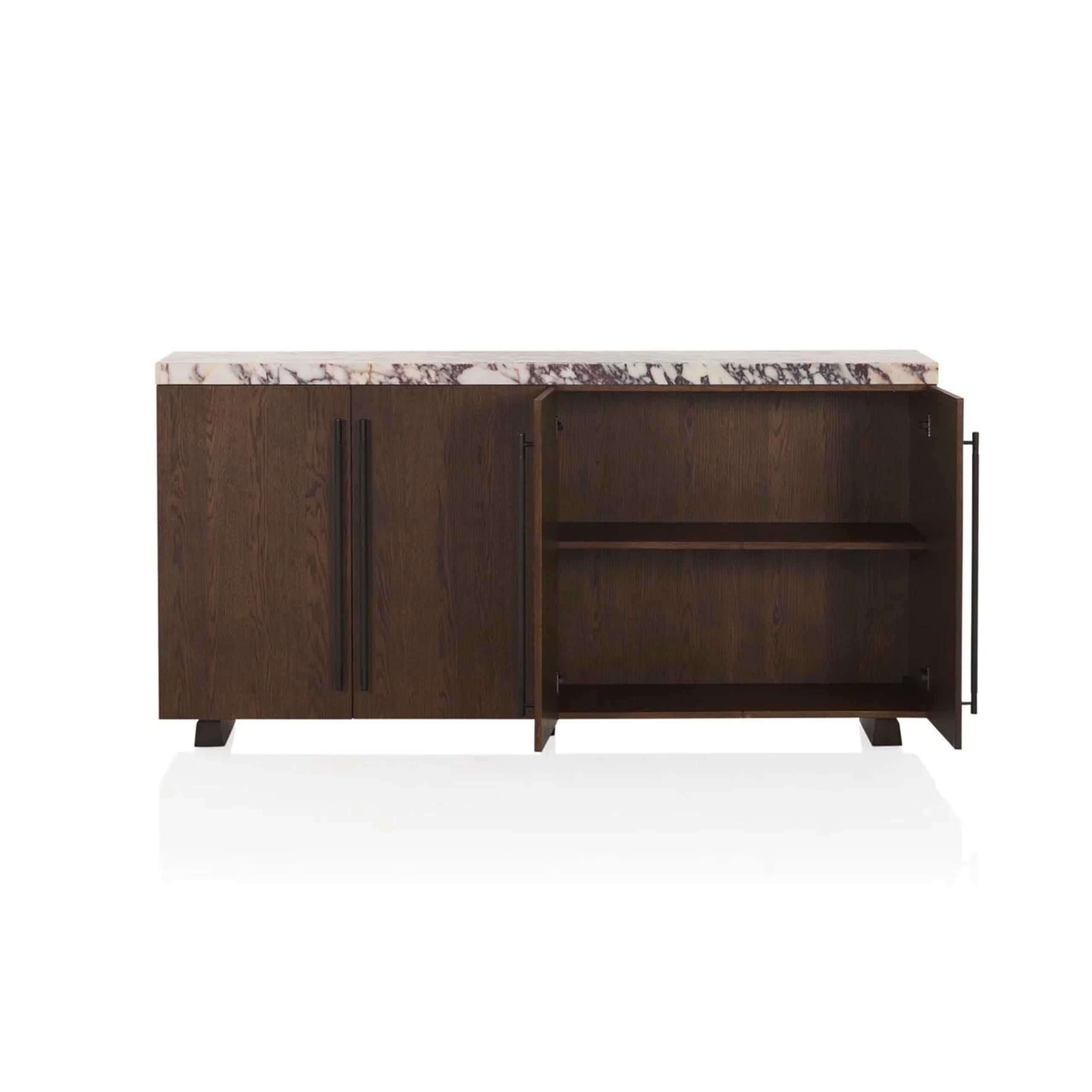 An eye-catching statement sideboard that combines luxurious materials.|The Khodier Sideboard captures the spotlight with its exceptional aesthetics and blend of materials. It boasts a Calacatta Viola marble tabletop resting on a frame crafted from a blend of solid oak and plywood adorned with an oak veneer. The handles featuring a bronze knurling effect with a diamond pattern are crafted from stainless steel. Not only aesthetically captivating but highly practical featuring ample storage space. Marble is a natural material and Coco Republic advises that distinctive variations in veining markings and colours can be expected as standard and do not compromise the integrity of the stone. Each piece is one-of-a-kind.