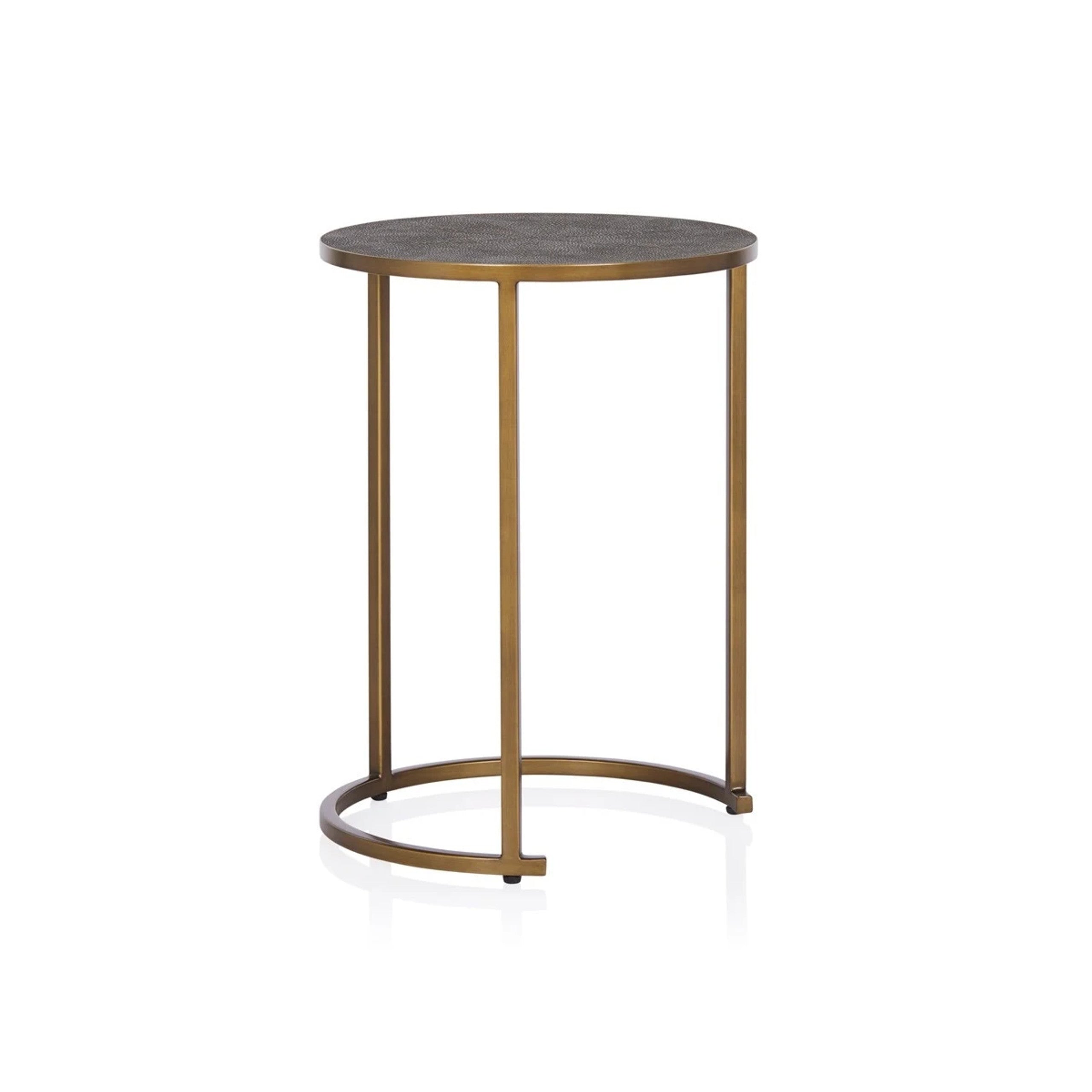 Sophisticated desk for the refined interior finished in a luxe combination of faux shagreen and polished stainless steel.|The Knox Nesting Side Tables are the perfect piece for adding a touch of glamour and function to your living room. The open and minimal design offer versatility while celebrating luxe materials. Featuring a diminutive metal frame with slender silhouette finished in antique brass accented by faux shagreen it is sure to amp the glam factor in any room. Sold together as a pair.