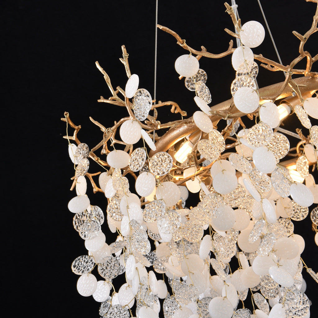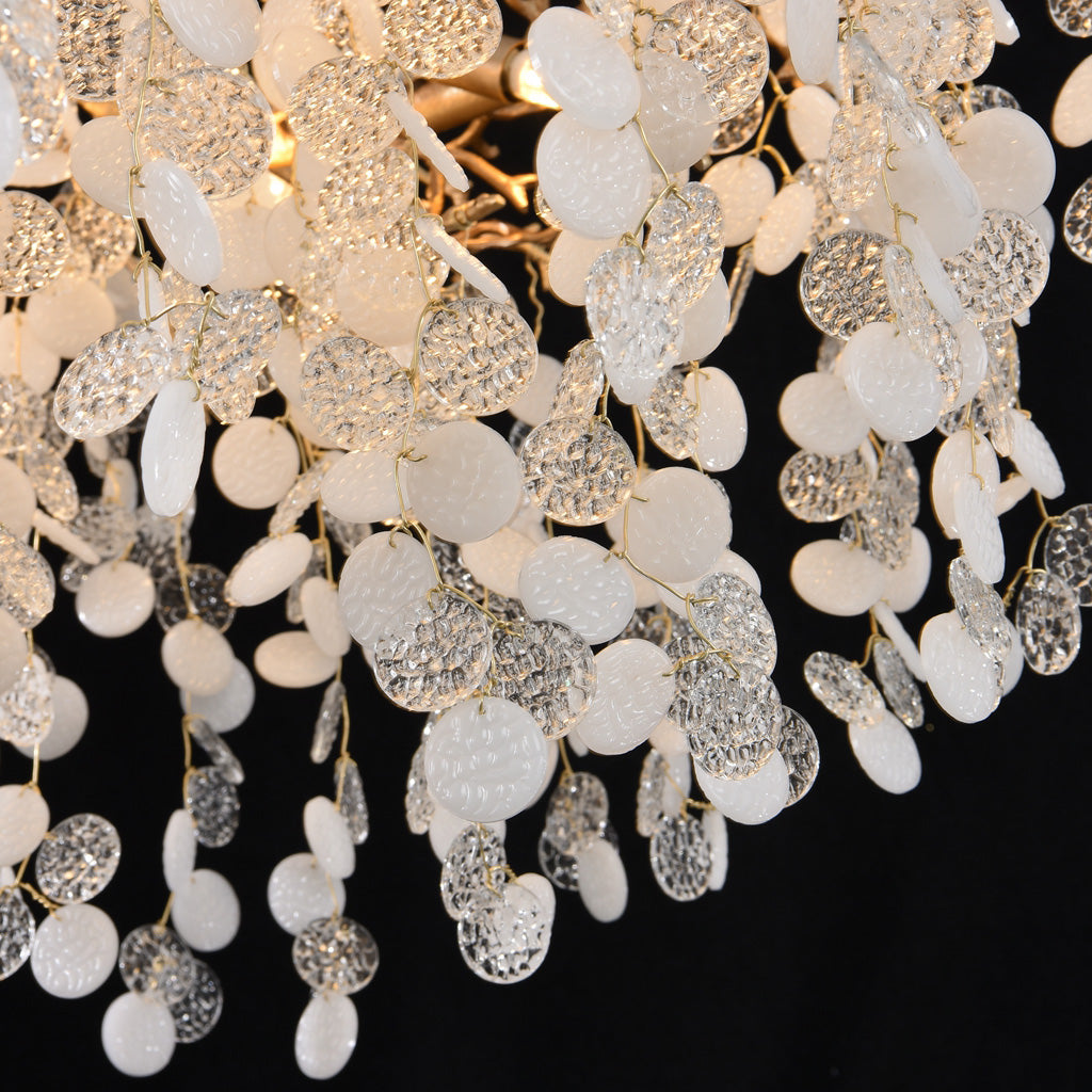 Introducing the Krisanna Blossom Modern White Chandelier adorned with clear glass wafers, meticulously crafted from brass material and coin-shaped round glass. Hand-shaped branches, mixed with white and clear glass wafers, create a captivating design. With dimensions of D 23.6 in x H 9.8 in, this chandelier promises to radiate brilliance wherever it's placed.