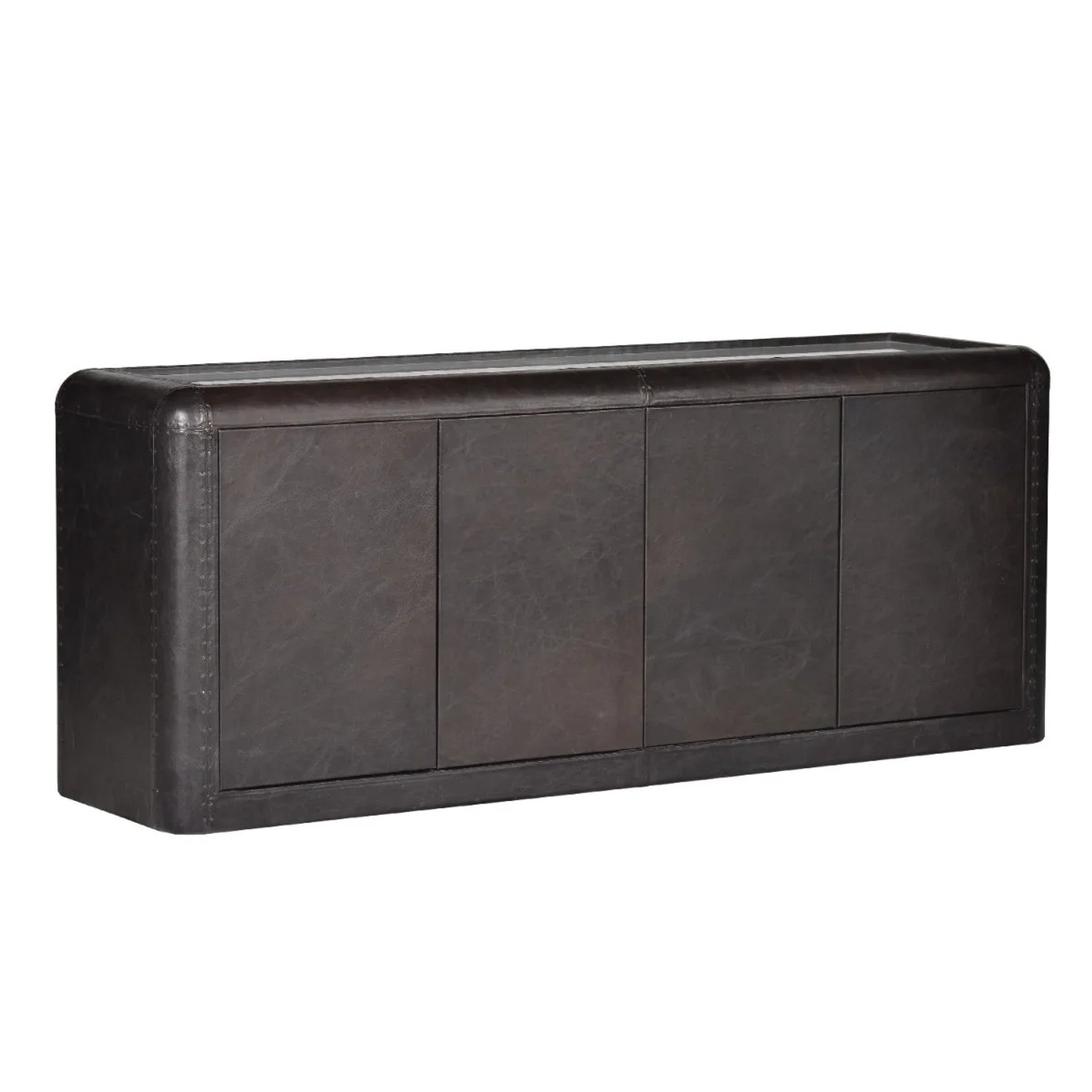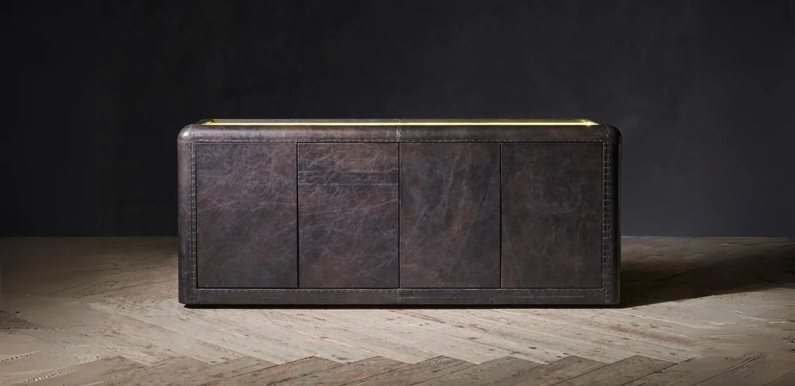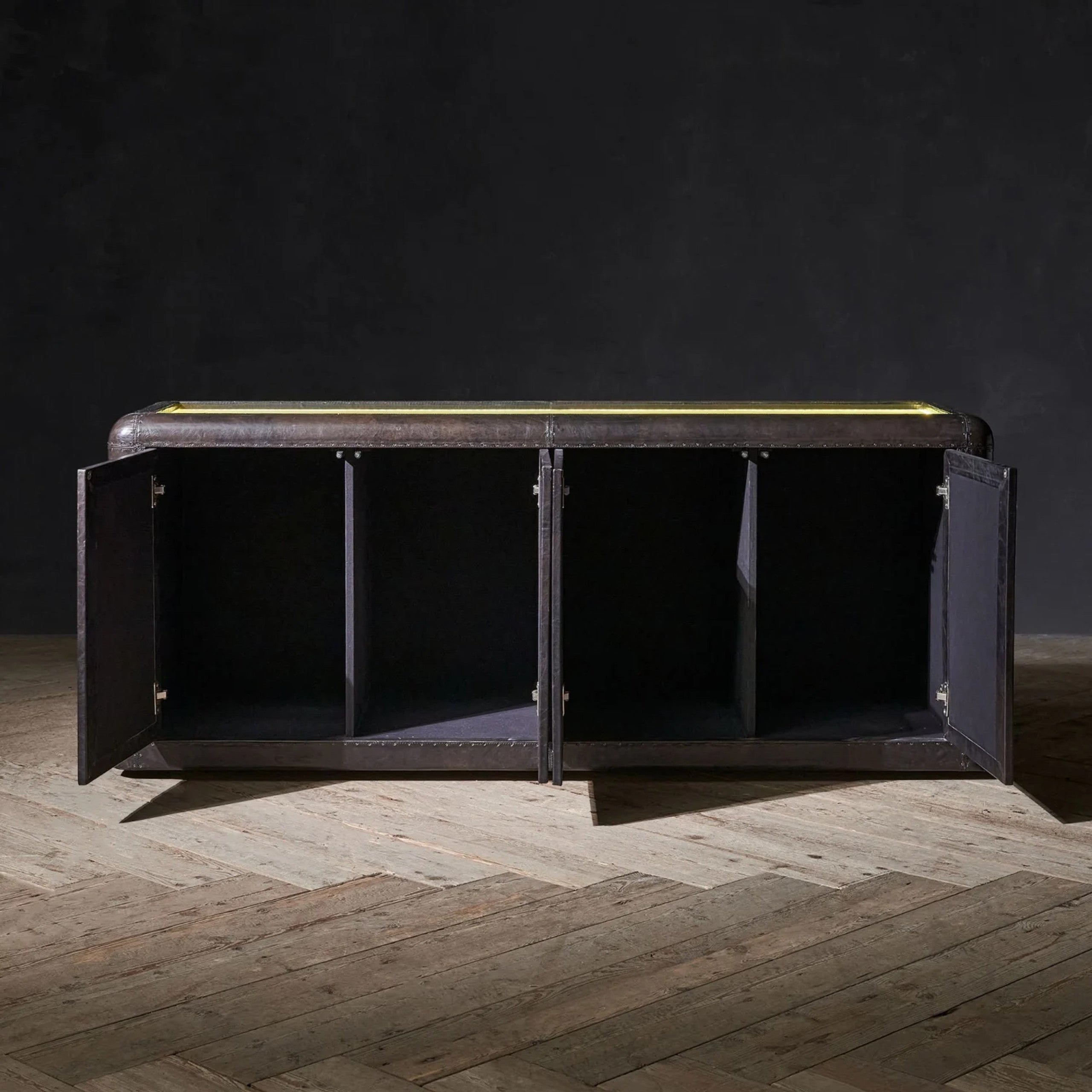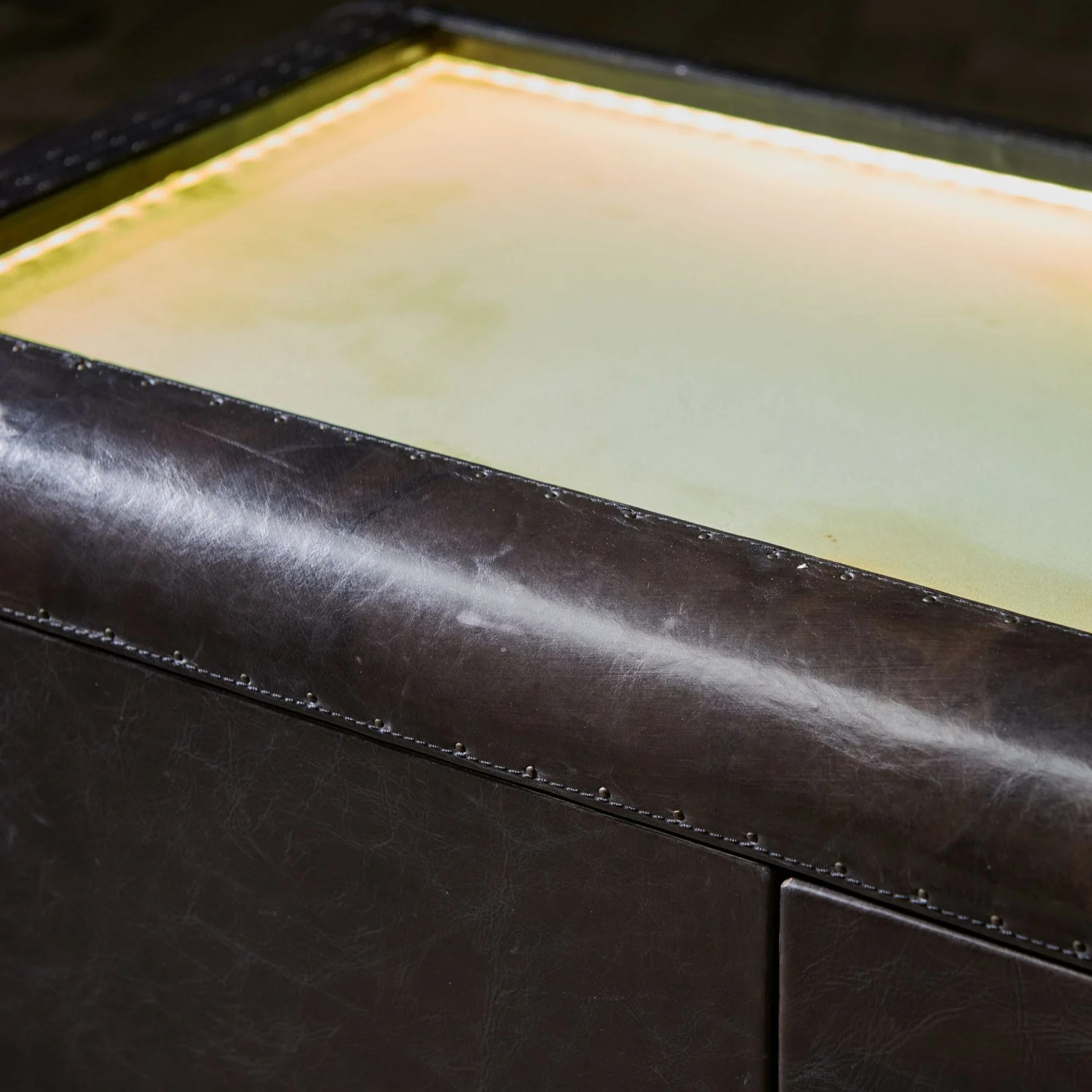 A streamlined console wrapped in lustrous old saddle black leather.|This elegant console is handcrafted in rich and lustrous Old Saddle Black leather. Sleek and streamlined it features push opening doors to four spacious interior compartments and a softly lit glass top to showcase your favourite display items in dramatic style.
