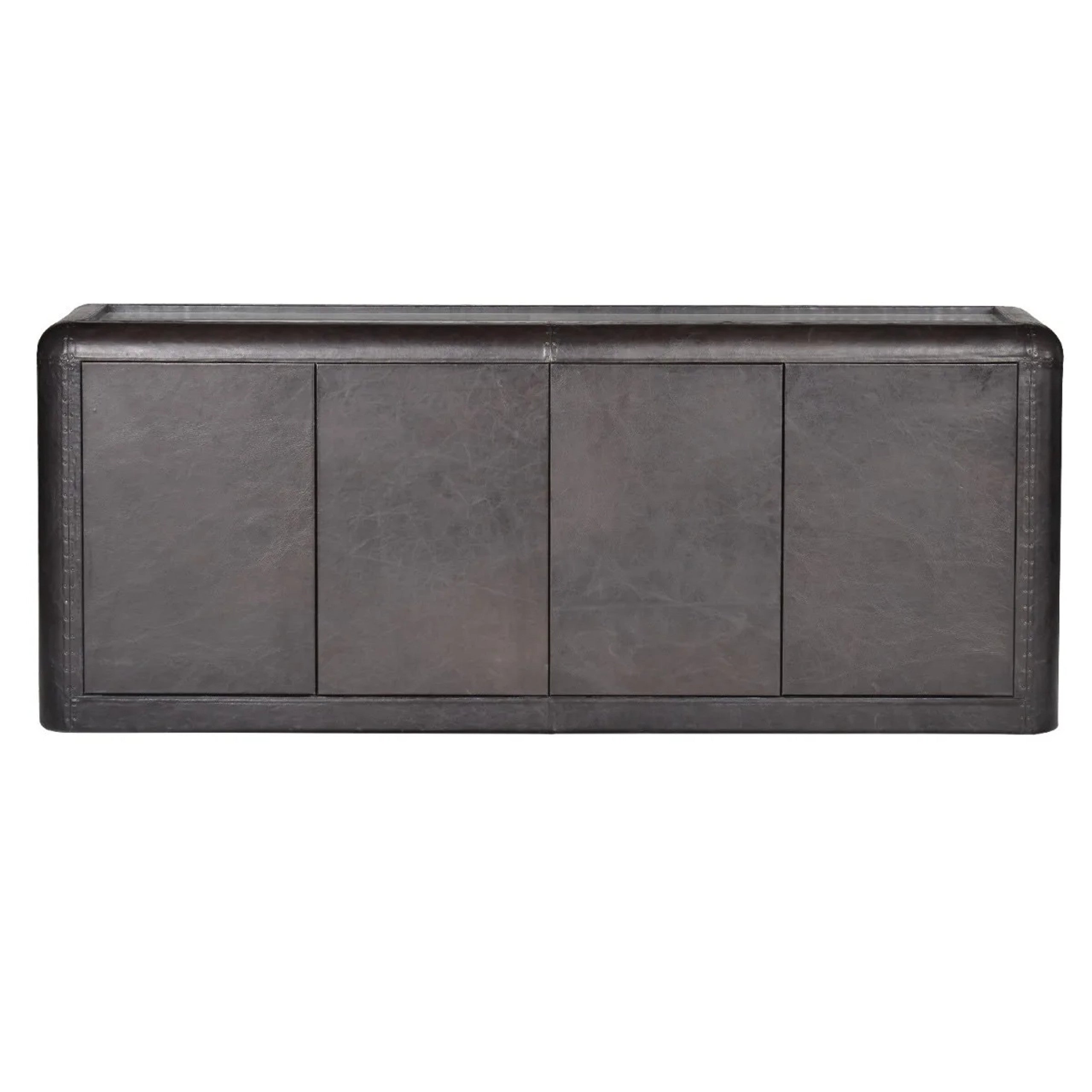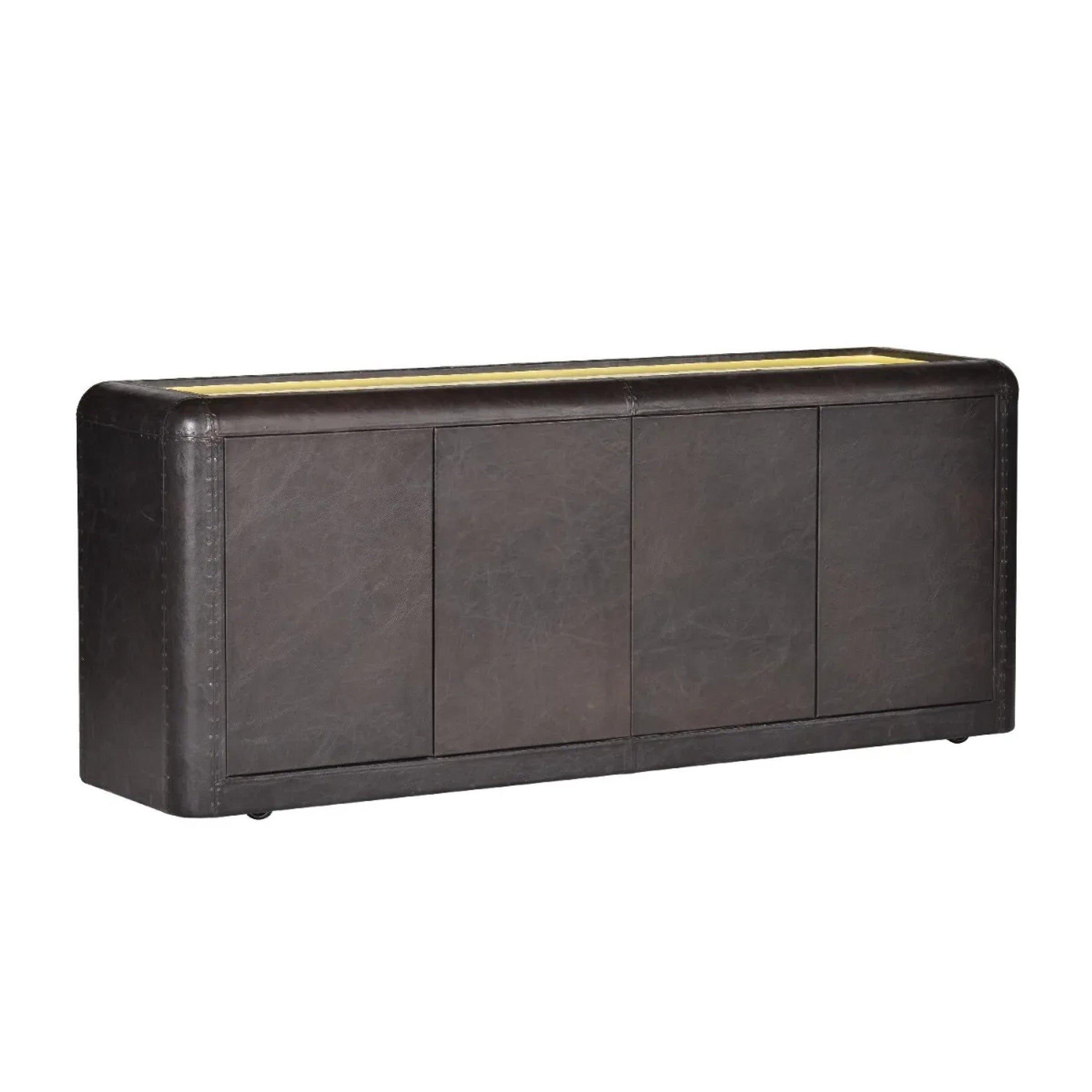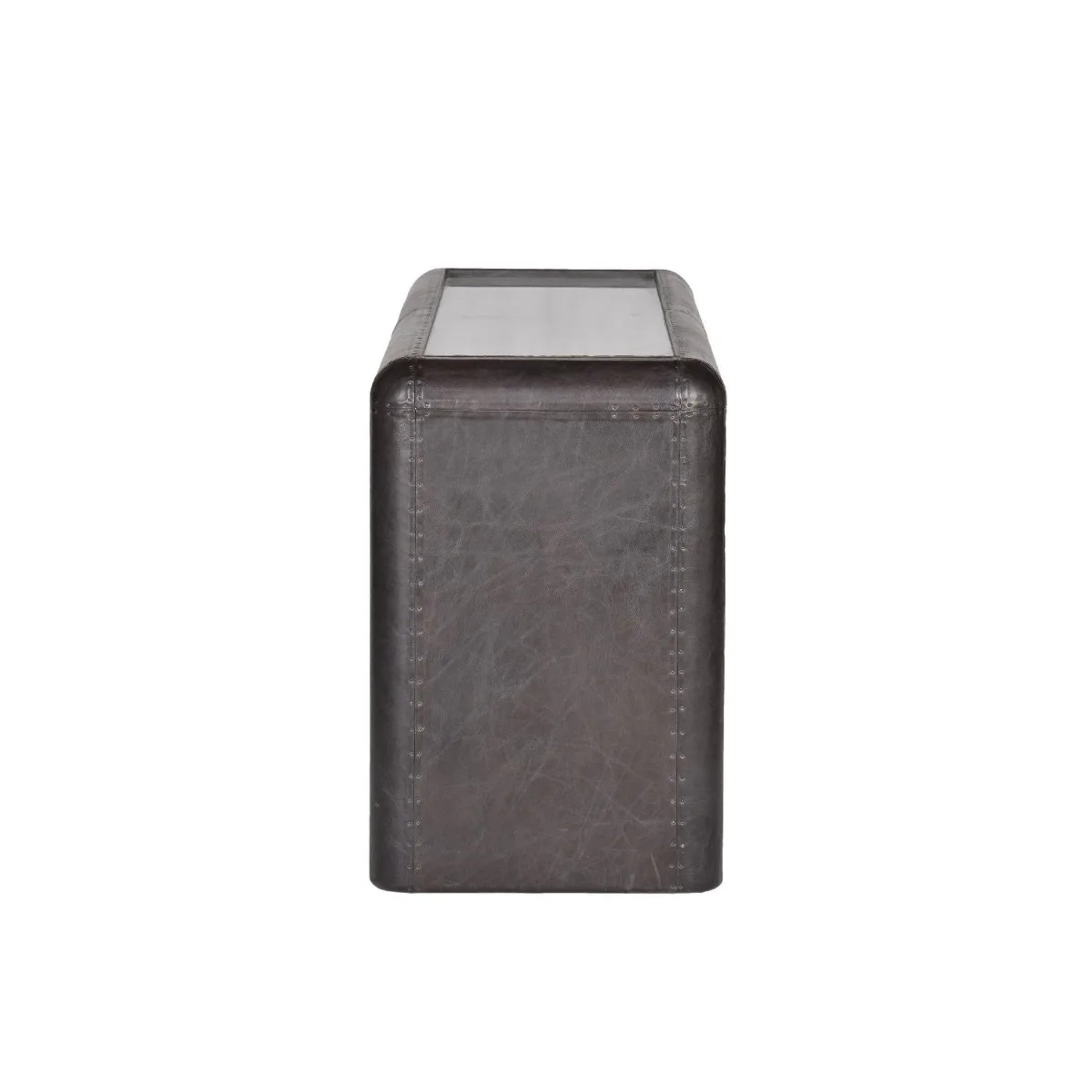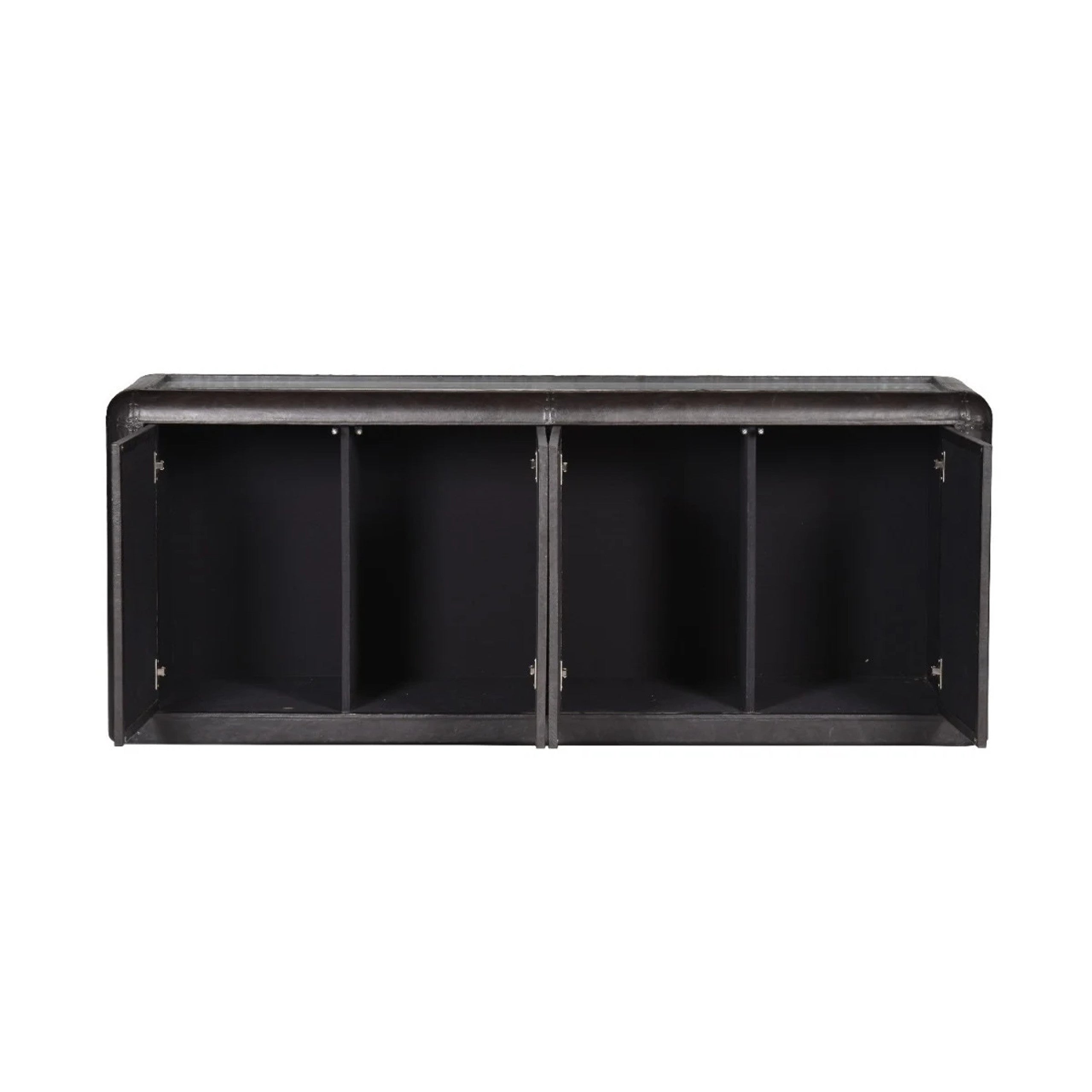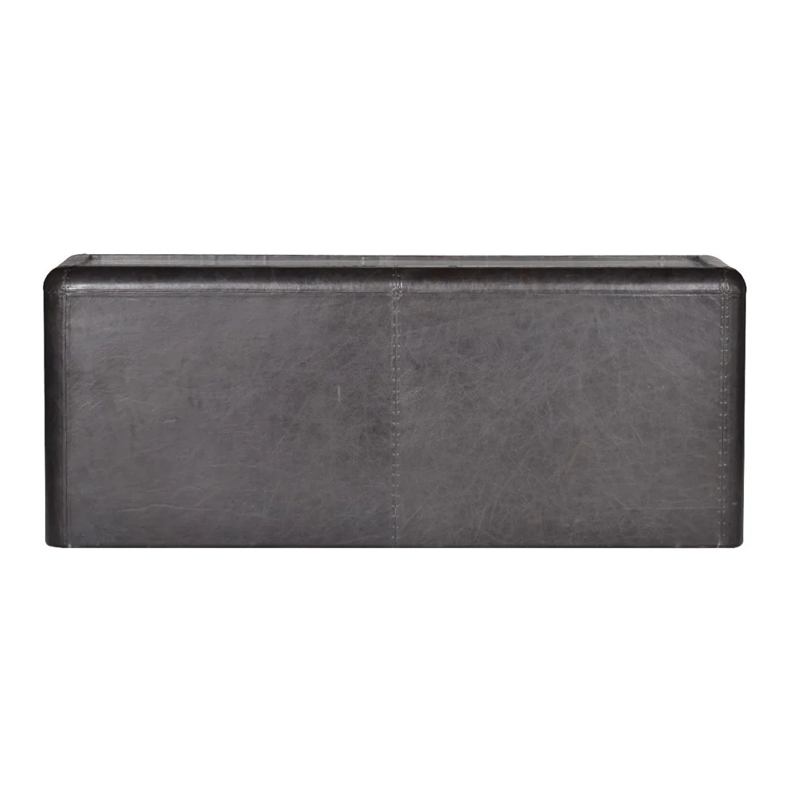 A streamlined console wrapped in lustrous old saddle black leather.|This elegant console is handcrafted in rich and lustrous Old Saddle Black leather. Sleek and streamlined it features push opening doors to four spacious interior compartments and a softly lit glass top to showcase your favourite display items in dramatic style.