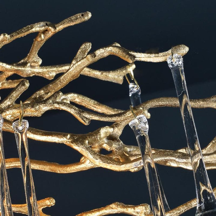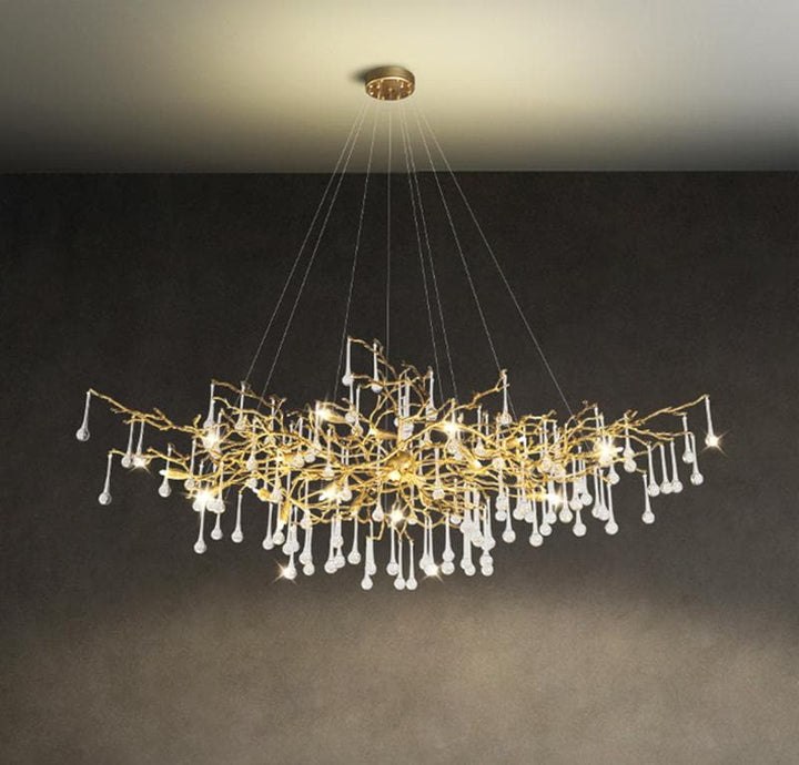 The Luxury Oval Brass Branch Chandelier, featuring clear water drop branch design, is crafted from brass and teardrop glass. Inspired by the imagery of organic trees in the rain with raindrops, this chandelier brings a touch of nature into your home. The unique and elegant design is hand-forged into beautifully intricate tree branches, creating a stunning and distinctive centerpiece for your living space.
