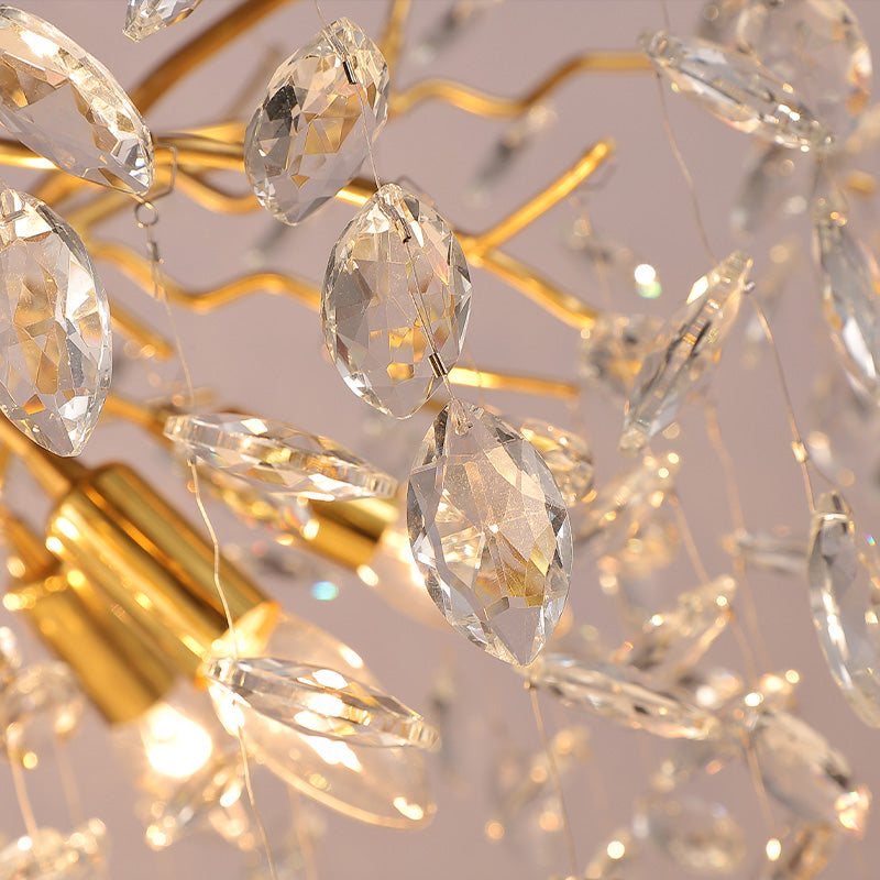 This contemporary luxury raindrop crystal chandelier lighting ceiling fixture showcases a beautiful gold finish on tree branches paired with stunning clear crystals. The design is pure, romantic, and shines like diamonds, bringing an organic modern look to your home. This spectacular statement piece is sure to elicit a "wow" reaction, adding a touch of luxury and elegance to any space.