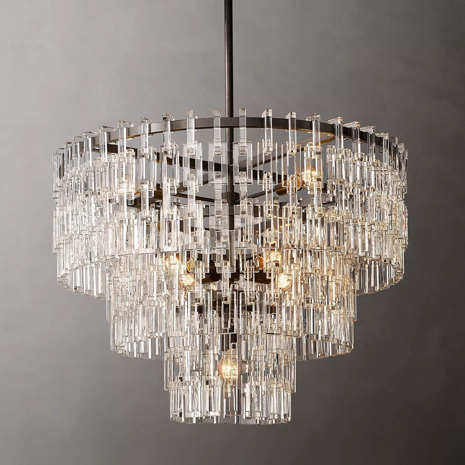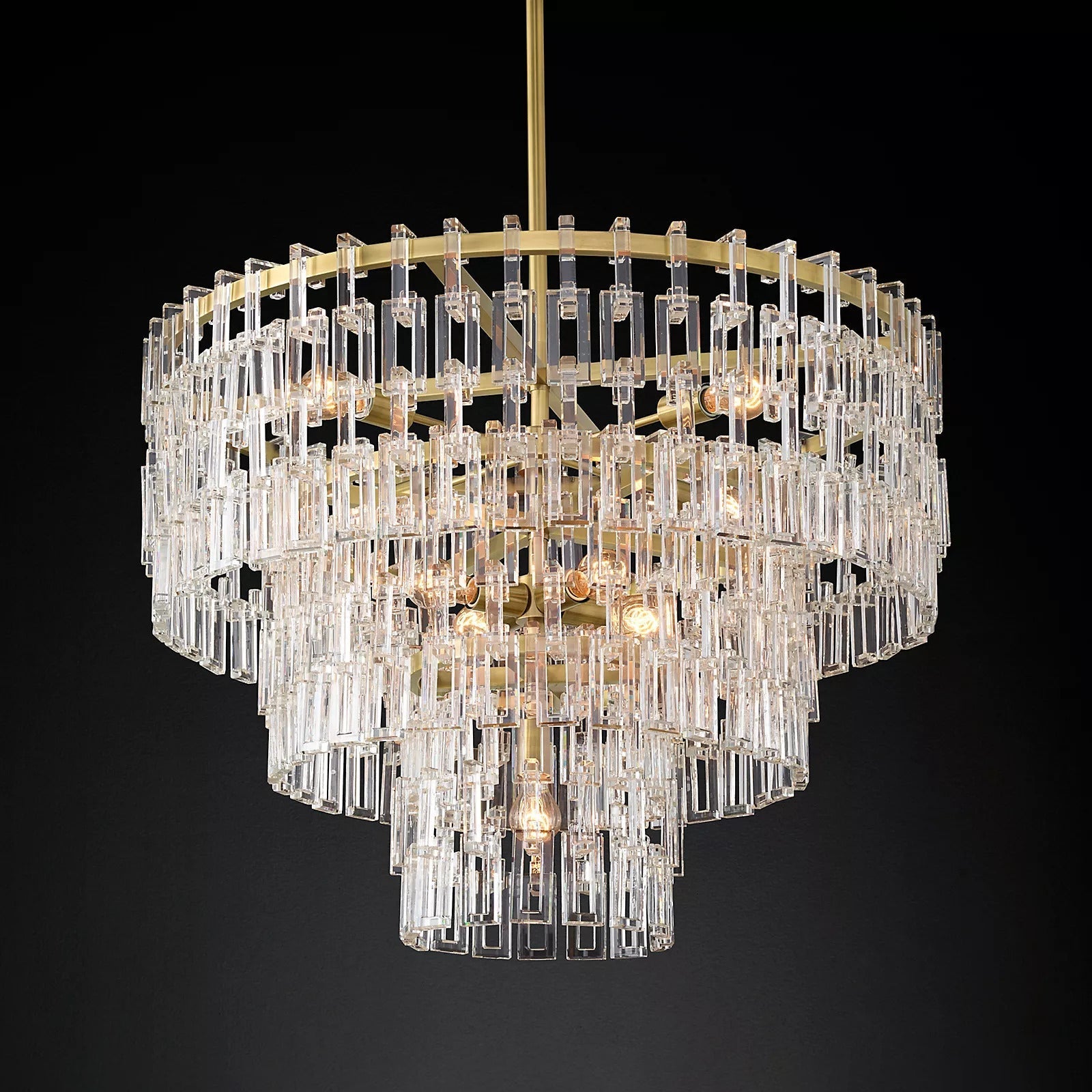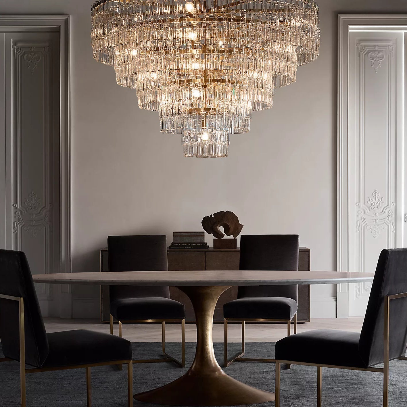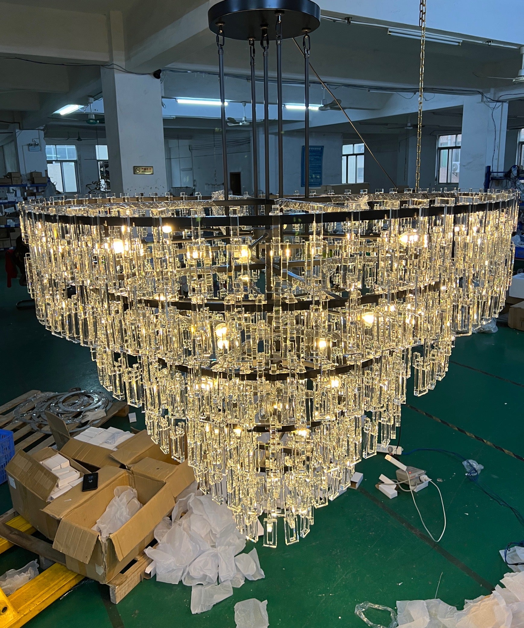 The chandelier is made of sand cast brass and K9 glass, a crystal used to make optical lenses and prisms. Connected with the O-shaped crystal. Inspired by industrial metal chains, it reimagines staggered open and closed links with amazing crystal glass. The pure, simple and stylized chain link is made of more than 600 crystals without wire suspension, creating a bright cascade and shining light.