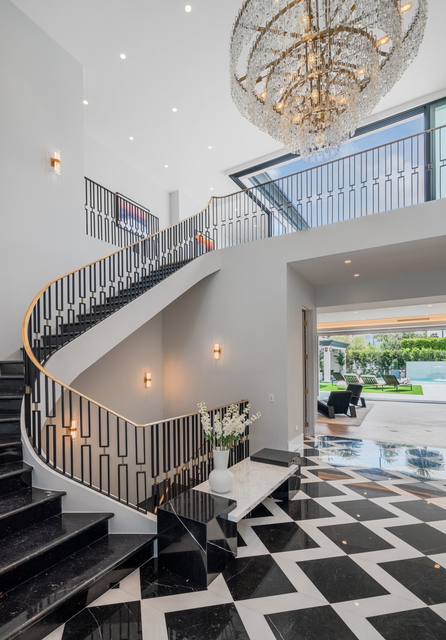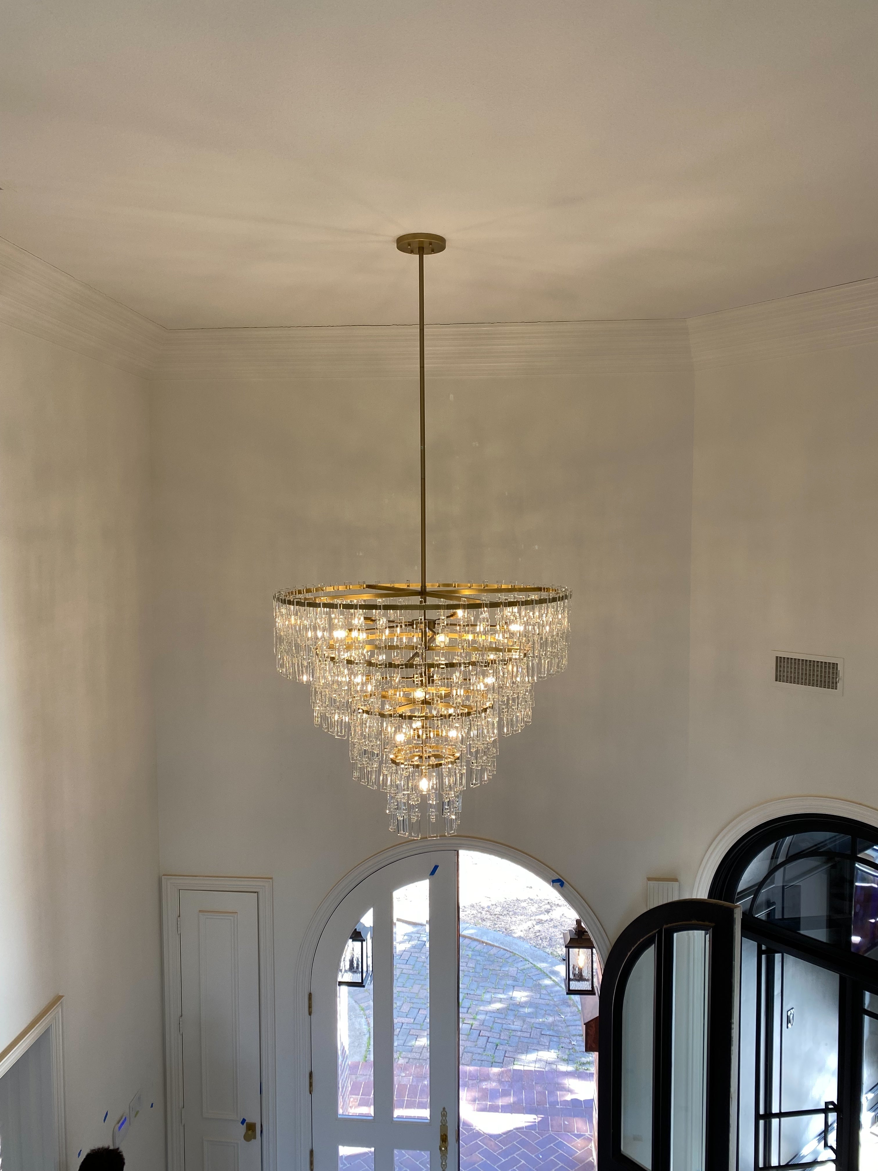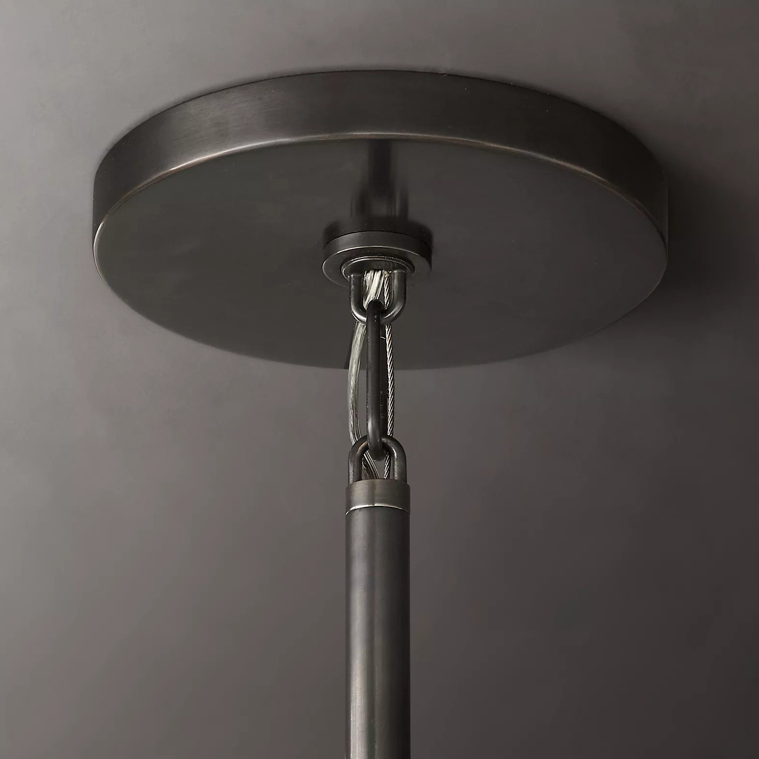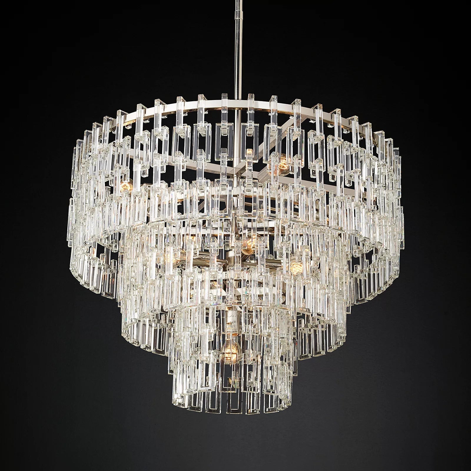 The chandelier is made of sand cast brass and K9 glass, a crystal used to make optical lenses and prisms. Connected with the O-shaped crystal. Inspired by industrial metal chains, it reimagines staggered open and closed links with amazing crystal glass. The pure, simple and stylized chain link is made of more than 600 crystals without wire suspension, creating a bright cascade and shining light.