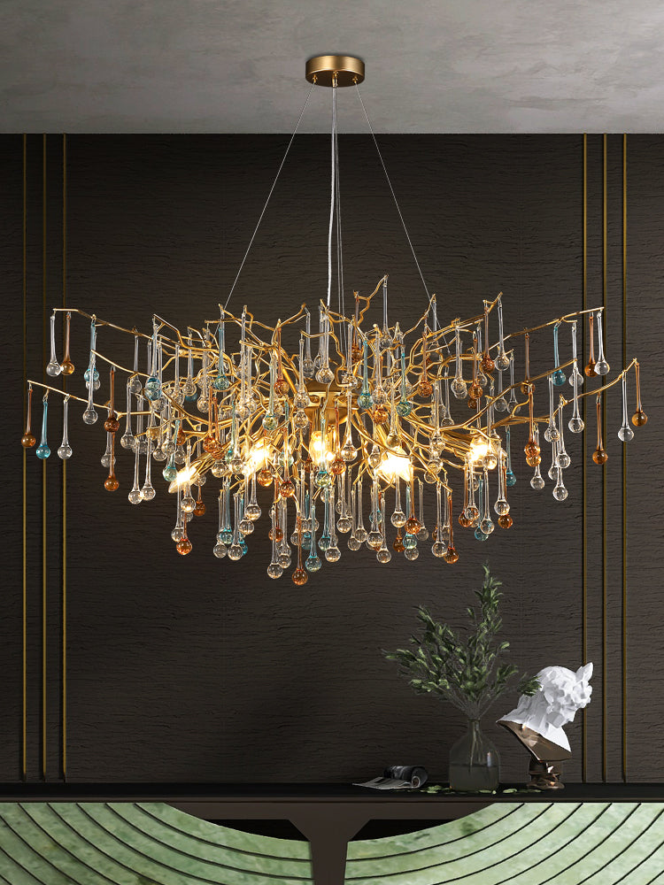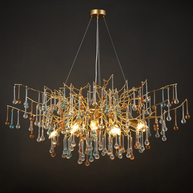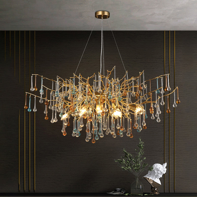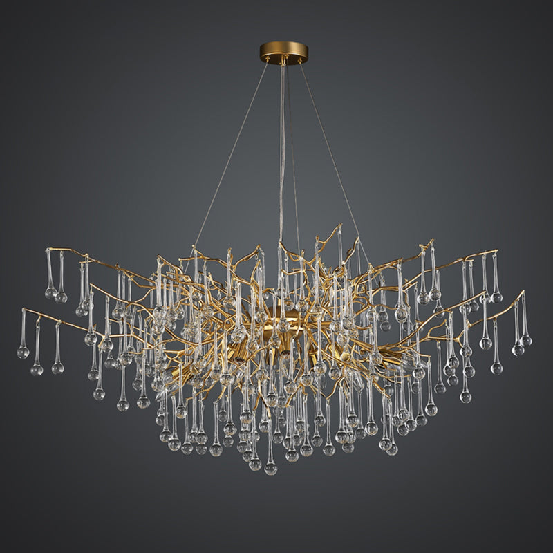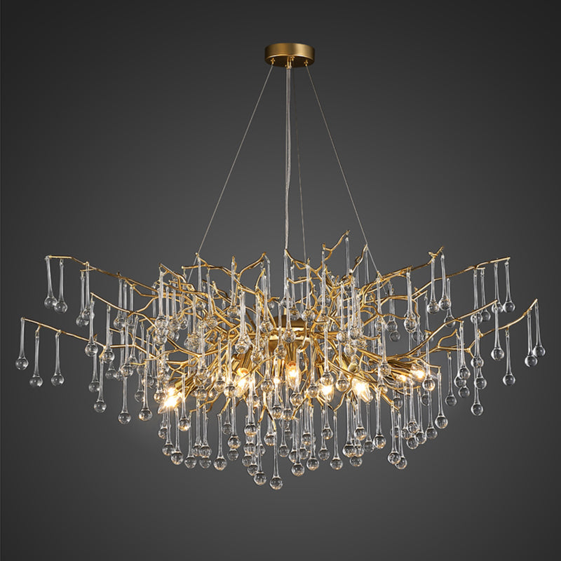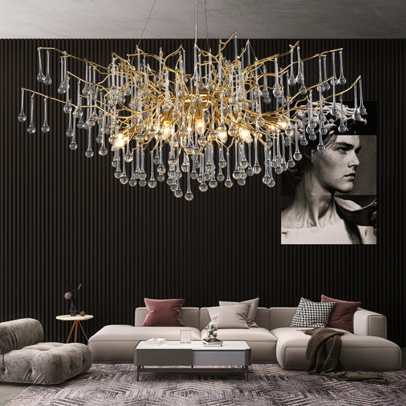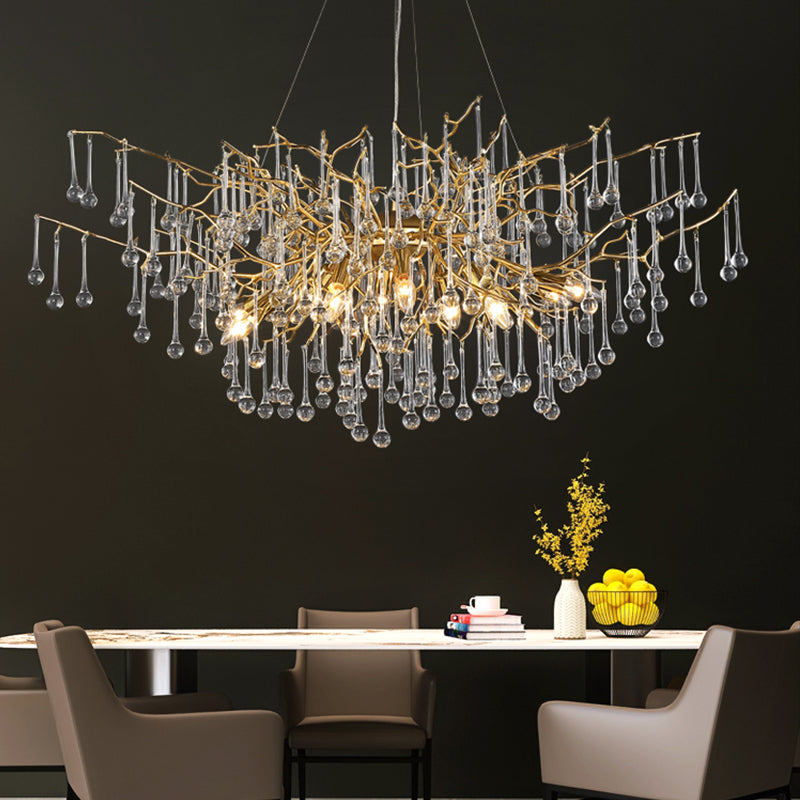 Crystal Branch Chandelier Lighting features a handmade adjustable tree twist branch axis with a silver finish, reminiscent of a glam diamond-style flower forest after a rain. The design exudes a gorgeous and glamorous aesthetic, serving as a wowed artistic centerpiece for any space.