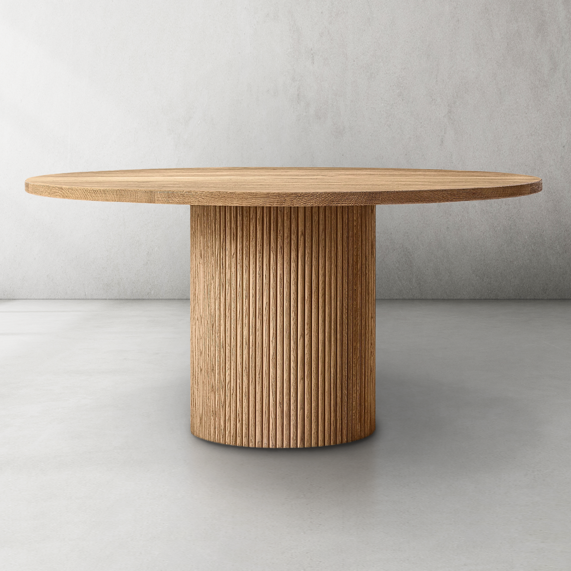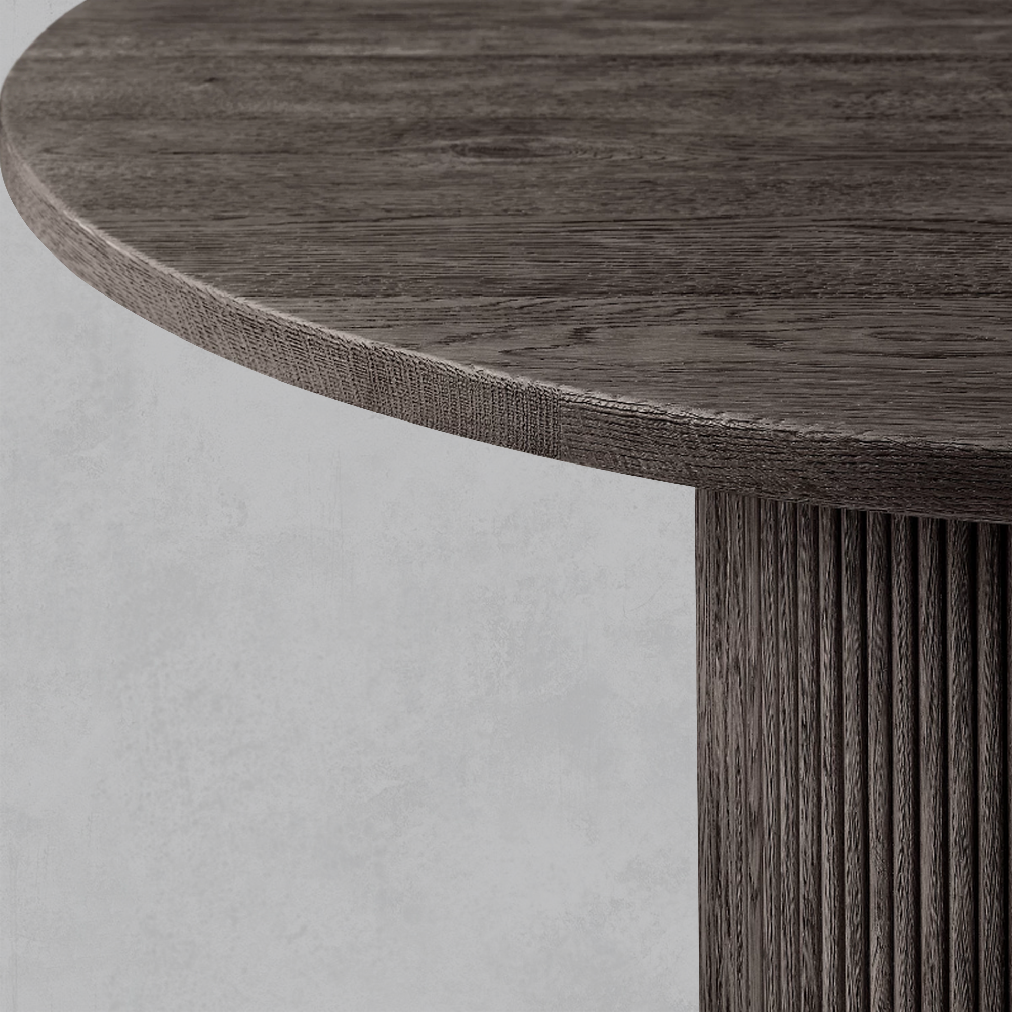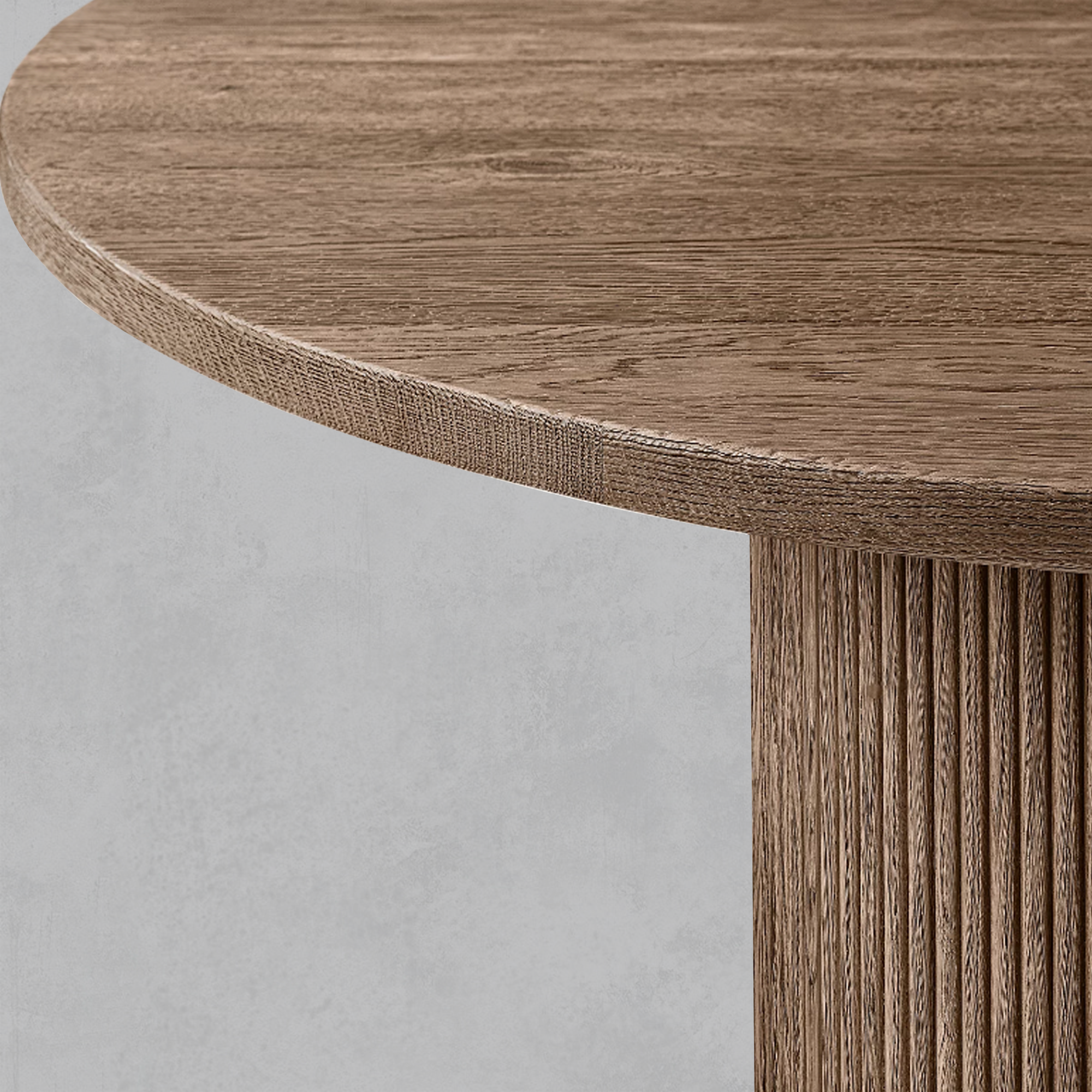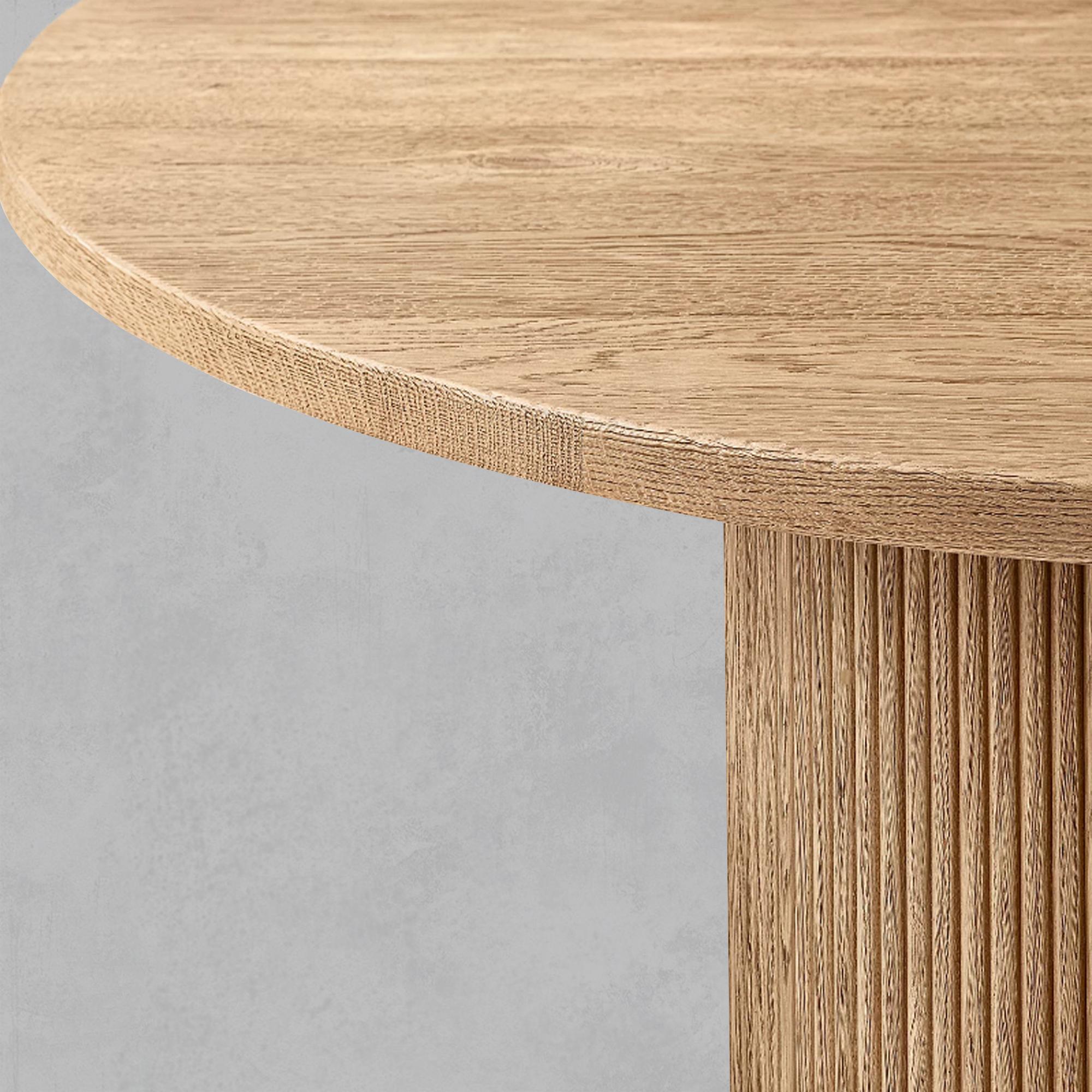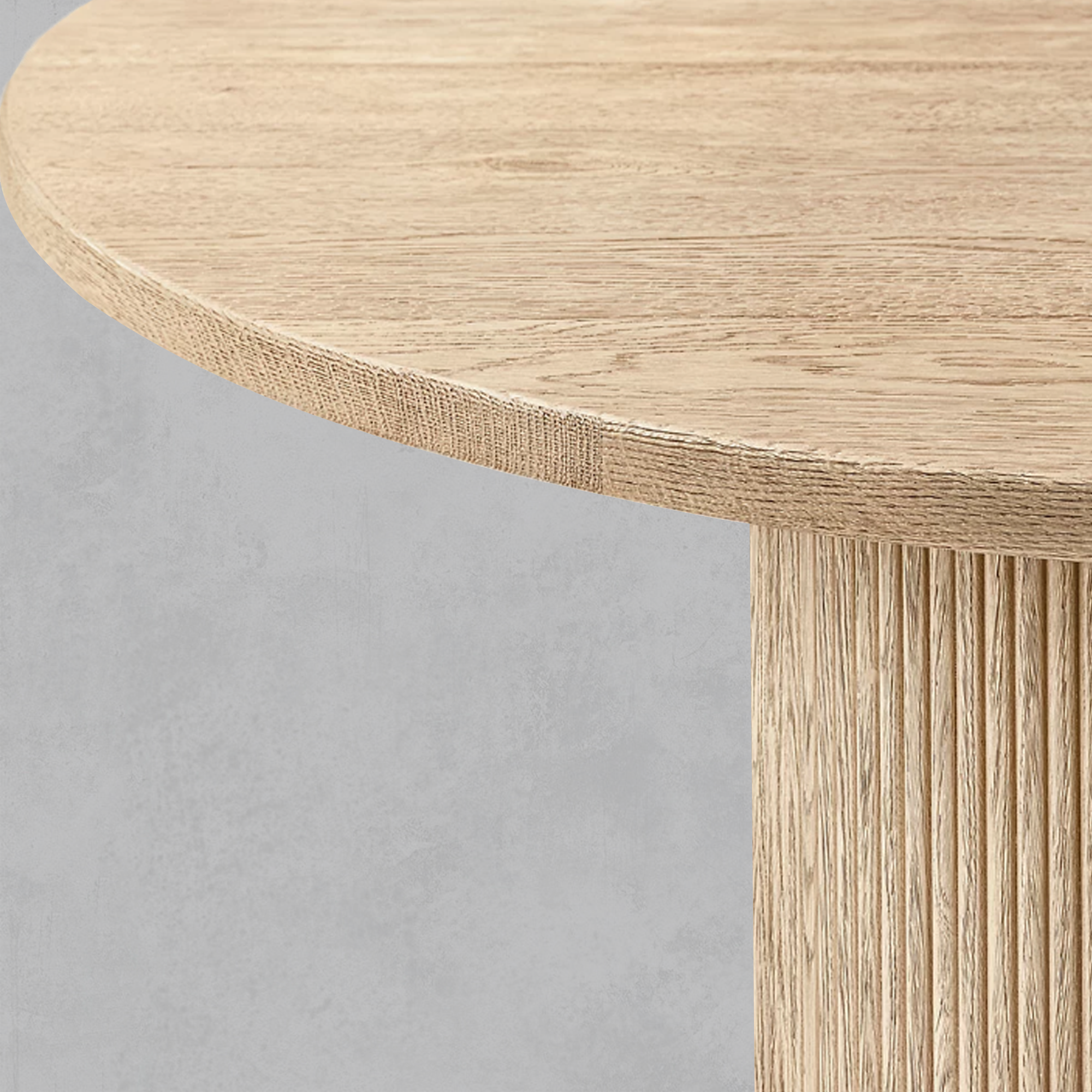 | CONSTRUCTION & MATERIALS | - The table is meticulously crafted from kiln-dried solid wood and engineered wood, adorned with American oak veneers, ensuring durability and a high-quality finish. - The vertical surfaces showcase solid oak reeding, adding a distinct, tactile element to the piece. - An intensive multistep finishing process gives the table a matte surface that highlights the natural grain of the wood, adding character and depth. |