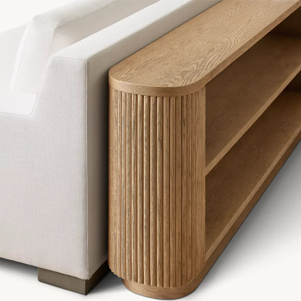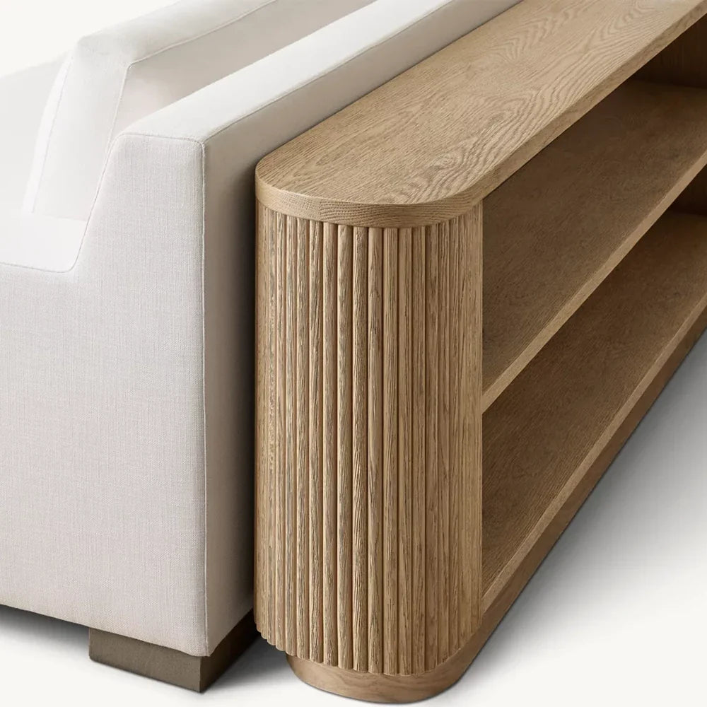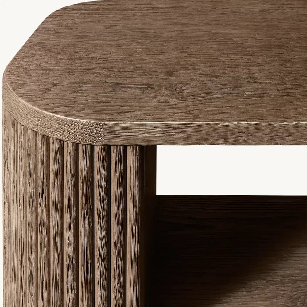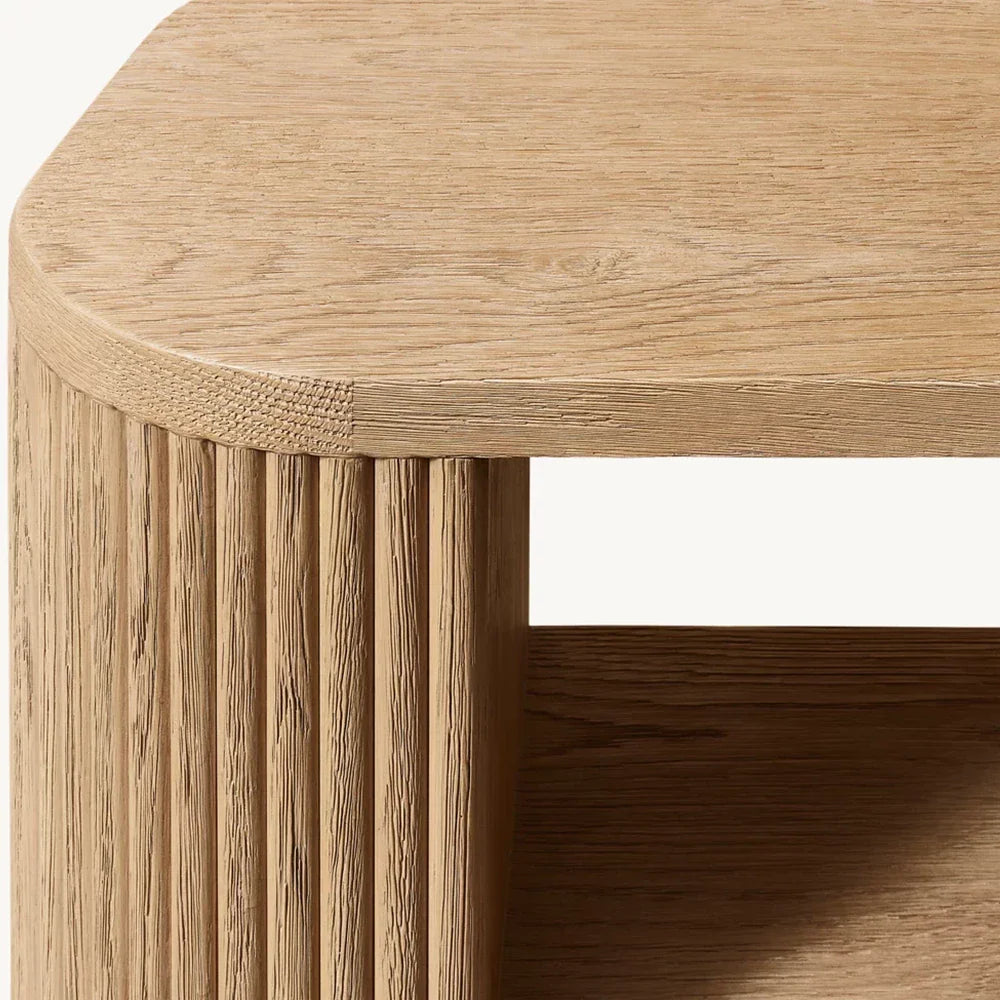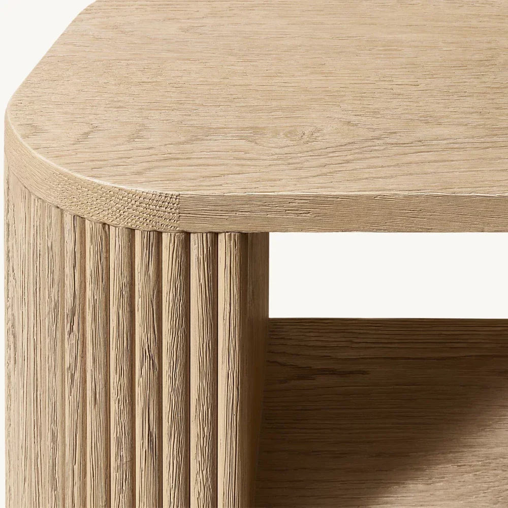 | Construction & Materials | - The table is meticulously crafted from kiln-dried solid wood and engineered wood, adorned with American oak veneers, ensuring durability and a high-quality finish. - The vertical surfaces showcase solid oak reeding, adding a distinct, tactile element to the piece. - An intensive multistep finishing process gives the table a matte surface that highlights the natural grain of the wood, adding character and depth. |