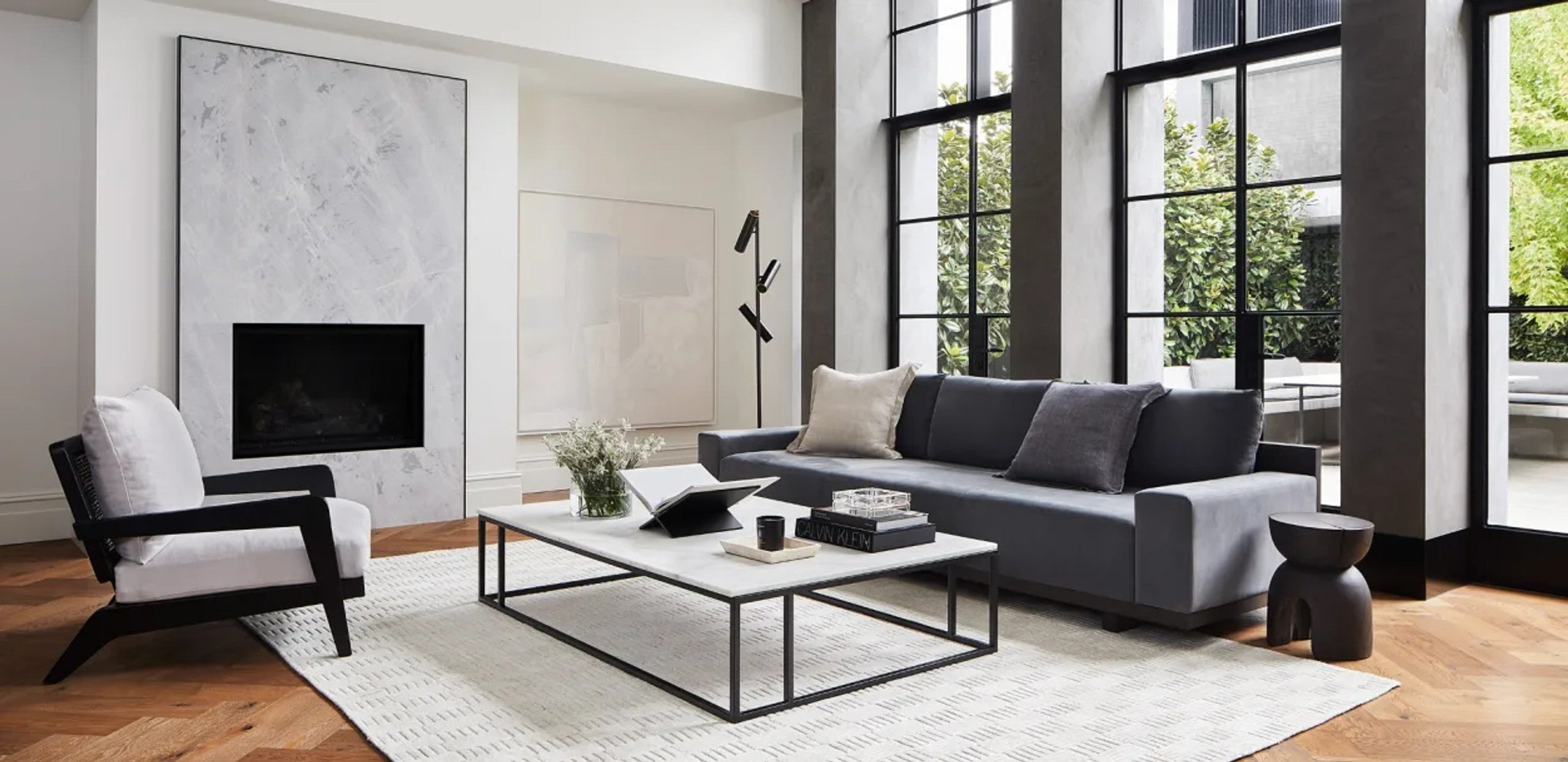A contemporary honed marble coffee table perfect to pair with any style|This contemporary and classic shape is ideal to pair back with any setting. The versatile Nomad coffee table features white marble with grey and natural tones and a solid steel architectural base. A versatile aesthetic for any room. Marble is a natural material and Coco Republic advises that distinctive variations in veining markings and colours can be expected as standard and do not compromise the integrity of the stone. Each piece is one-of-a-kind.