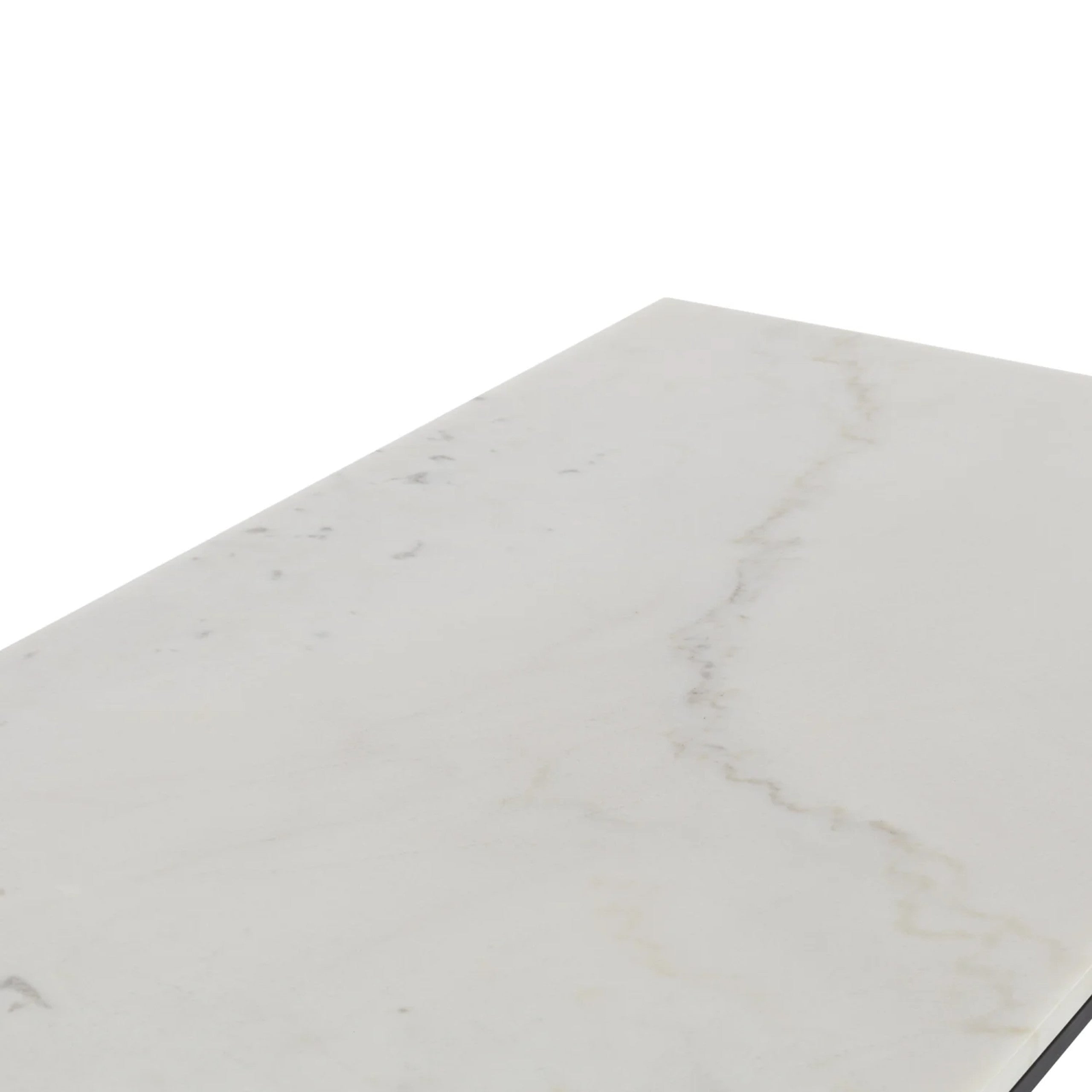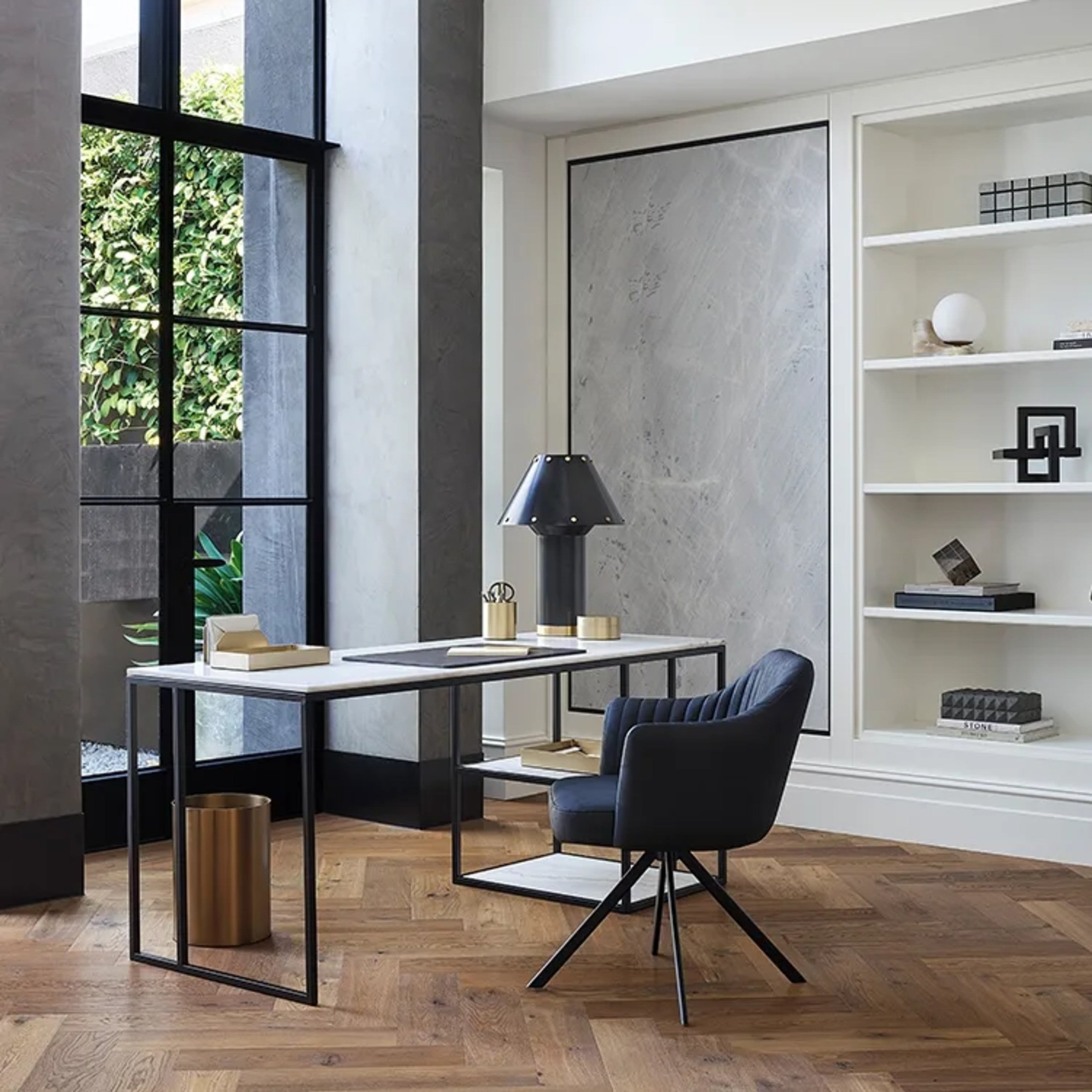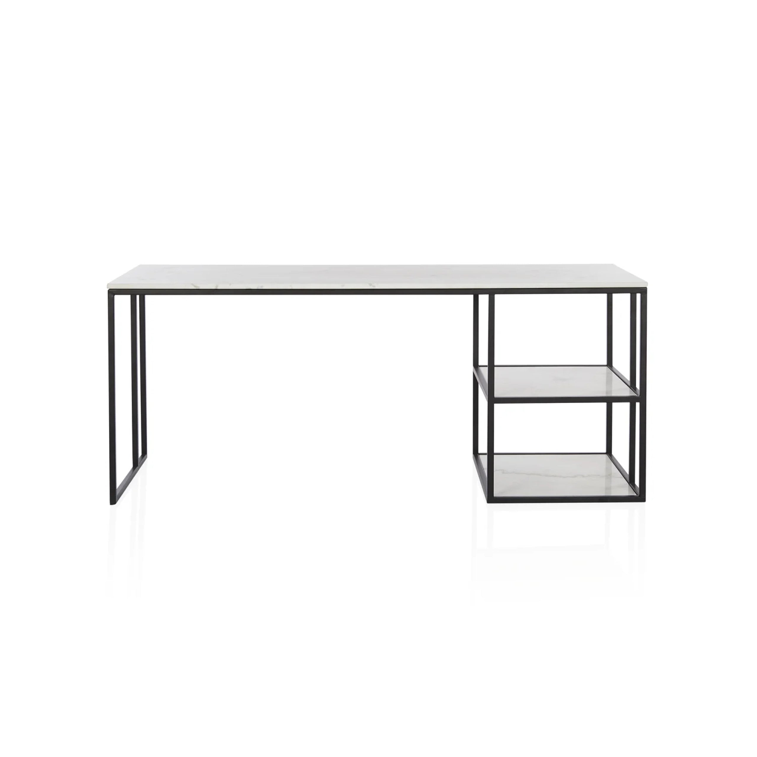 A contemporary honed marble desk perfect to pair with any style.|This contemporary and classic shape is ideal to pair back with any setting. The versatile Nomad Desk features white marble with grey and natural tones and a solid steel architectural base. A versatile aesthetic for any room. Marble is a natural material and Coco Republic advises that distinctive variations in veining markings and colours can be expected as standard and do not compromise the integrity of the stone. Each piece is one-of-a-kind.