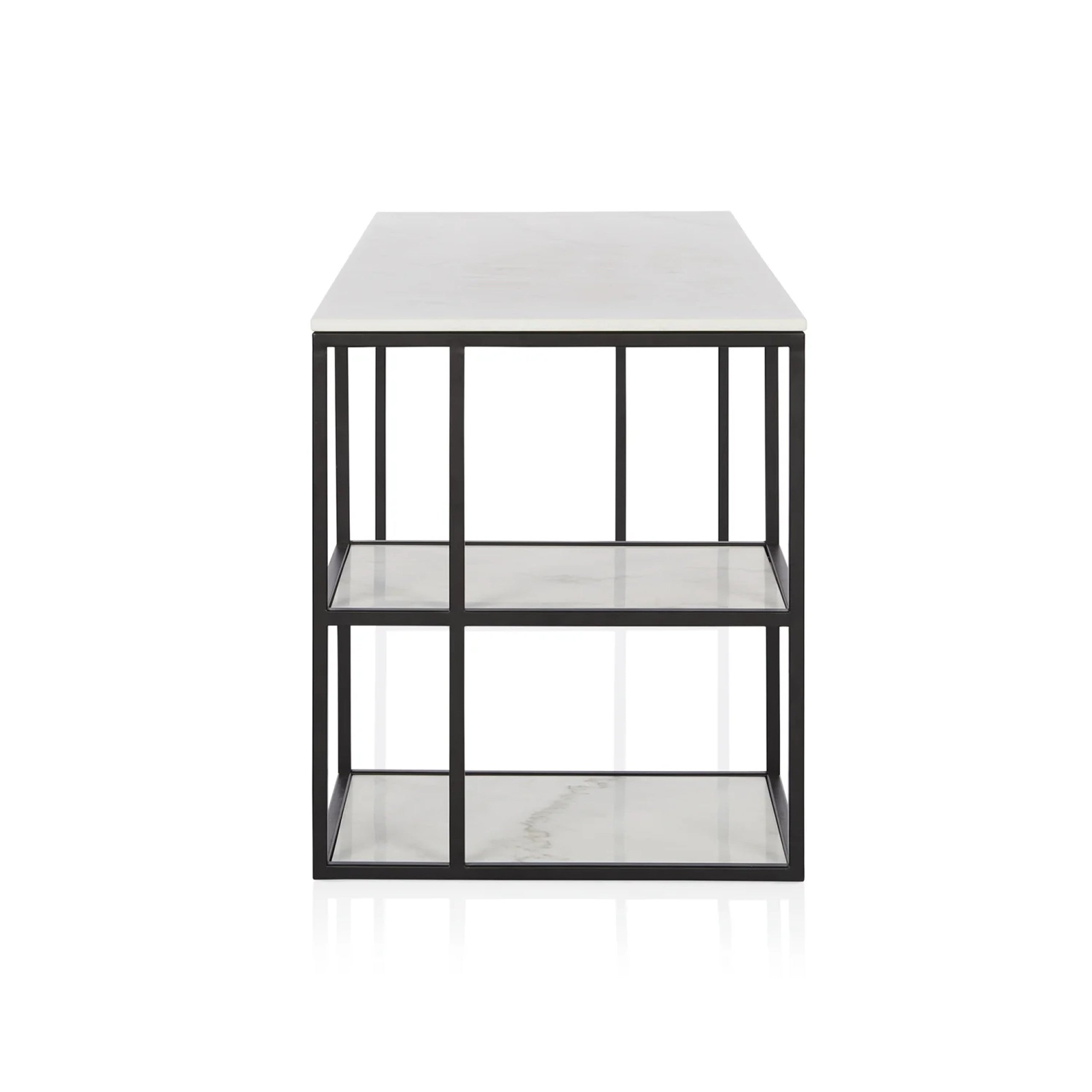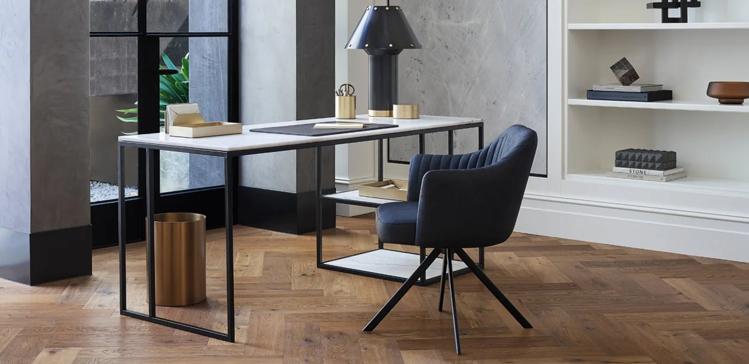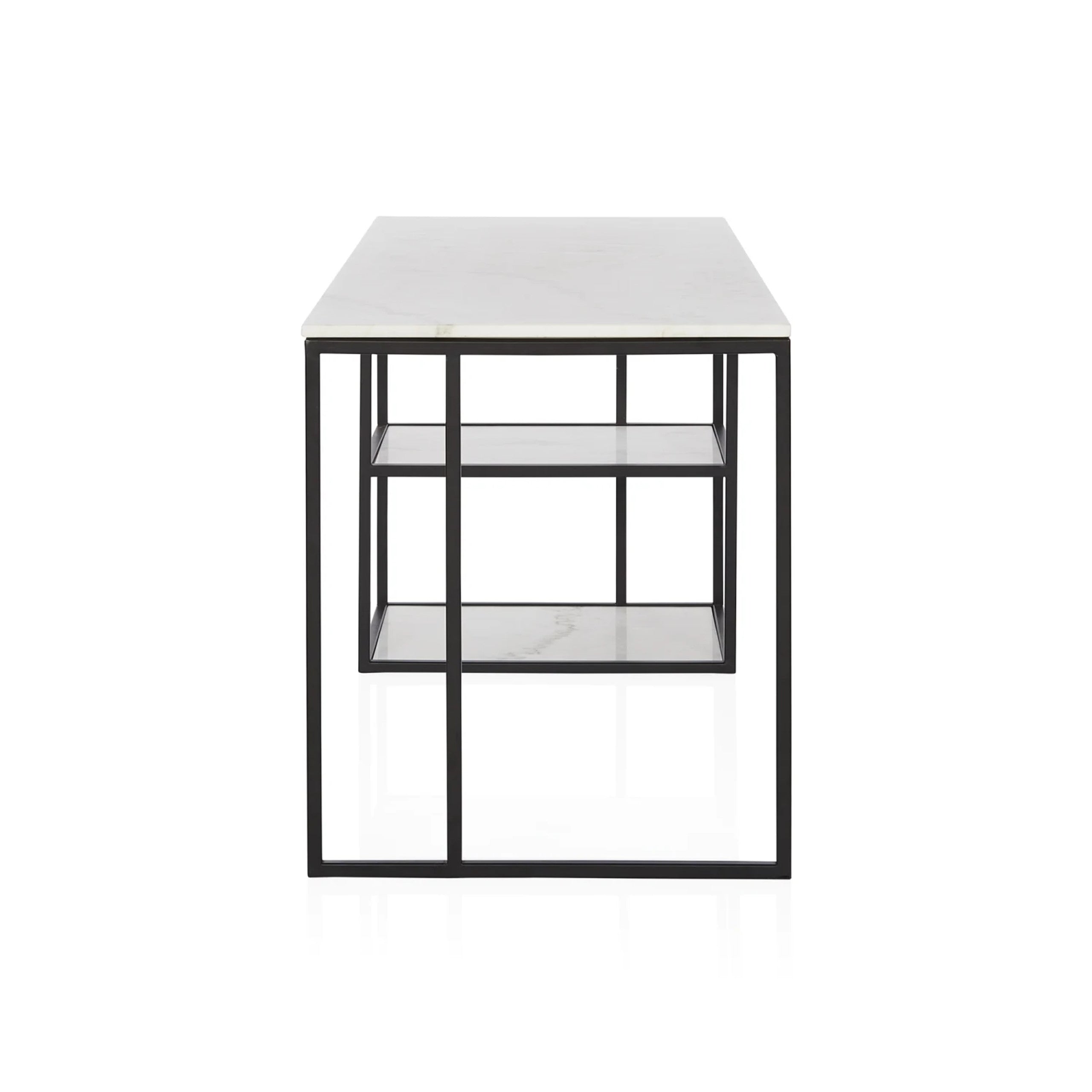 A contemporary honed marble desk perfect to pair with any style.|This contemporary and classic shape is ideal to pair back with any setting. The versatile Nomad Desk features white marble with grey and natural tones and a solid steel architectural base. A versatile aesthetic for any room. Marble is a natural material and Coco Republic advises that distinctive variations in veining markings and colours can be expected as standard and do not compromise the integrity of the stone. Each piece is one-of-a-kind.