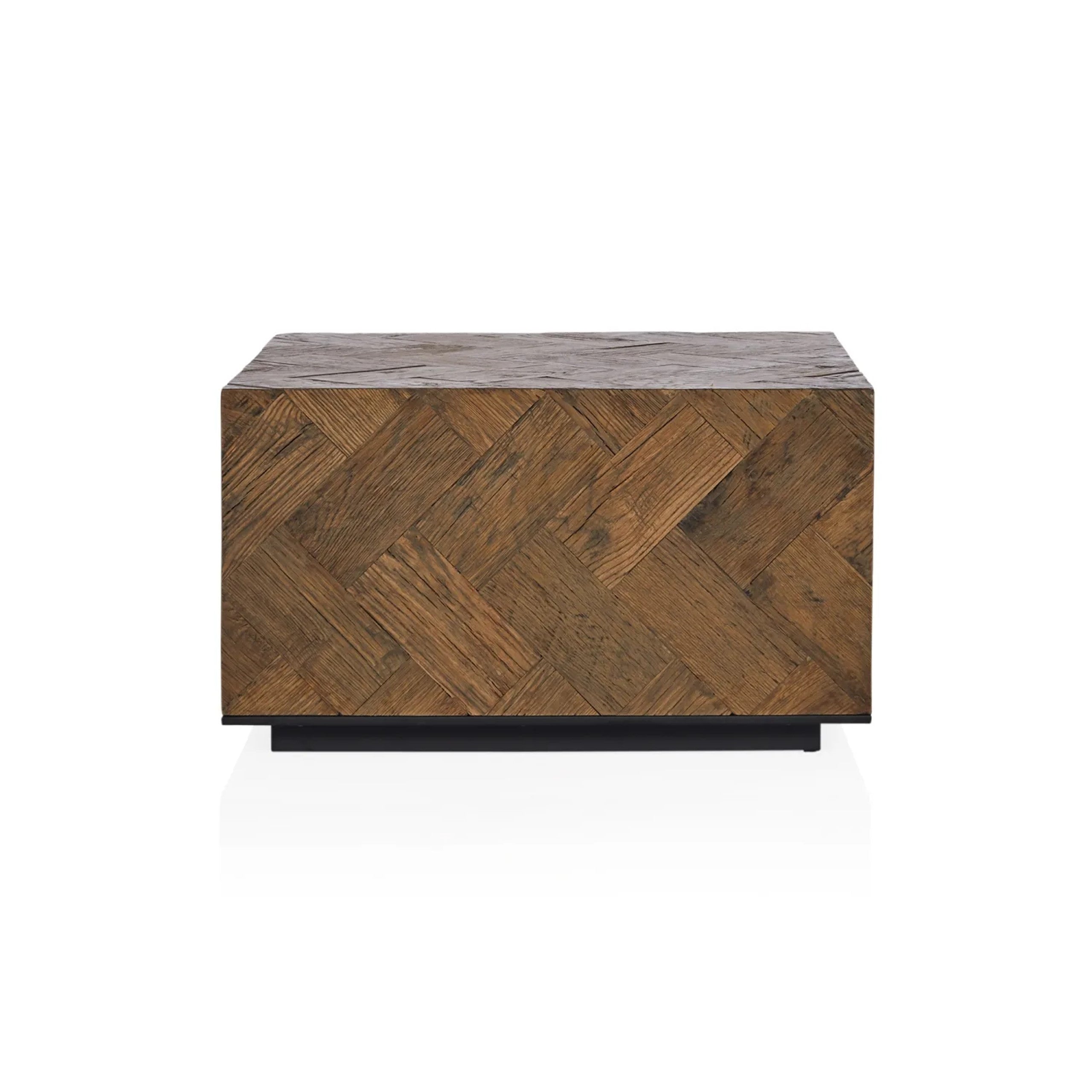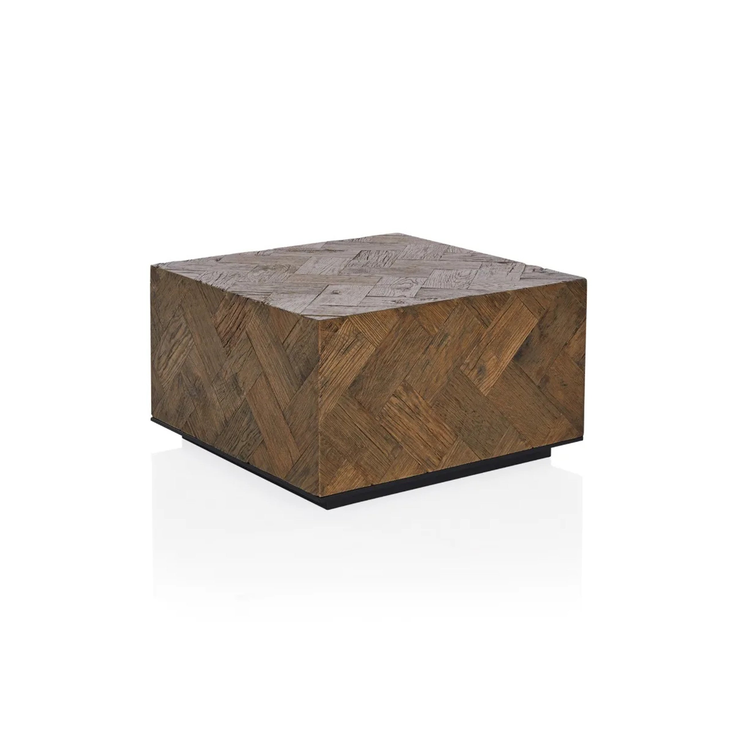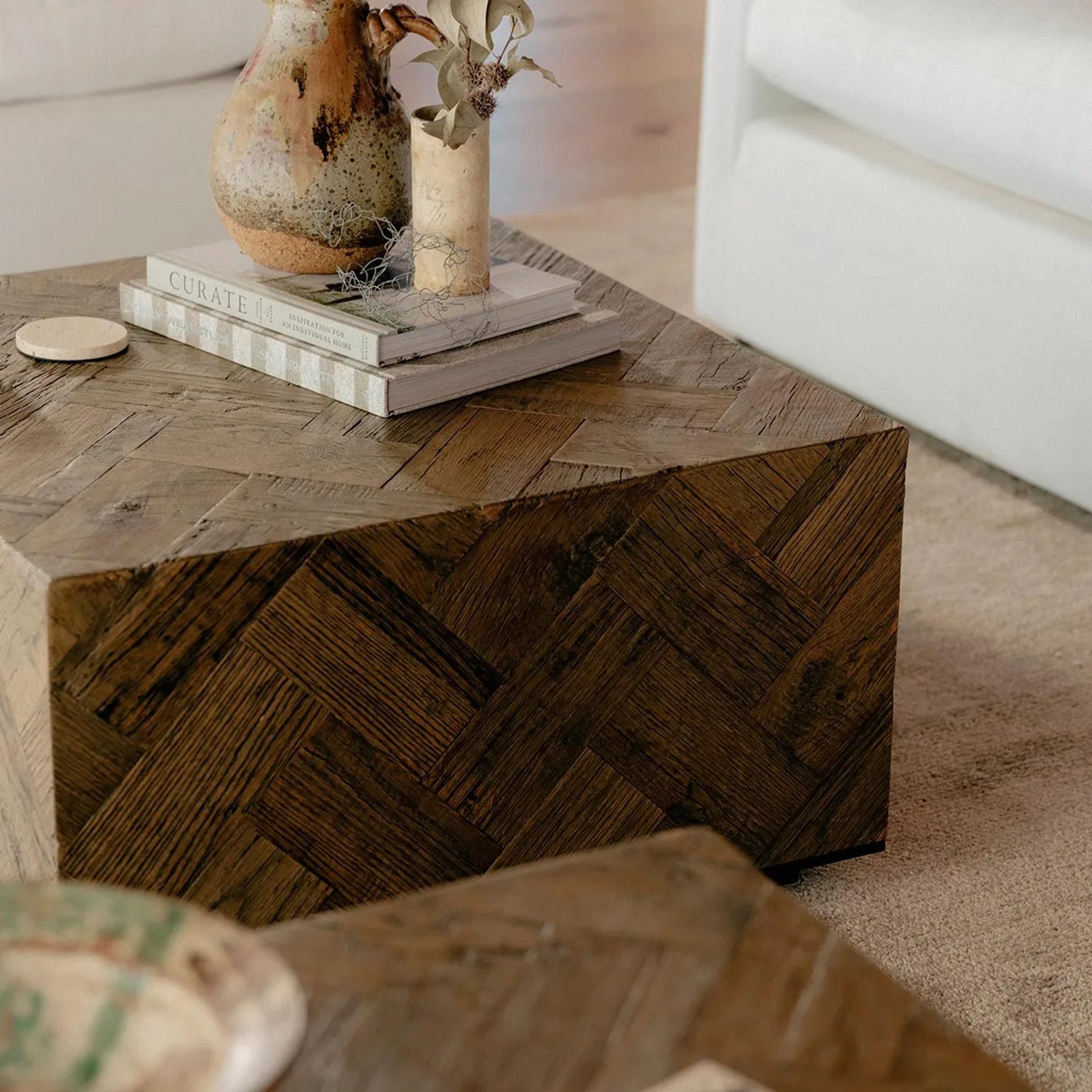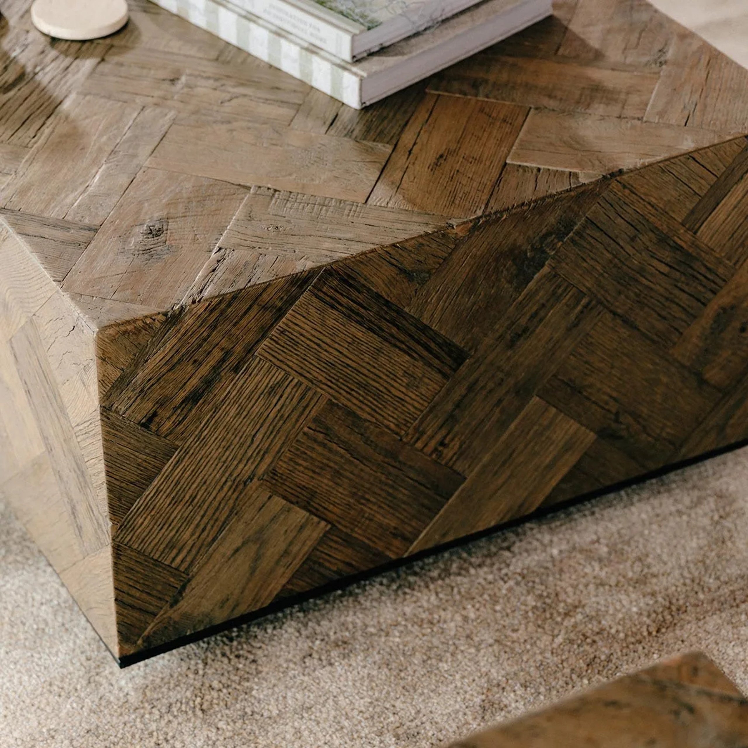 Handcrafted rustic coffee table with parquet pattern. Natural style with organic feel.|Handcrafted furnishings like the Odessa Coffee Table exude a warm organic feel that is hard to resist. This quirky table features handcrafted solid timber arranged in a traditional parquet pattern wrapped entirely around the square form. The table's natural nuances meld beautifully in contemporary modern eclectic and rustic style spaces. Place as a set of four to create a statement coffee table.