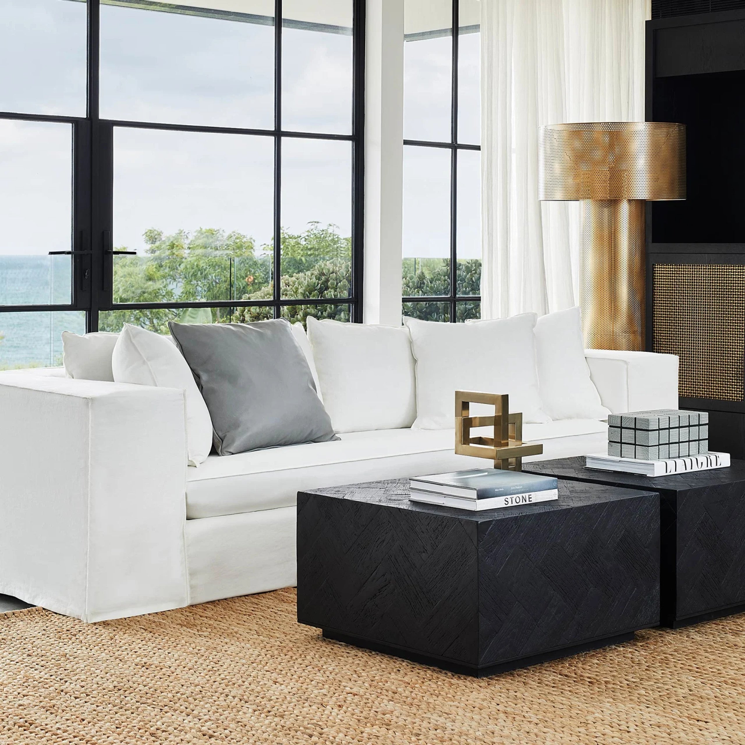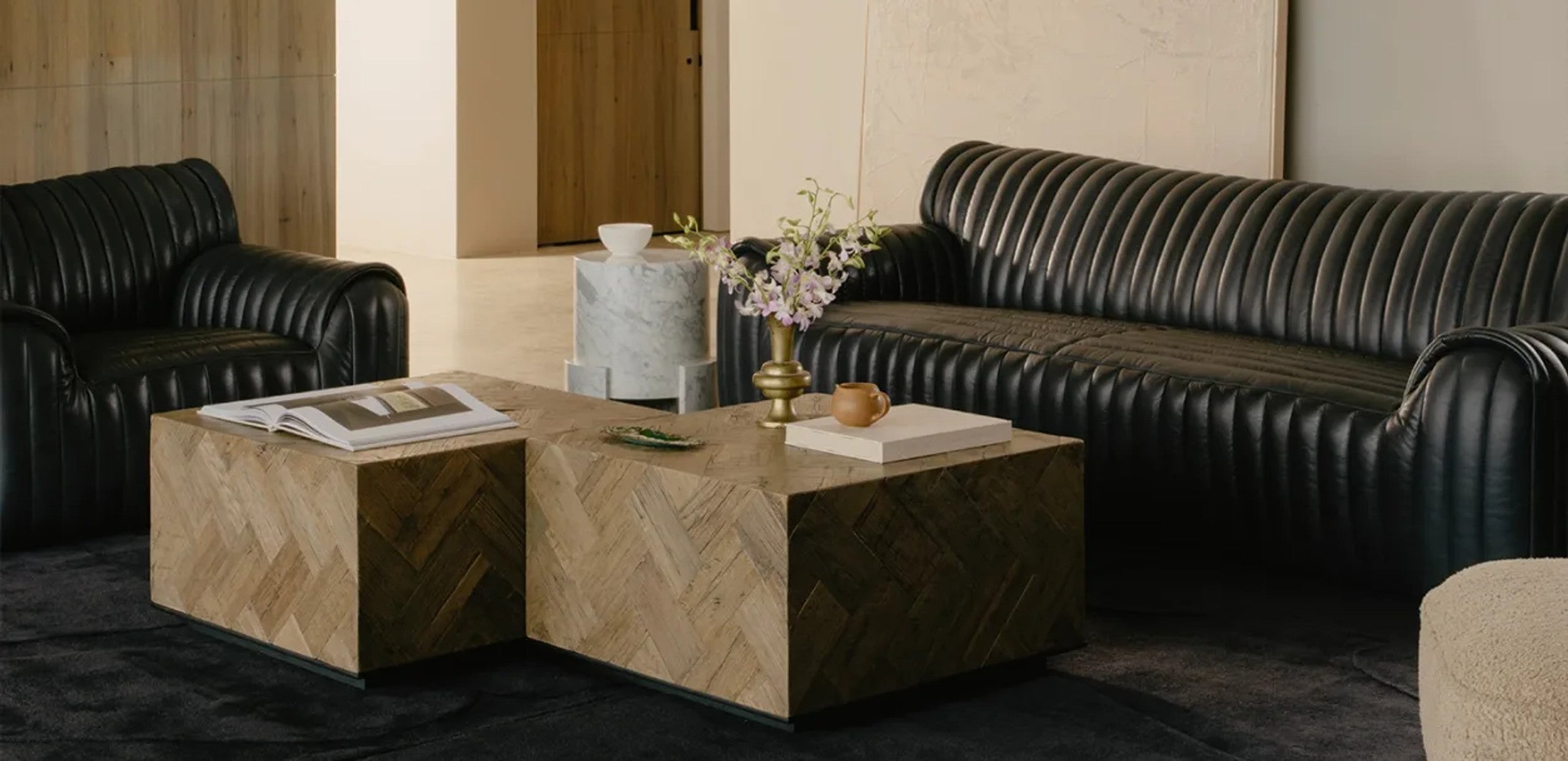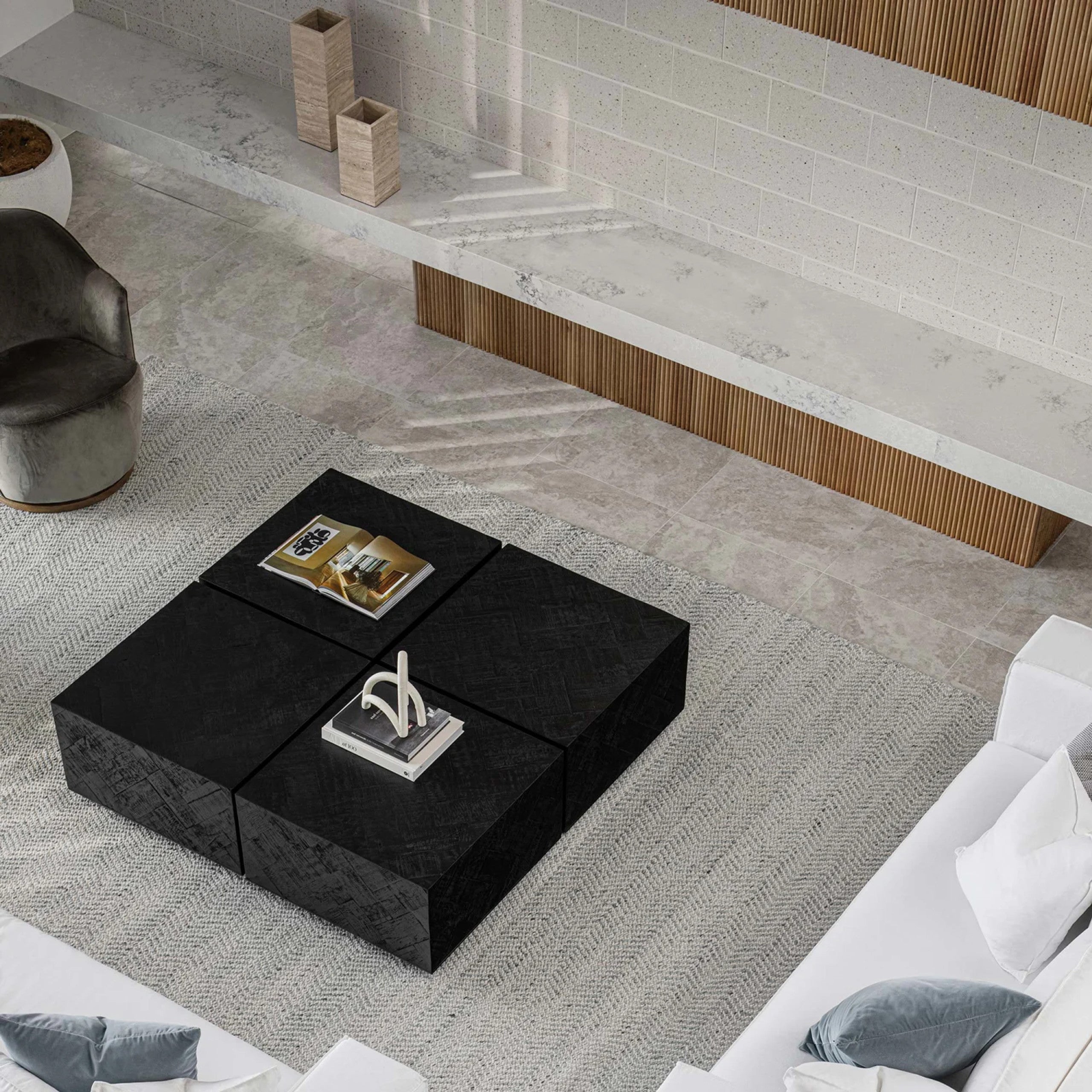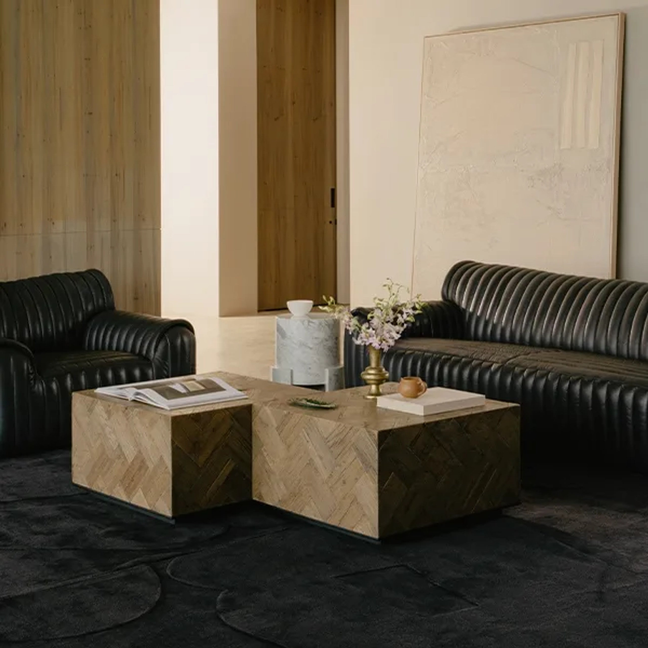 Handcrafted rustic coffee table with parquet pattern. Natural style with organic feel.|Handcrafted furnishings like the Odessa Coffee Table exude a warm organic feel that is hard to resist. This quirky table features handcrafted solid timber arranged in a traditional parquet pattern wrapped entirely around the square form. The table's natural nuances meld beautifully in contemporary modern eclectic and rustic style spaces. Place as a set of four to create a statement coffee table.