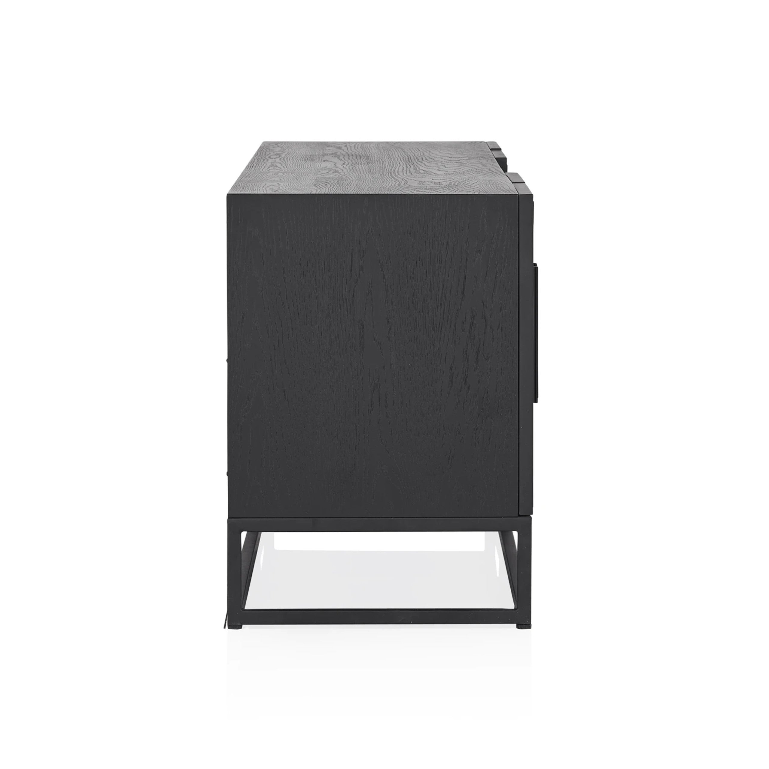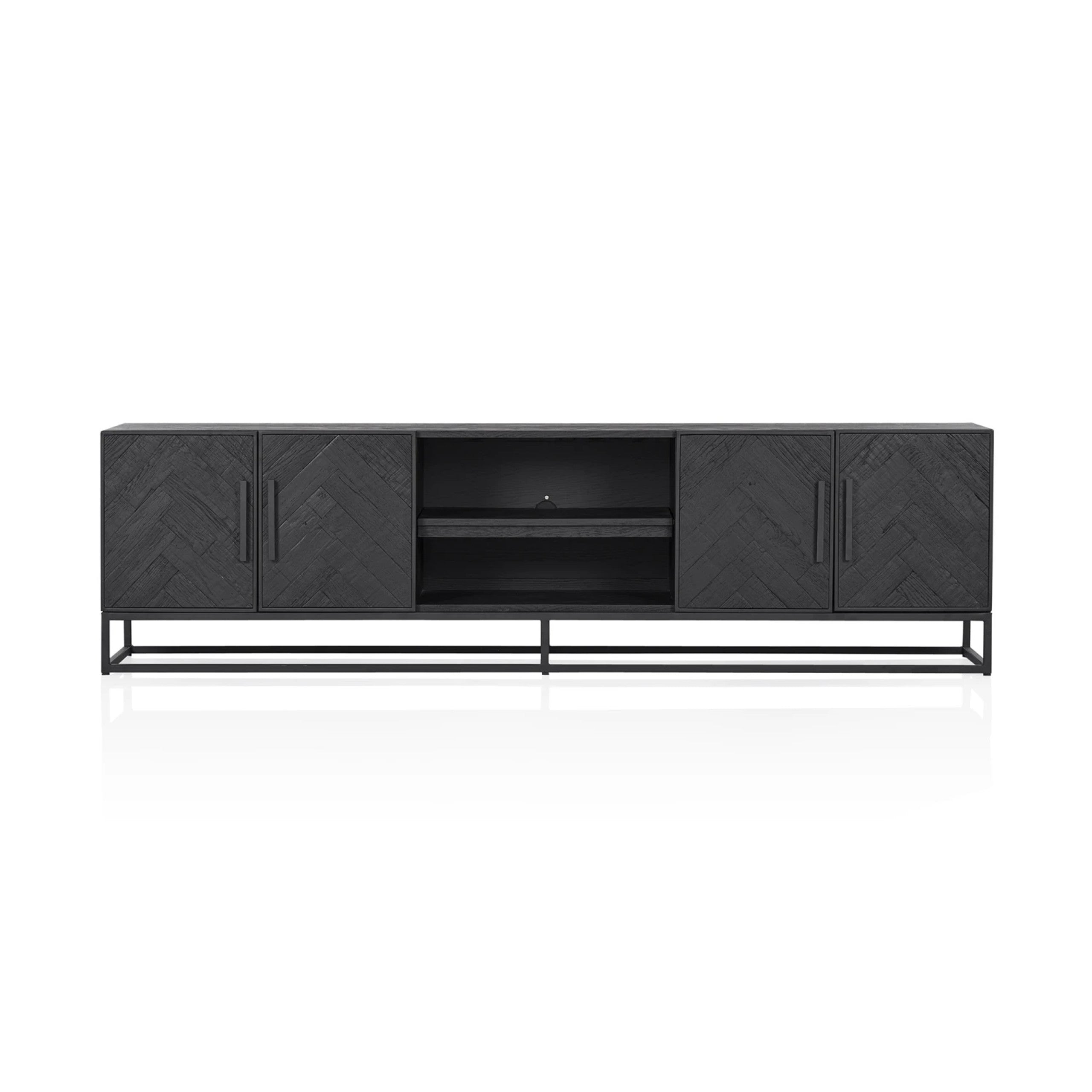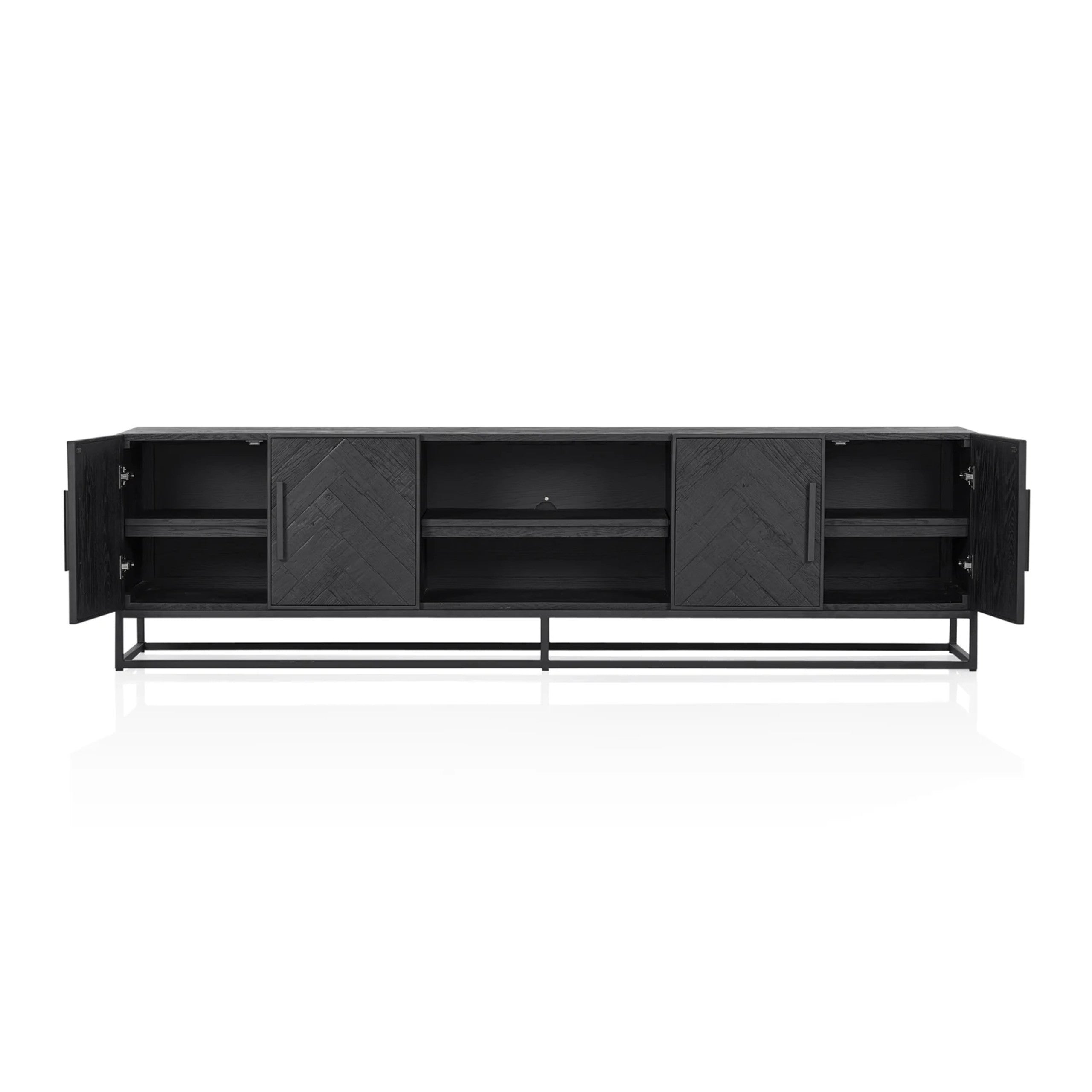 Rustic modern style entertainment unit with handcrafted parquet wood inlay stained in black with metal frame.|The Odessa Entertainment Console with handcrafted parquetry pattern inlay exudes a natural style ideal for today's living spaces. The timber has a black stained distressed look combined with a blackened metal frame. Equipped with two doors and two open shelves to accommodate and conceal your audio-visual equipment. Curated for the sophisticated home the Gramercy collection is inspired by interiors of chic Parisian homes. Handcrafted from timber with elegant metal accents the colour palette lends a refined modern edge to classic forms.