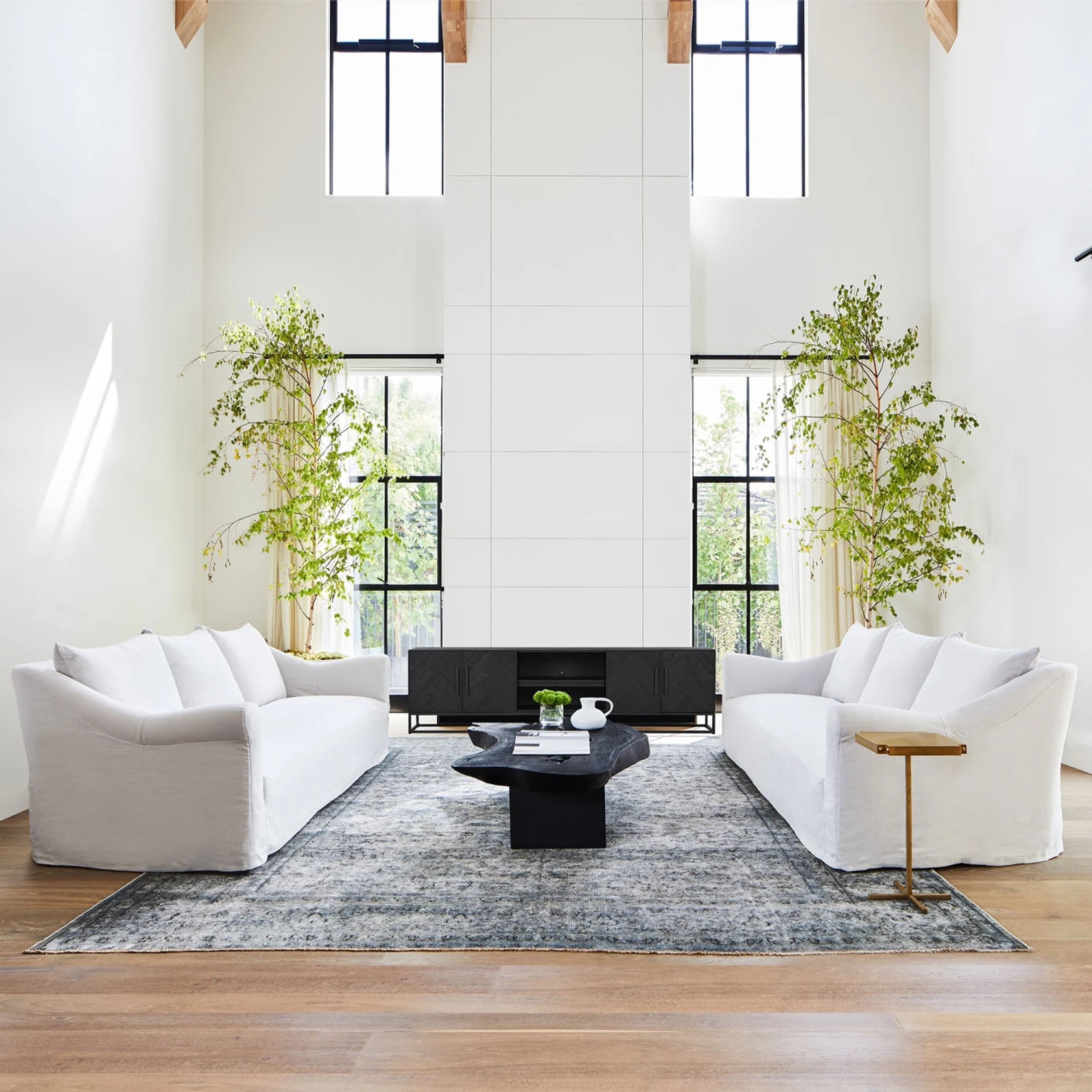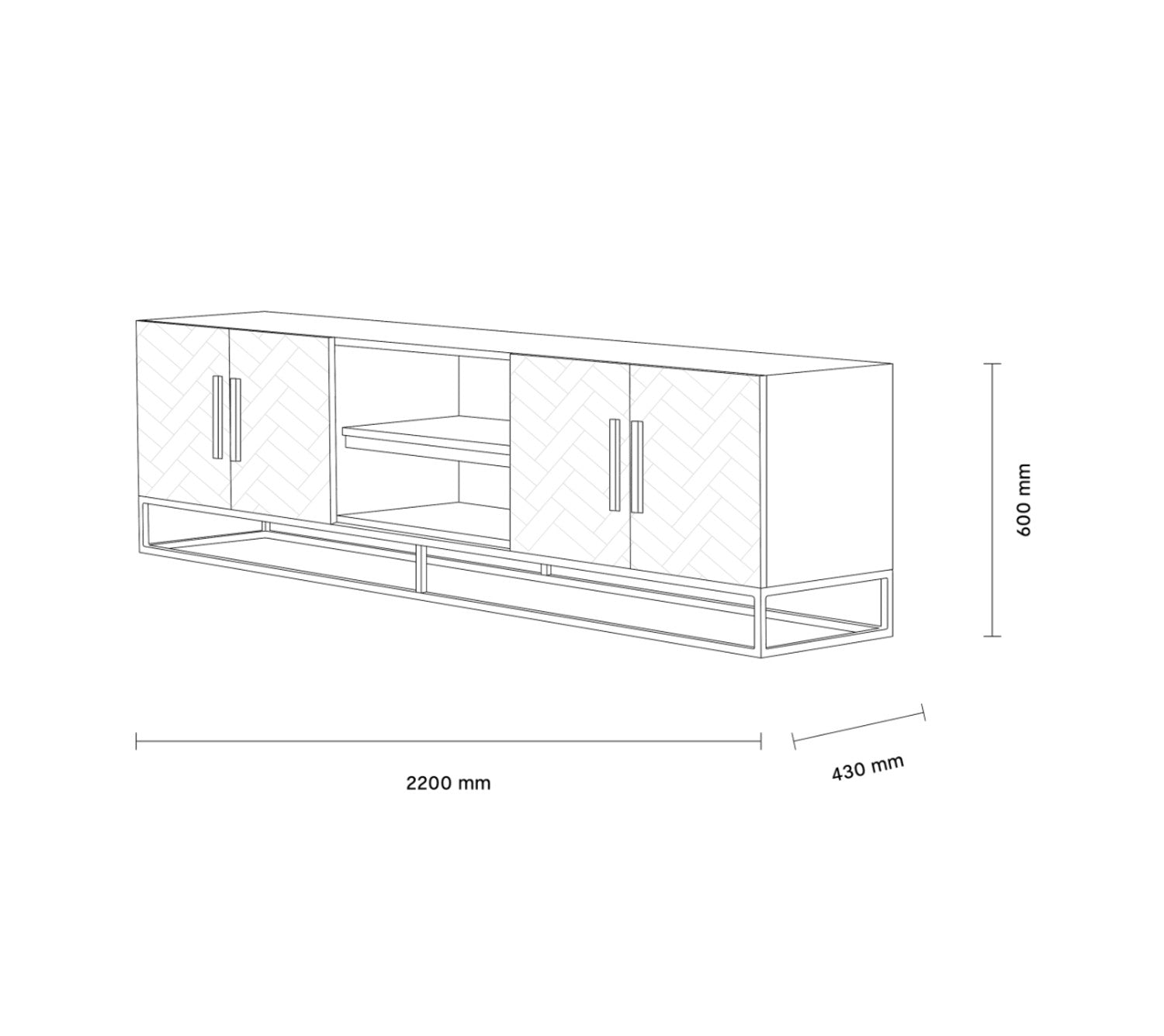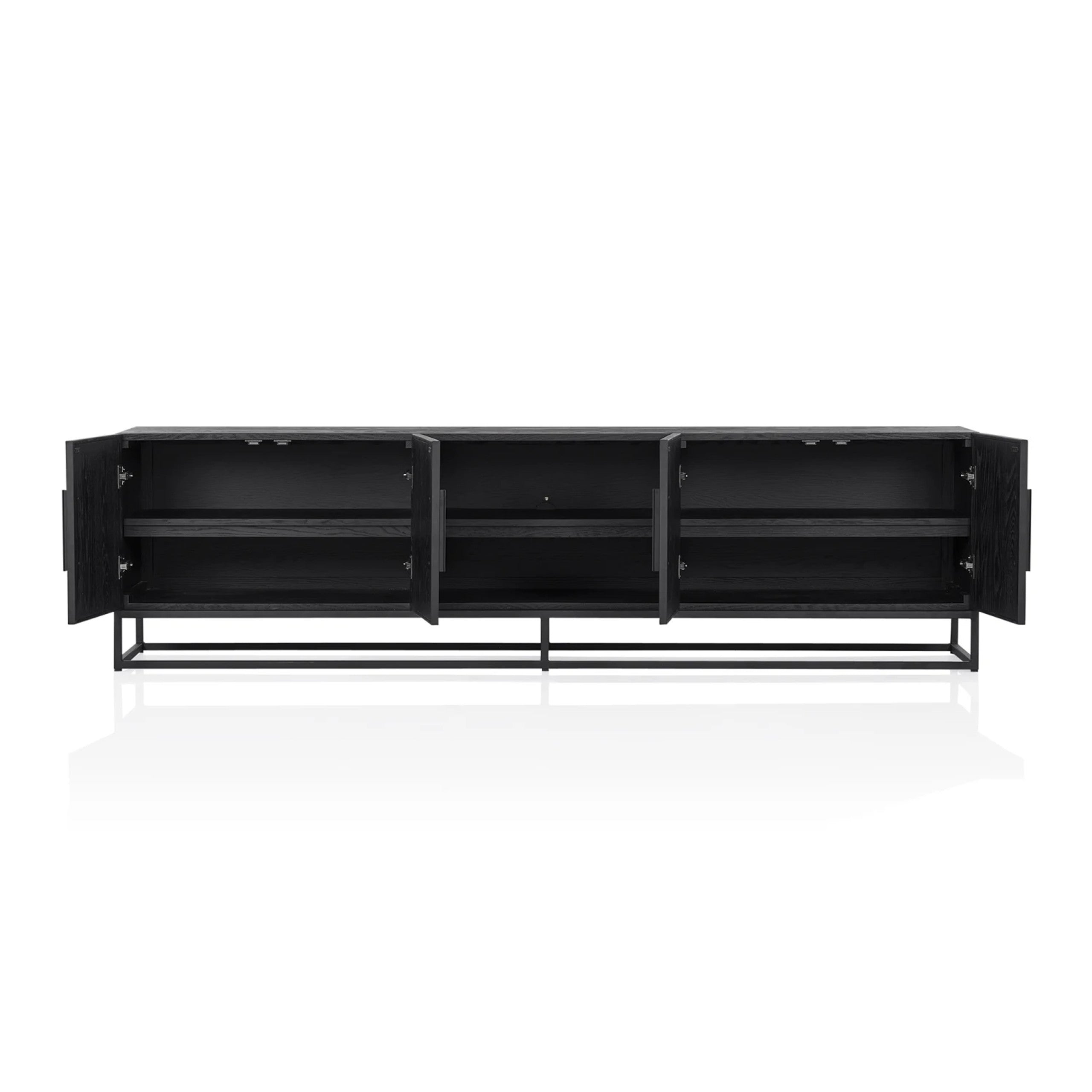 Rustic modern style entertainment unit with handcrafted parquet wood inlay stained in black with metal frame.|The Odessa Entertainment Console with handcrafted parquetry pattern inlay exudes a natural style ideal for today's living spaces. The timber has a black stained distressed look combined with a blackened metal frame. Equipped with two doors and two open shelves to accommodate and conceal your audio-visual equipment. Curated for the sophisticated home the Gramercy collection is inspired by interiors of chic Parisian homes. Handcrafted from timber with elegant metal accents the colour palette lends a refined modern edge to classic forms.