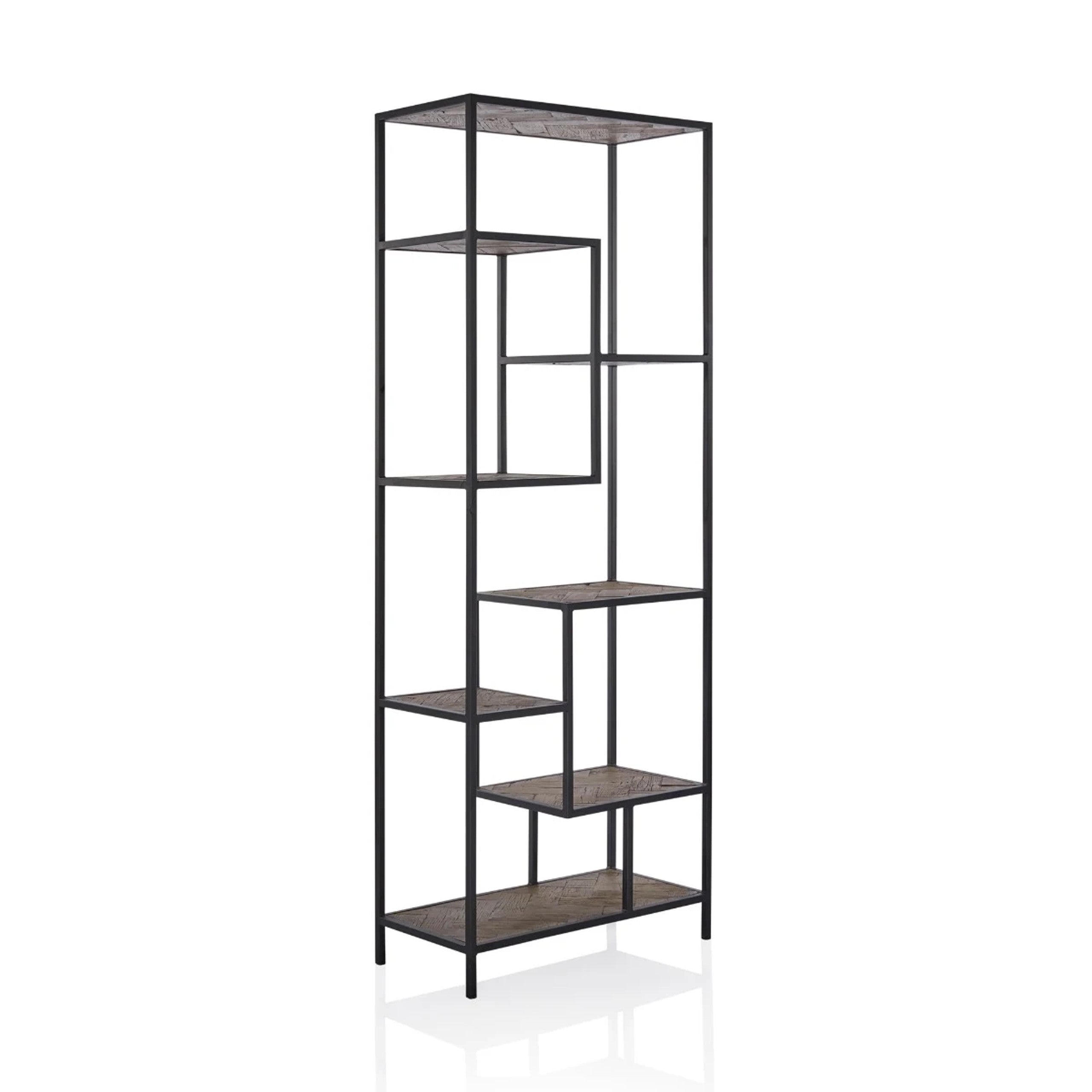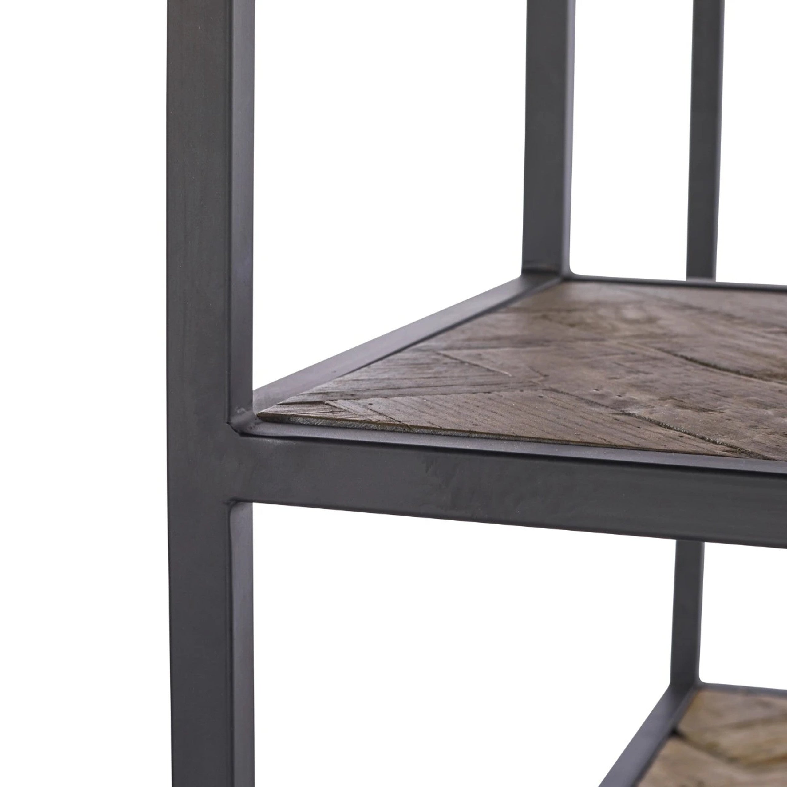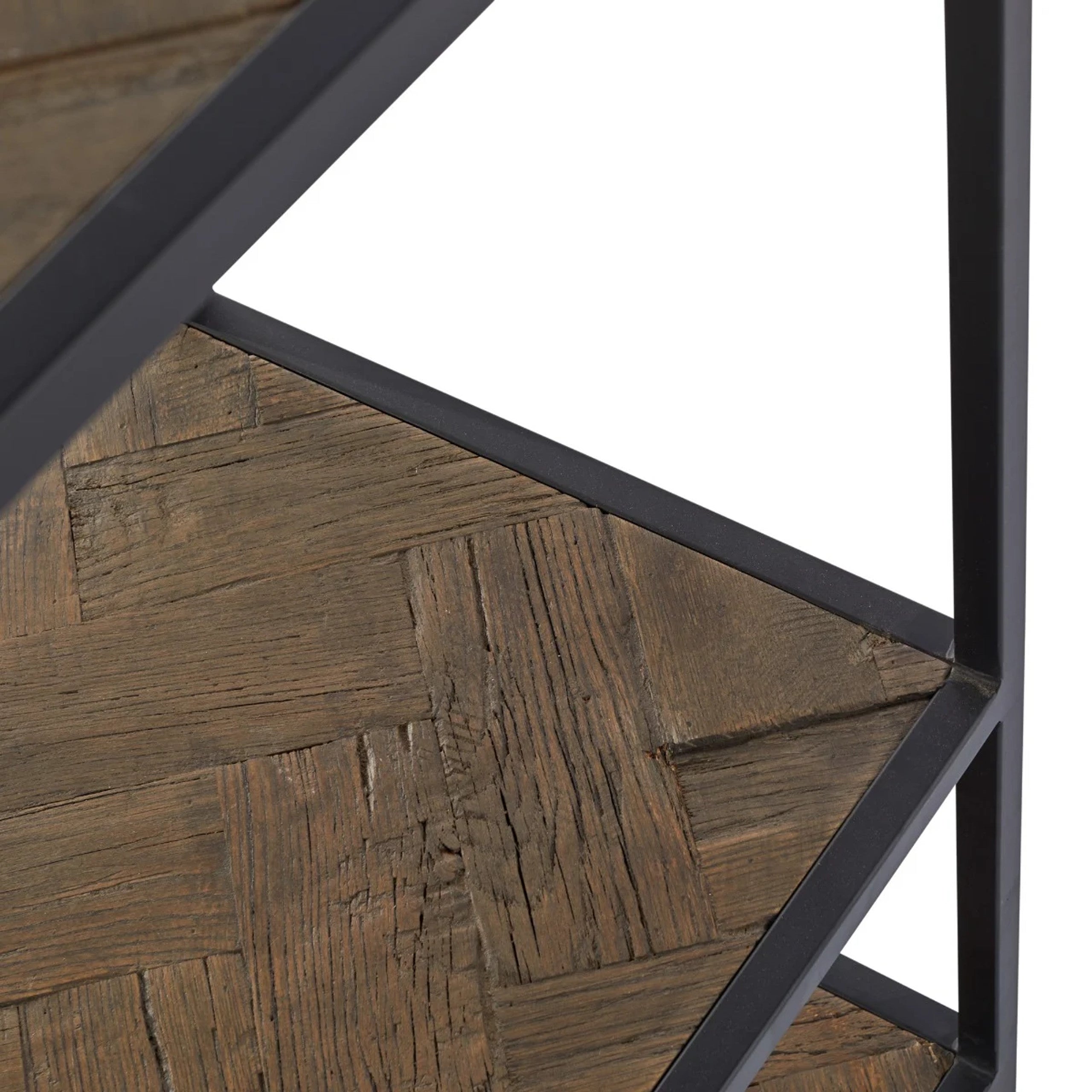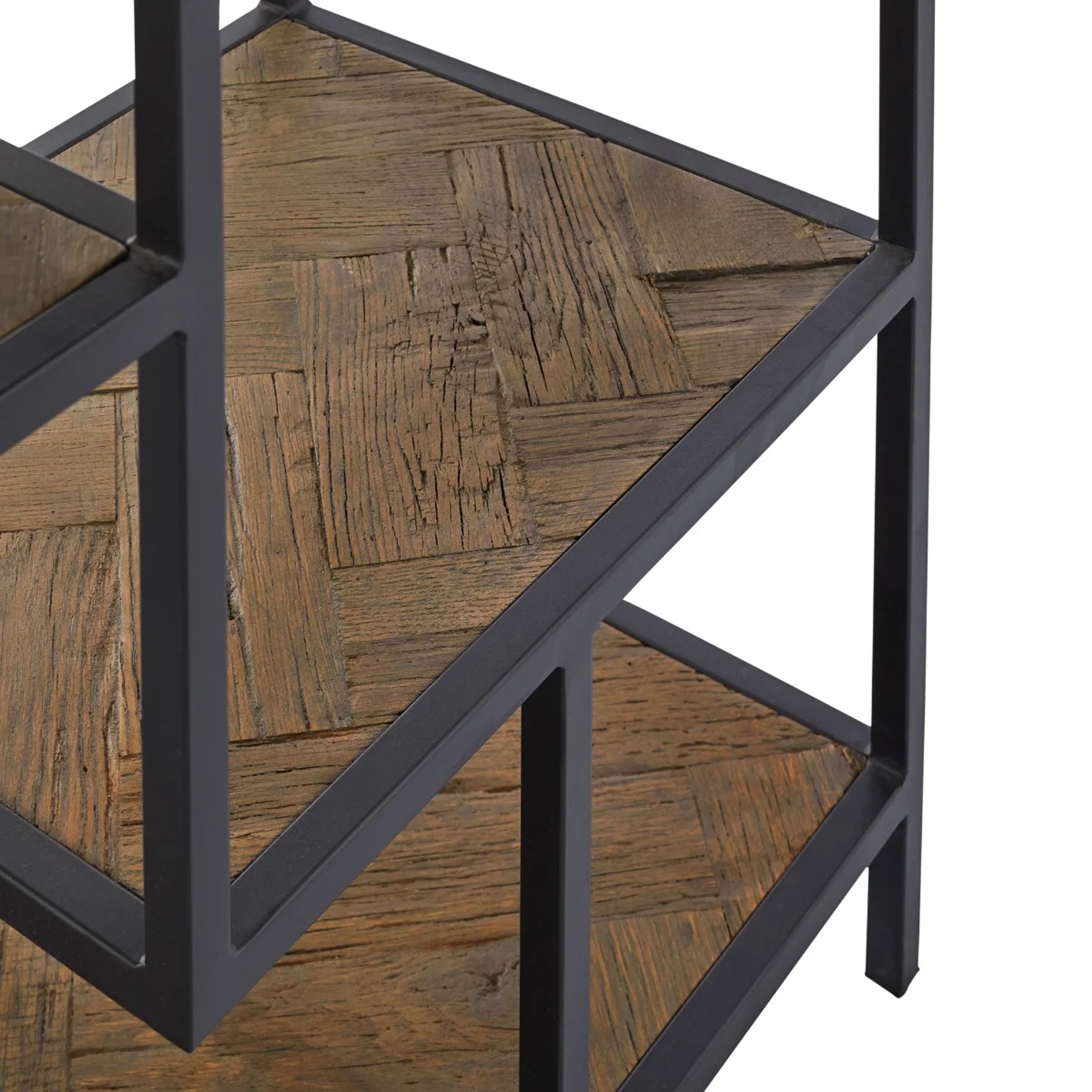 Rustic modern style etagere with handcrafted parquet wood inlay and metal frame.|The Odessa Shelving Unit with handcrafted parquetry pattern inlay on each shelf exudes a natural style ideal for today's living spaces. The timber has a natural distressed look combined with a geometric metal frame. Pair two side-by-side to create a striking display of coveted items. Curated for the sophisticated home the Gramercy collection is inspired by interiors of chic Parisian homes. Handcrafted from timber with elegant metal accents the colour palette lends a refined modern edge to classic forms.