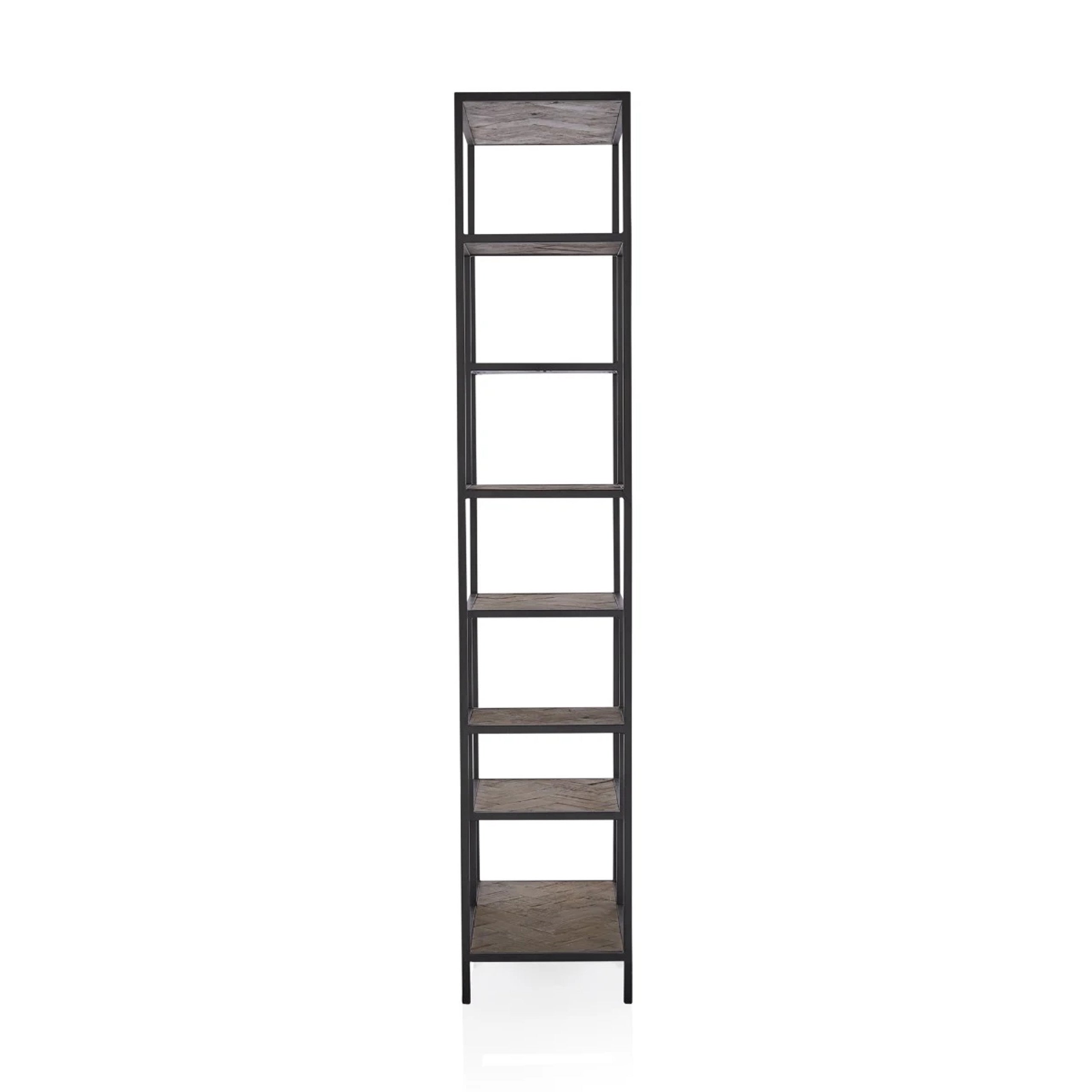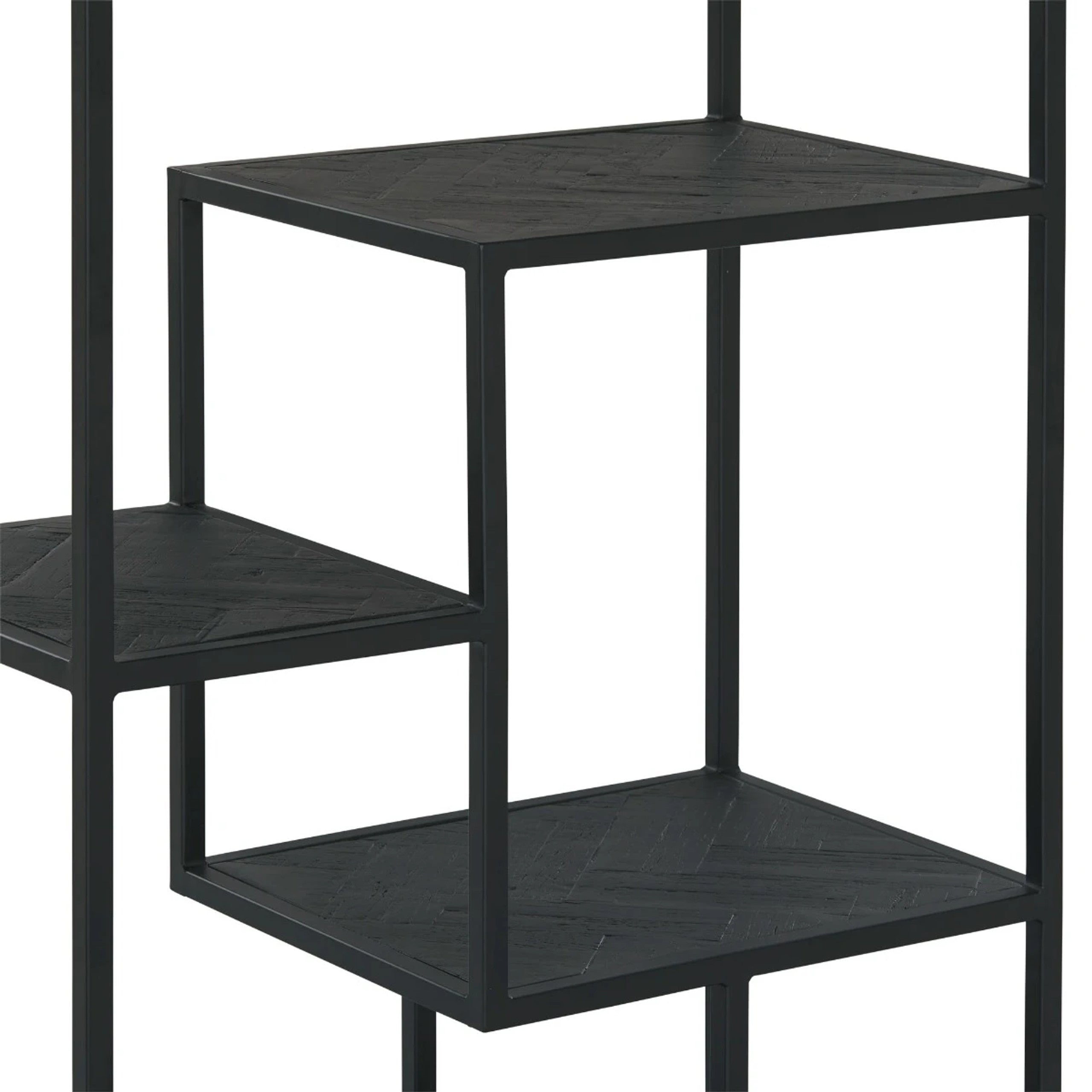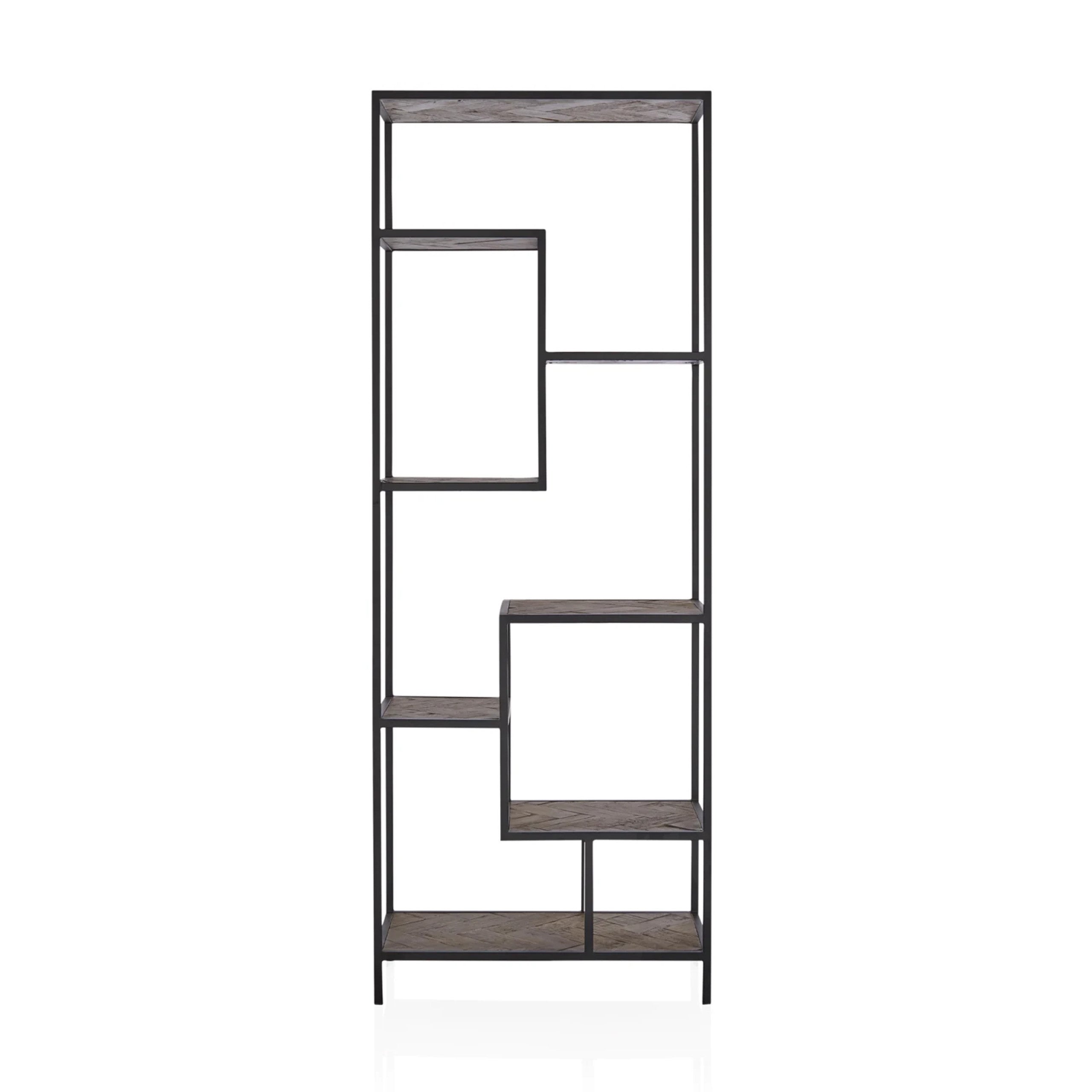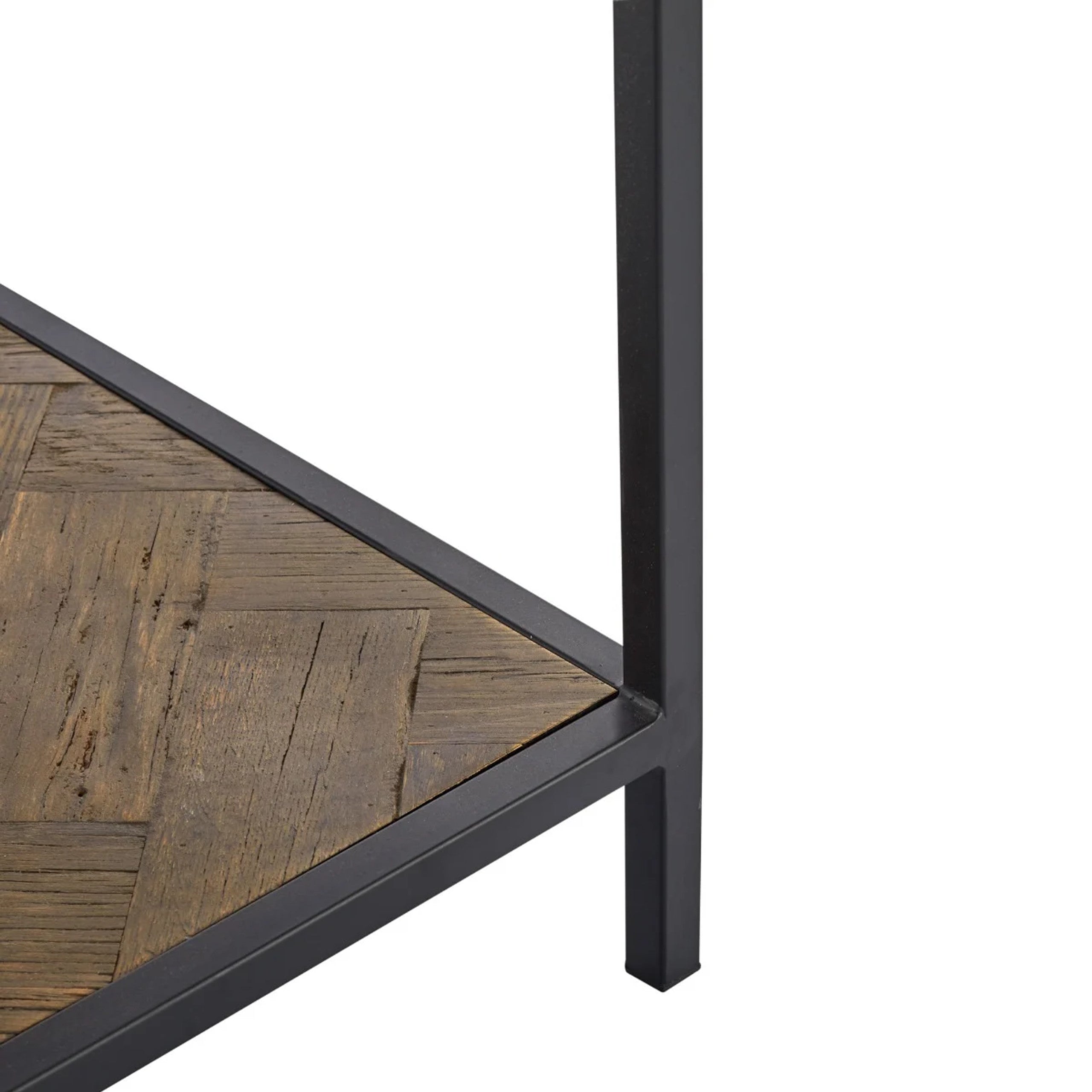 Rustic modern style etagere with handcrafted parquet wood inlay and metal frame.|The Odessa Shelving Unit with handcrafted parquetry pattern inlay on each shelf exudes a natural style ideal for today's living spaces. The timber has a natural distressed look combined with a geometric metal frame. Pair two side-by-side to create a striking display of coveted items. Curated for the sophisticated home the Gramercy collection is inspired by interiors of chic Parisian homes. Handcrafted from timber with elegant metal accents the colour palette lends a refined modern edge to classic forms.