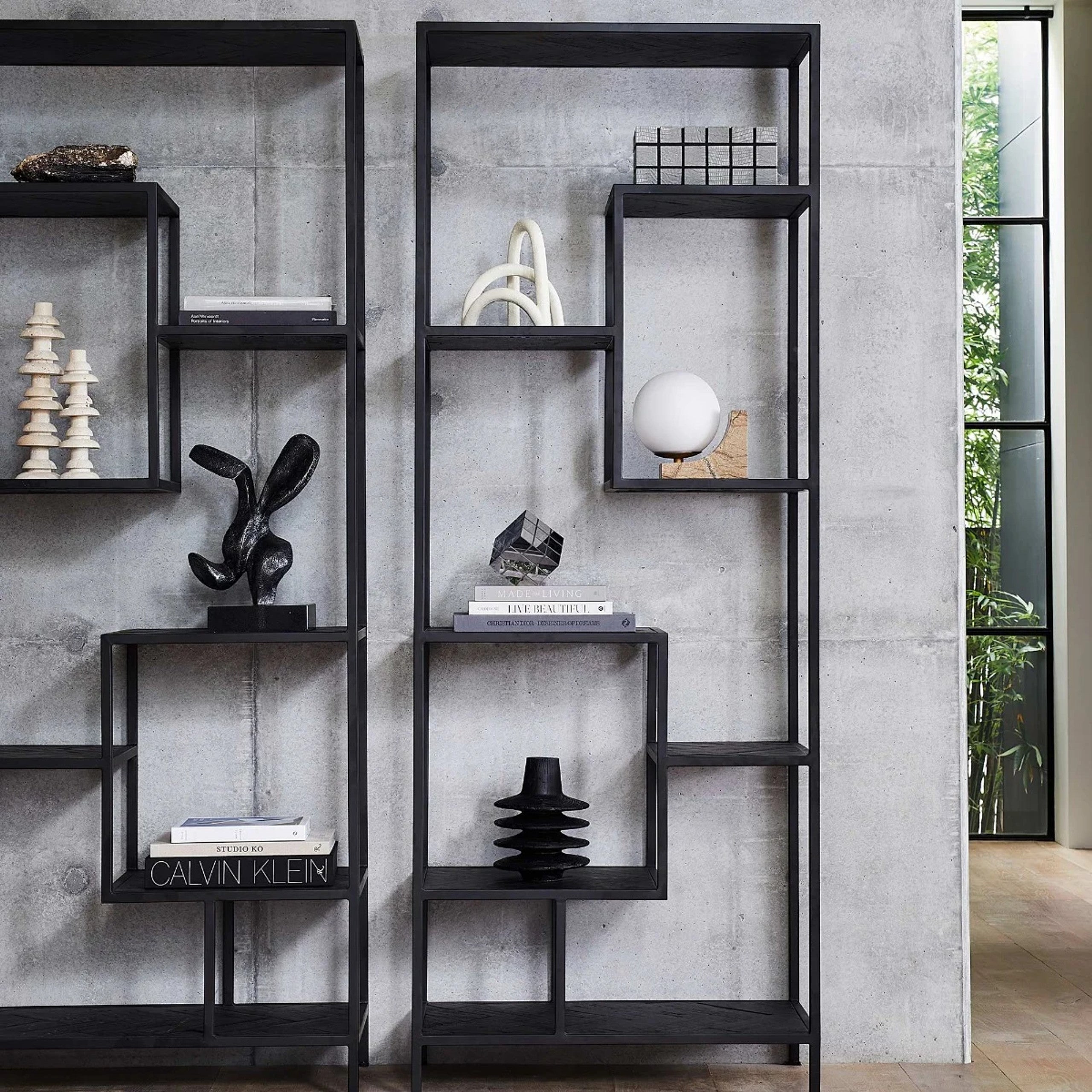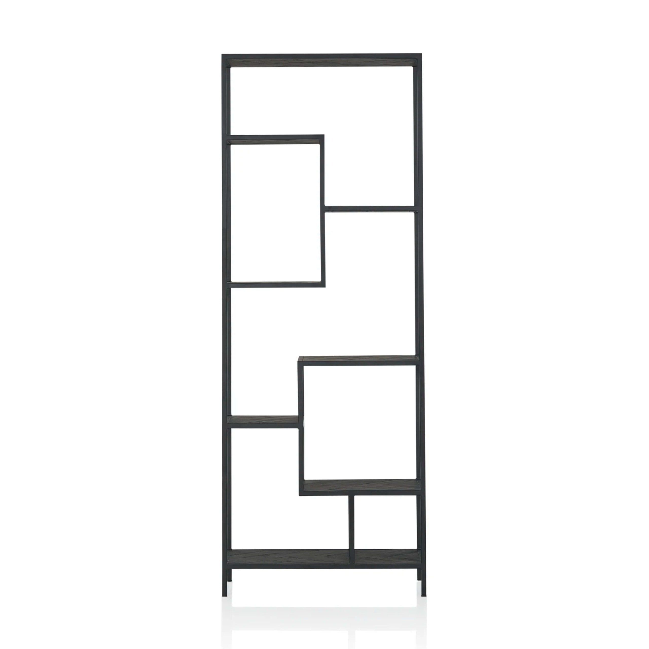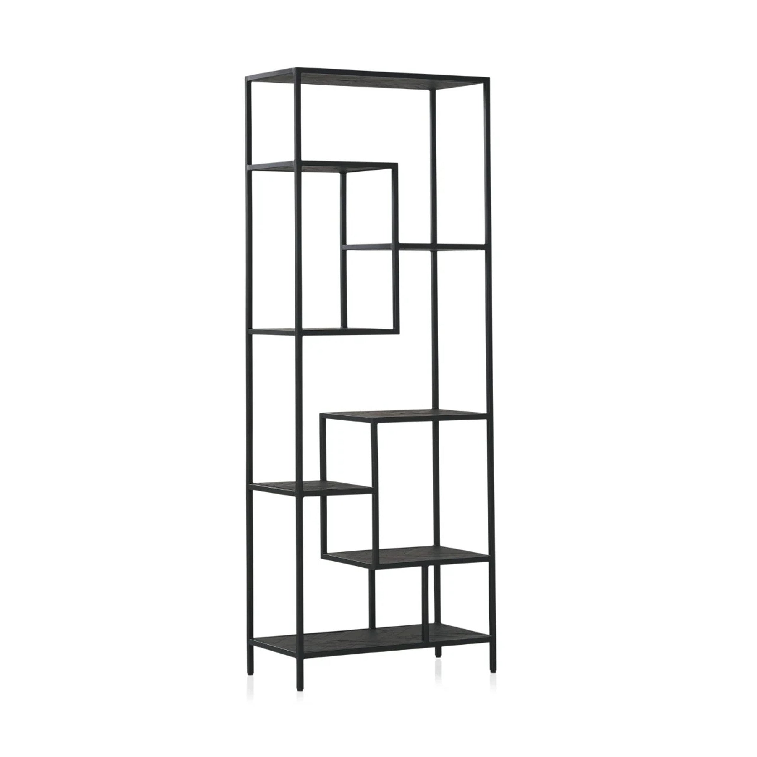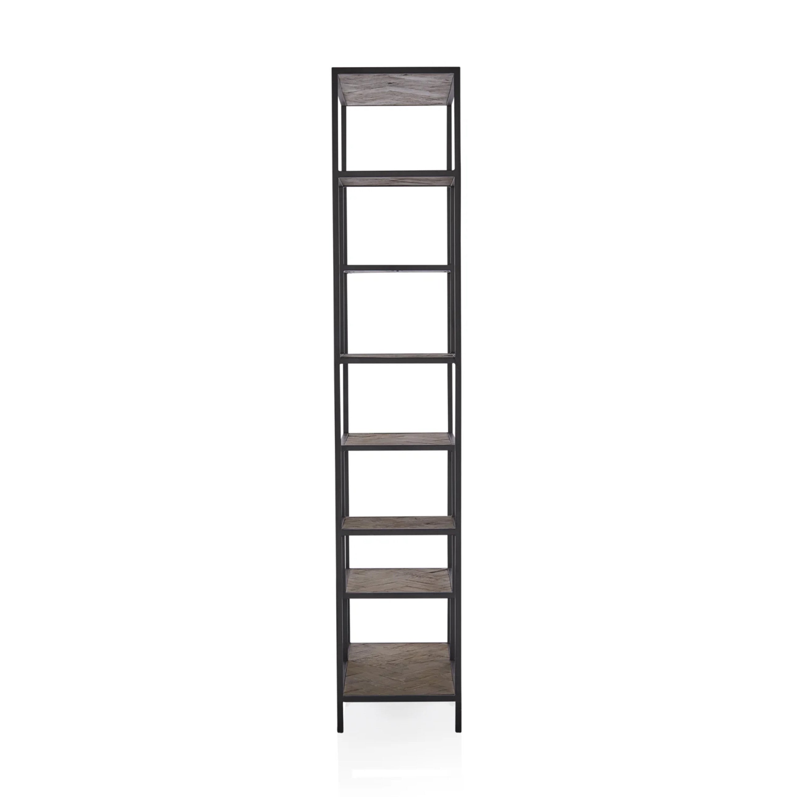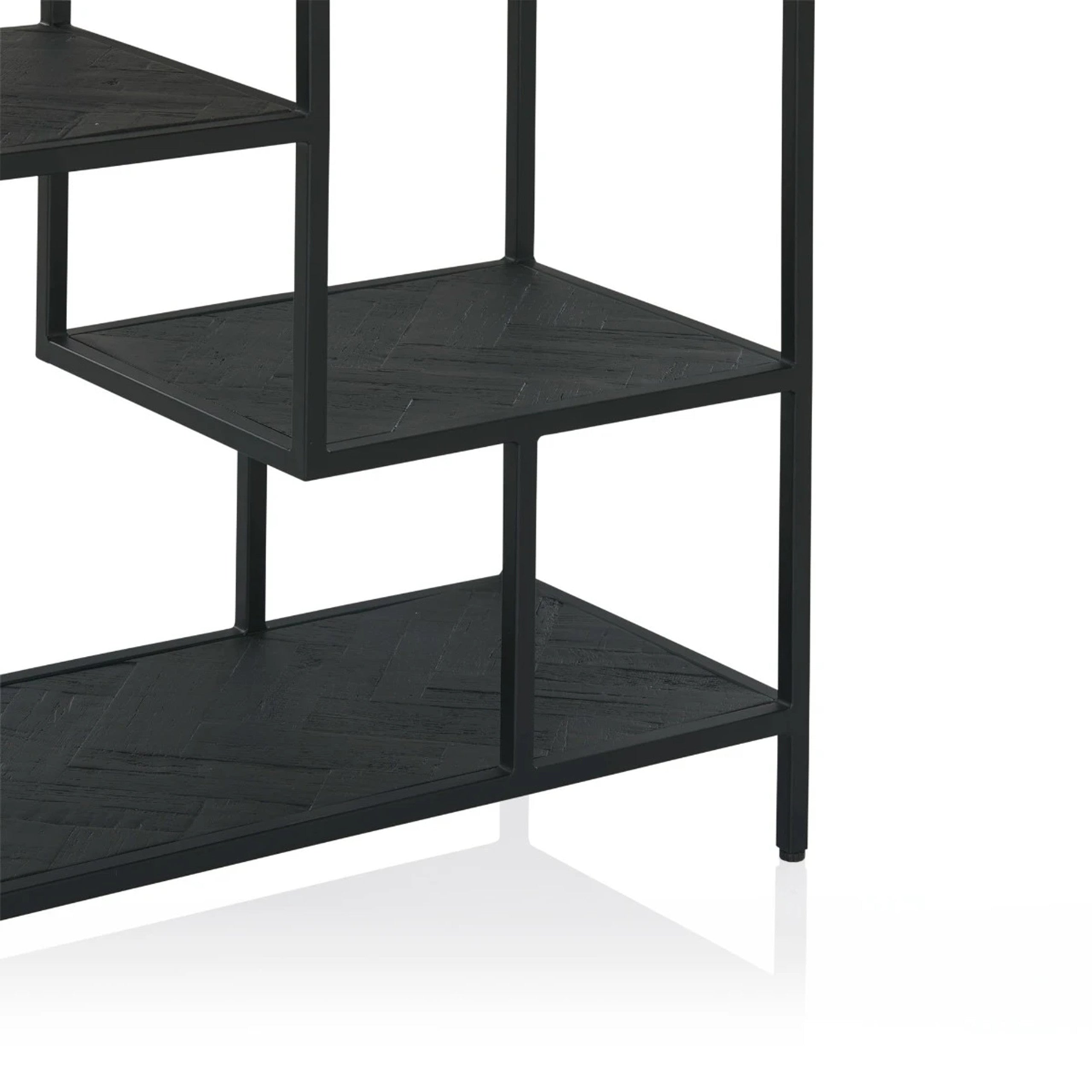 Rustic modern style etagere with handcrafted parquet wood inlay and metal frame.|The Odessa Shelving Unit with handcrafted parquetry pattern inlay on each shelf exudes a natural style ideal for today's living spaces. The timber has a natural distressed look combined with a geometric metal frame. Pair two side-by-side to create a striking display of coveted items. Curated for the sophisticated home the Gramercy collection is inspired by interiors of chic Parisian homes. Handcrafted from timber with elegant metal accents the colour palette lends a refined modern edge to classic forms.