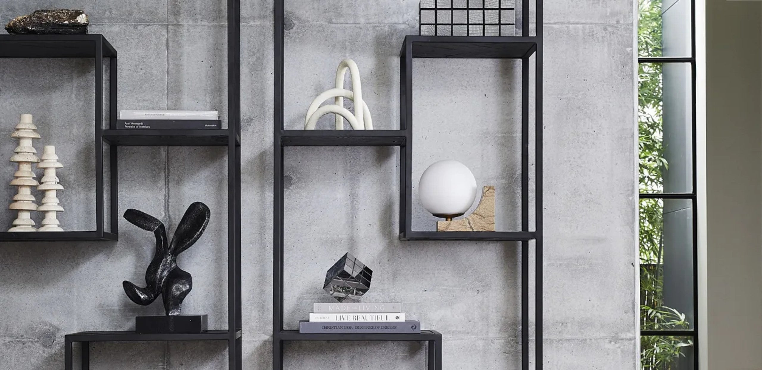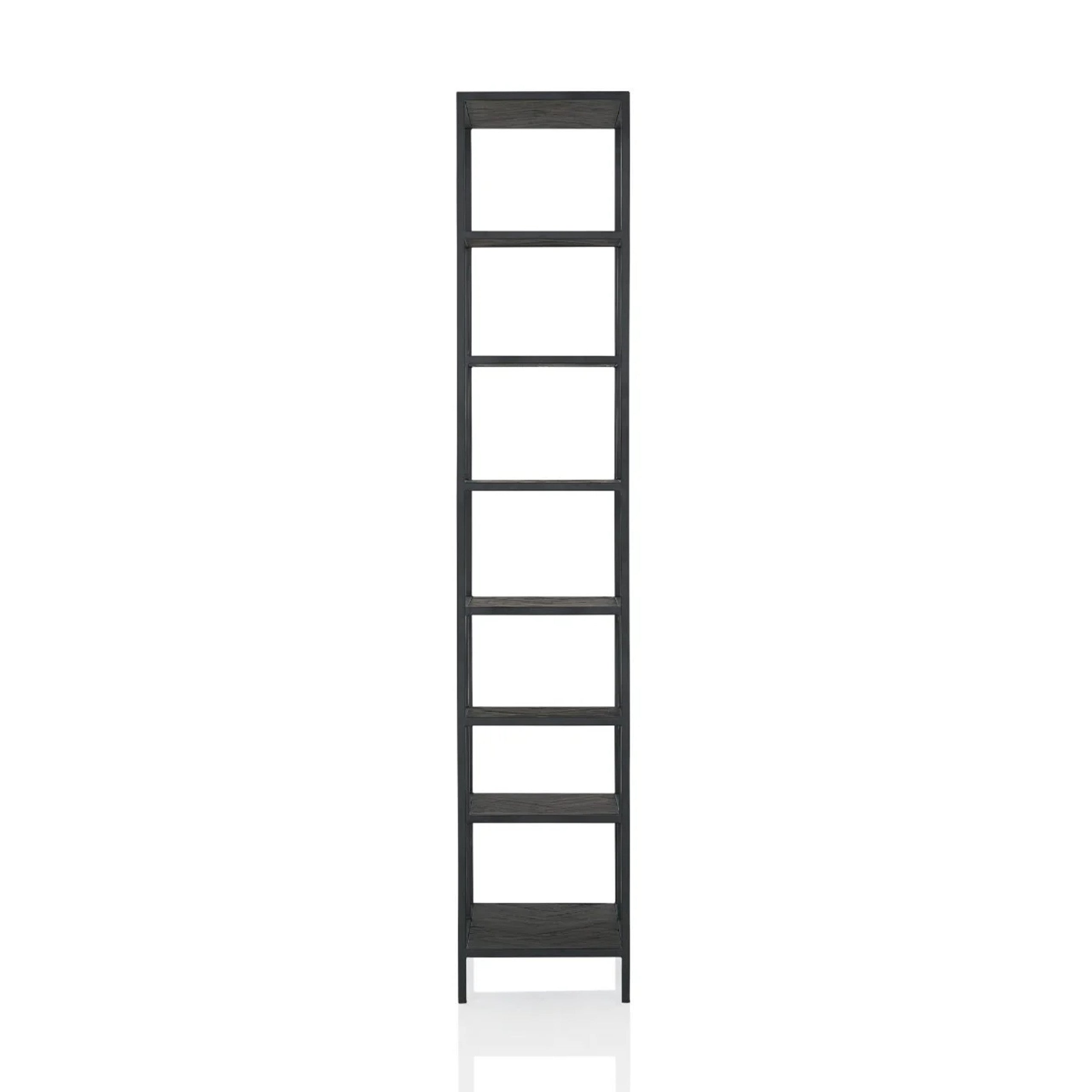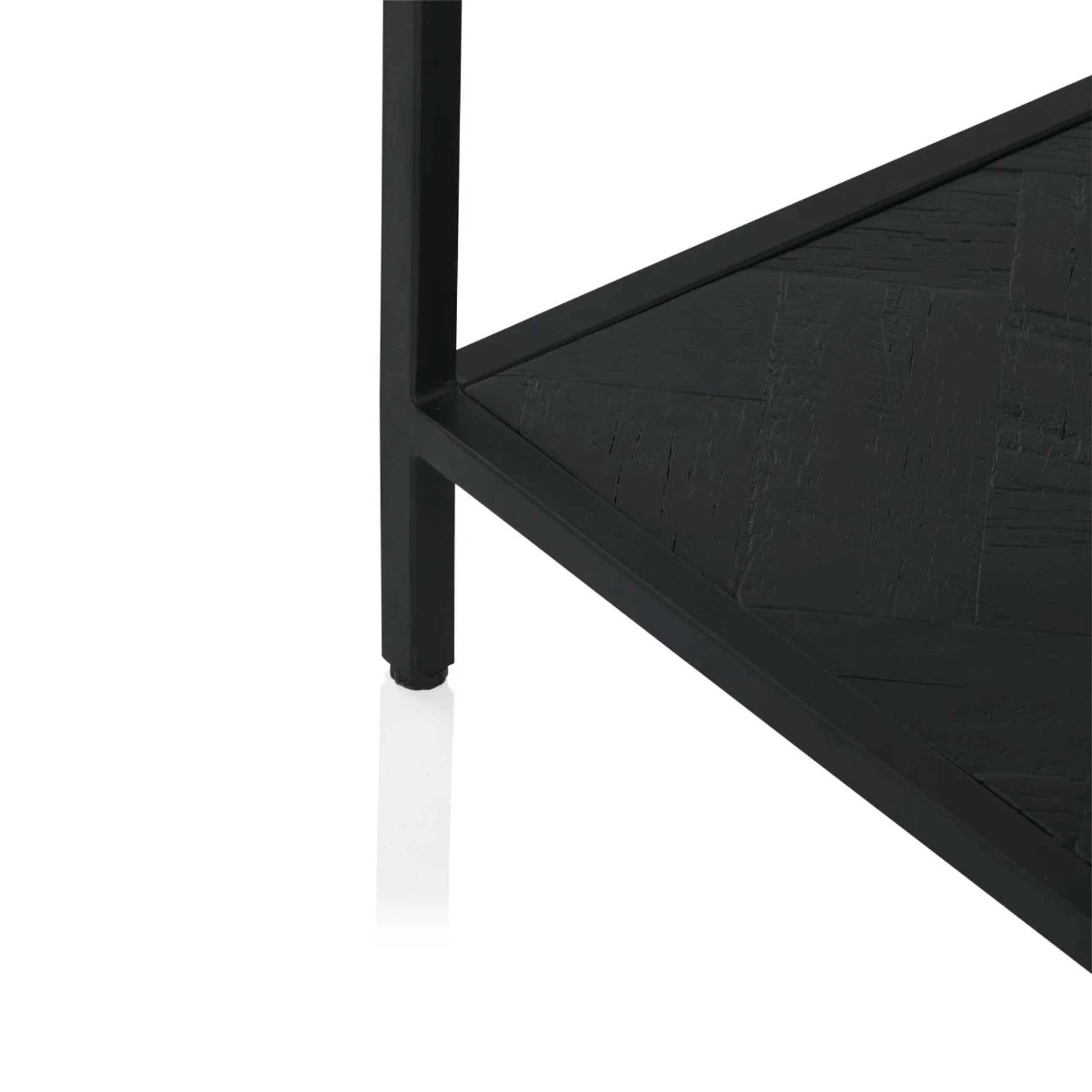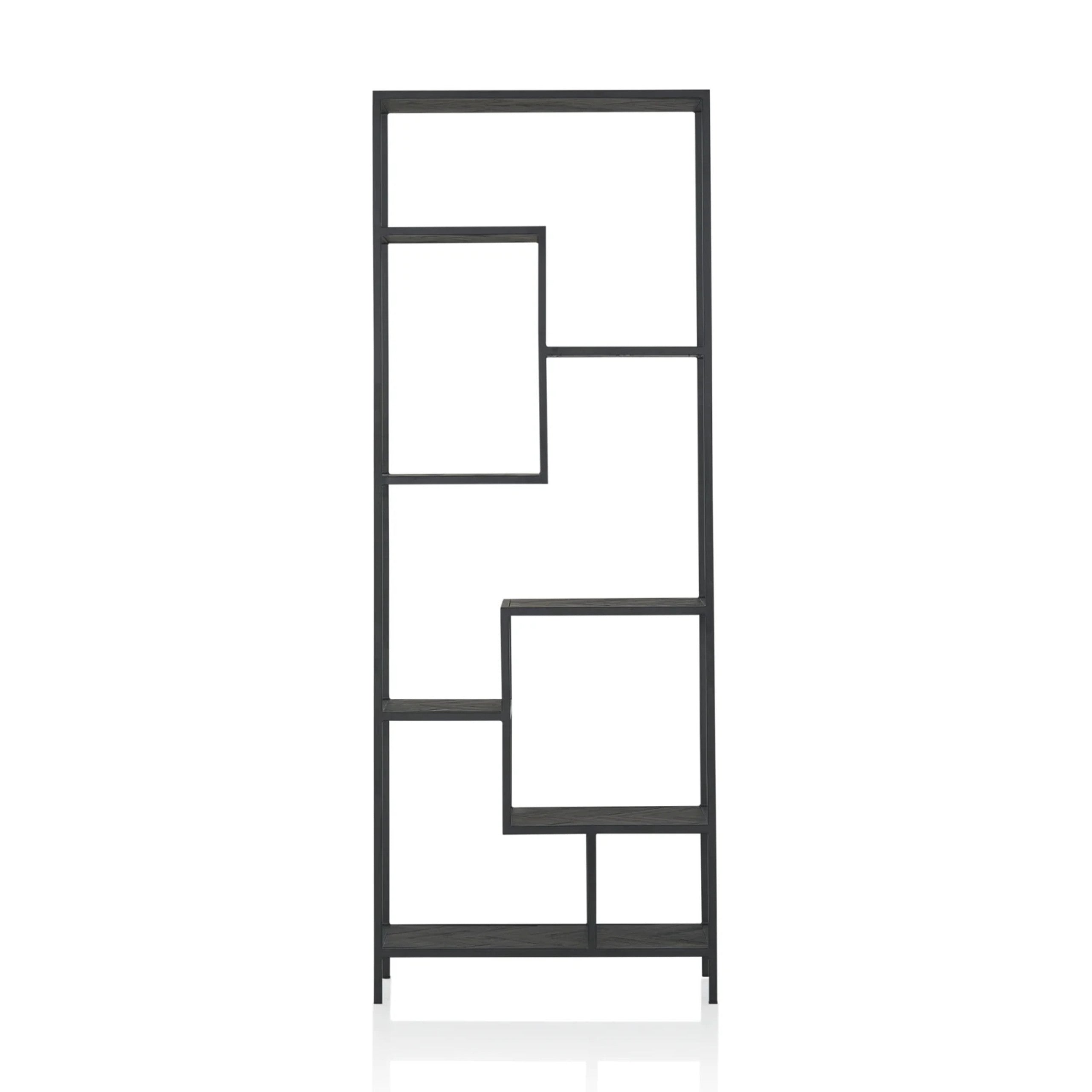 Rustic modern style etagere with handcrafted parquet wood inlay and metal frame.|The Odessa Shelving Unit with handcrafted parquetry pattern inlay on each shelf exudes a natural style ideal for today's living spaces. The timber has a natural distressed look combined with a geometric metal frame. Pair two side-by-side to create a striking display of coveted items. Curated for the sophisticated home the Gramercy collection is inspired by interiors of chic Parisian homes. Handcrafted from timber with elegant metal accents the colour palette lends a refined modern edge to classic forms.