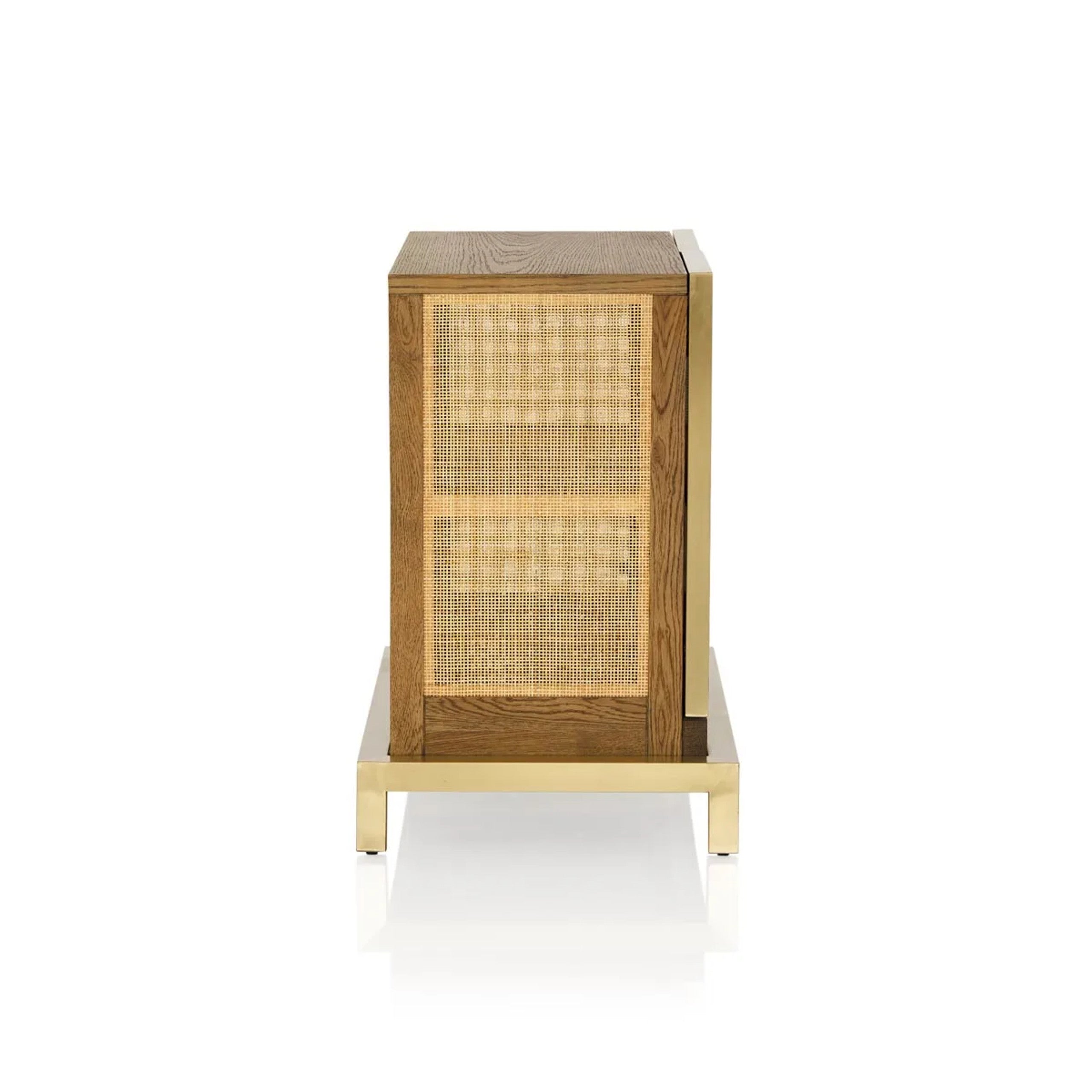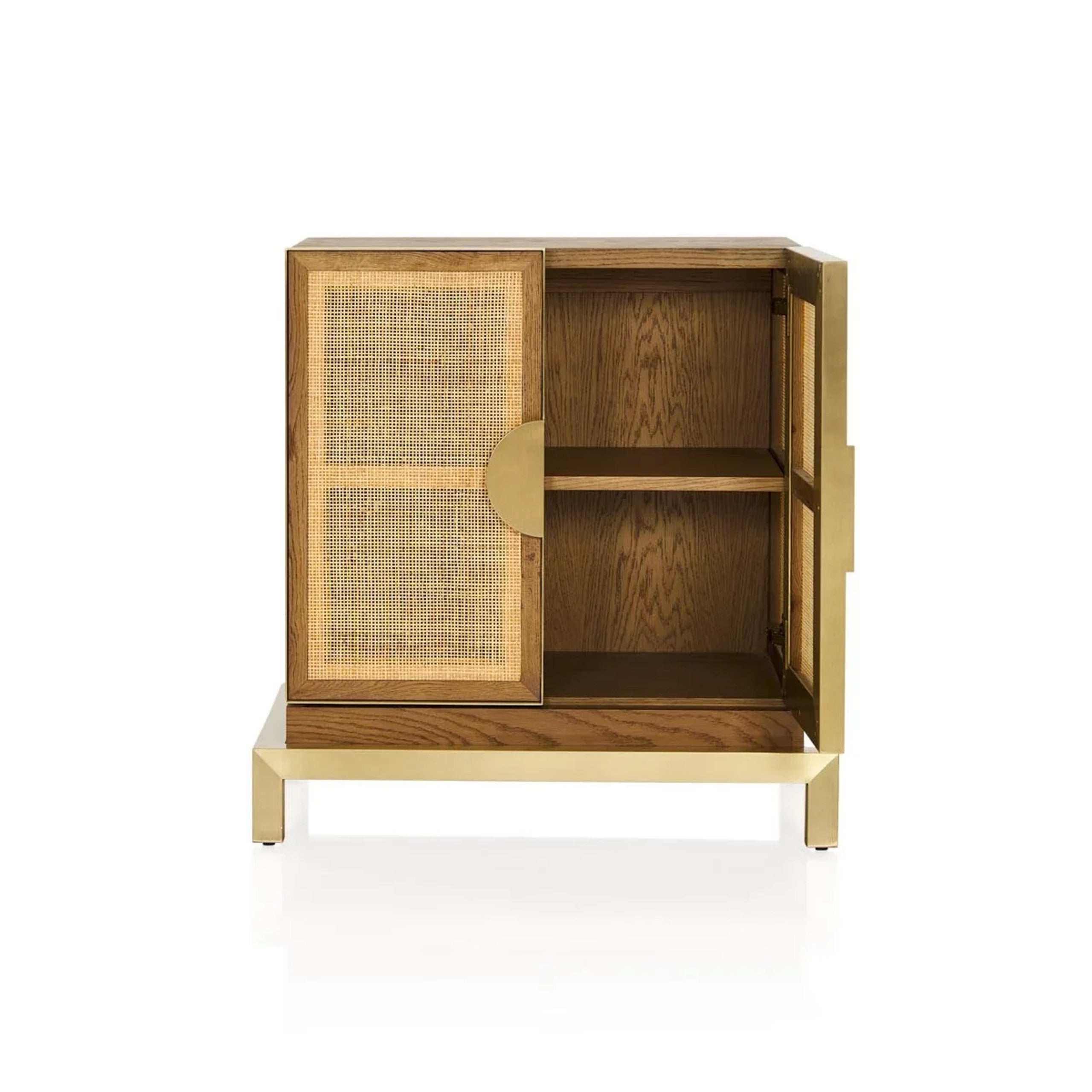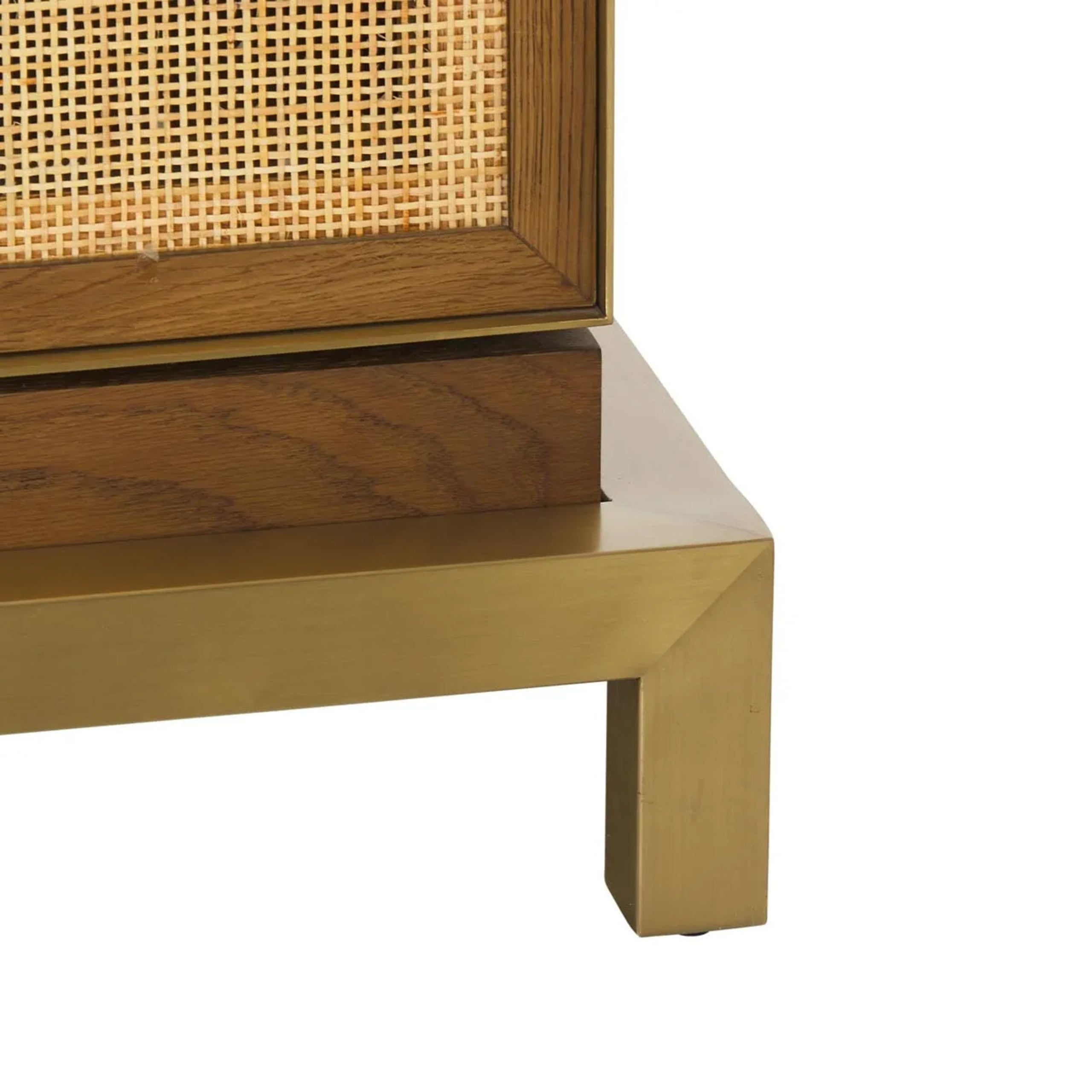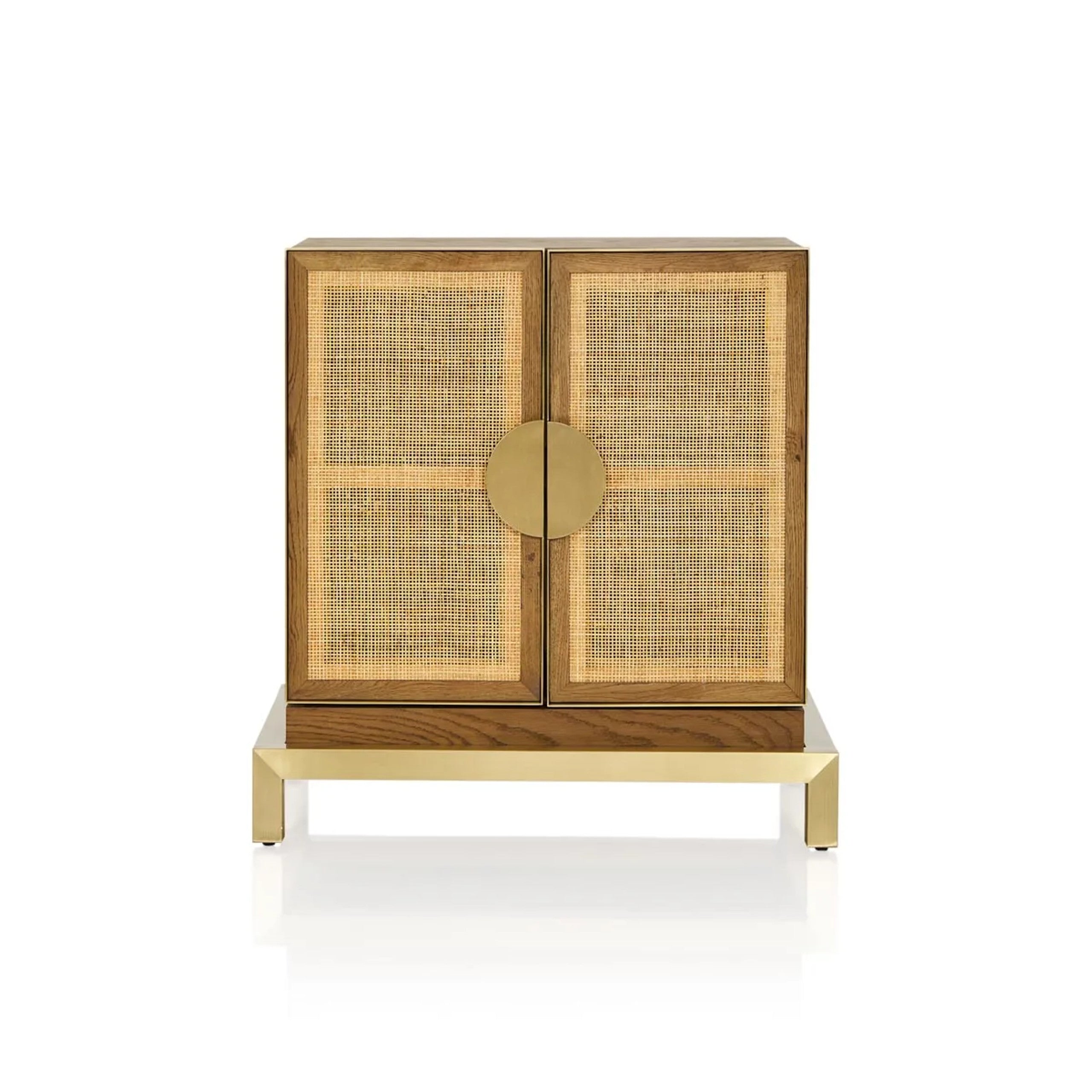 A striking design combining mixed natural materials that enhance its dimensionality.|The Paloma range celebrates a harmonious juxtaposition of scale and texture to deliver timeless allure with outstanding character. Featuring double doors with ample storage the bedside cabinet encapsulates the spirit of coastal California. Combining the delicate texture of natural rattan framed by solid oak and burnished brass accents in geometric form this piece is strikingly unique.