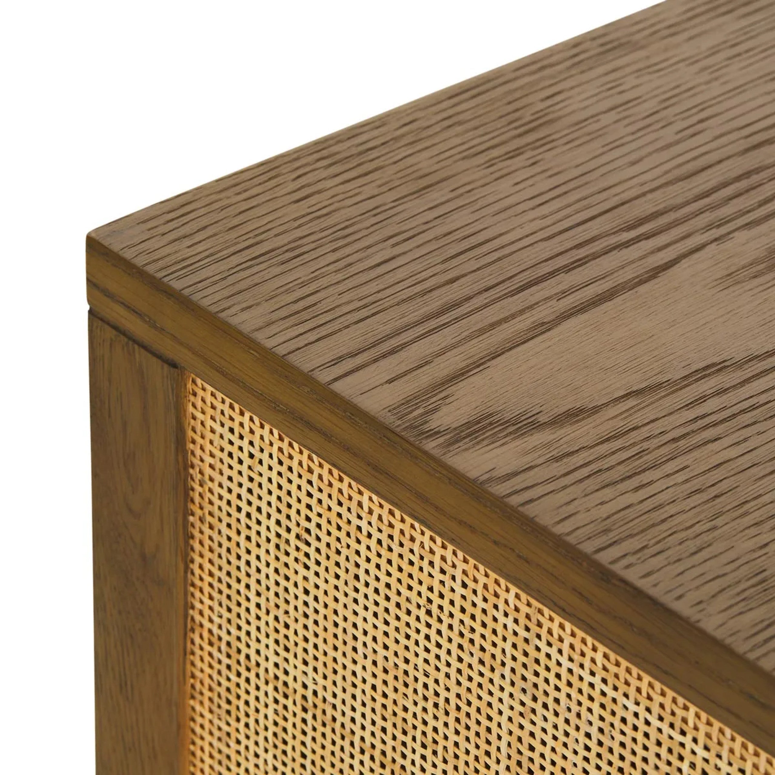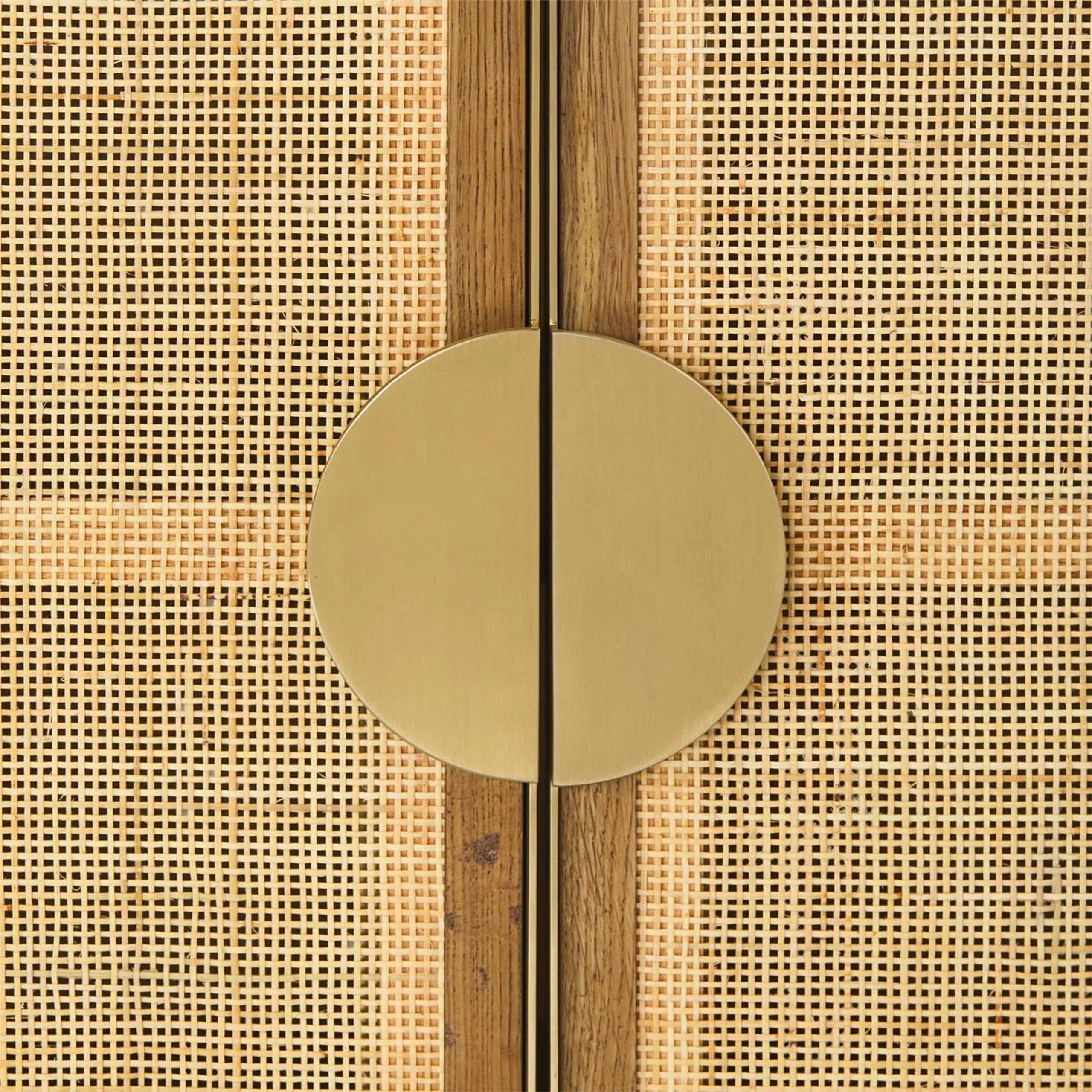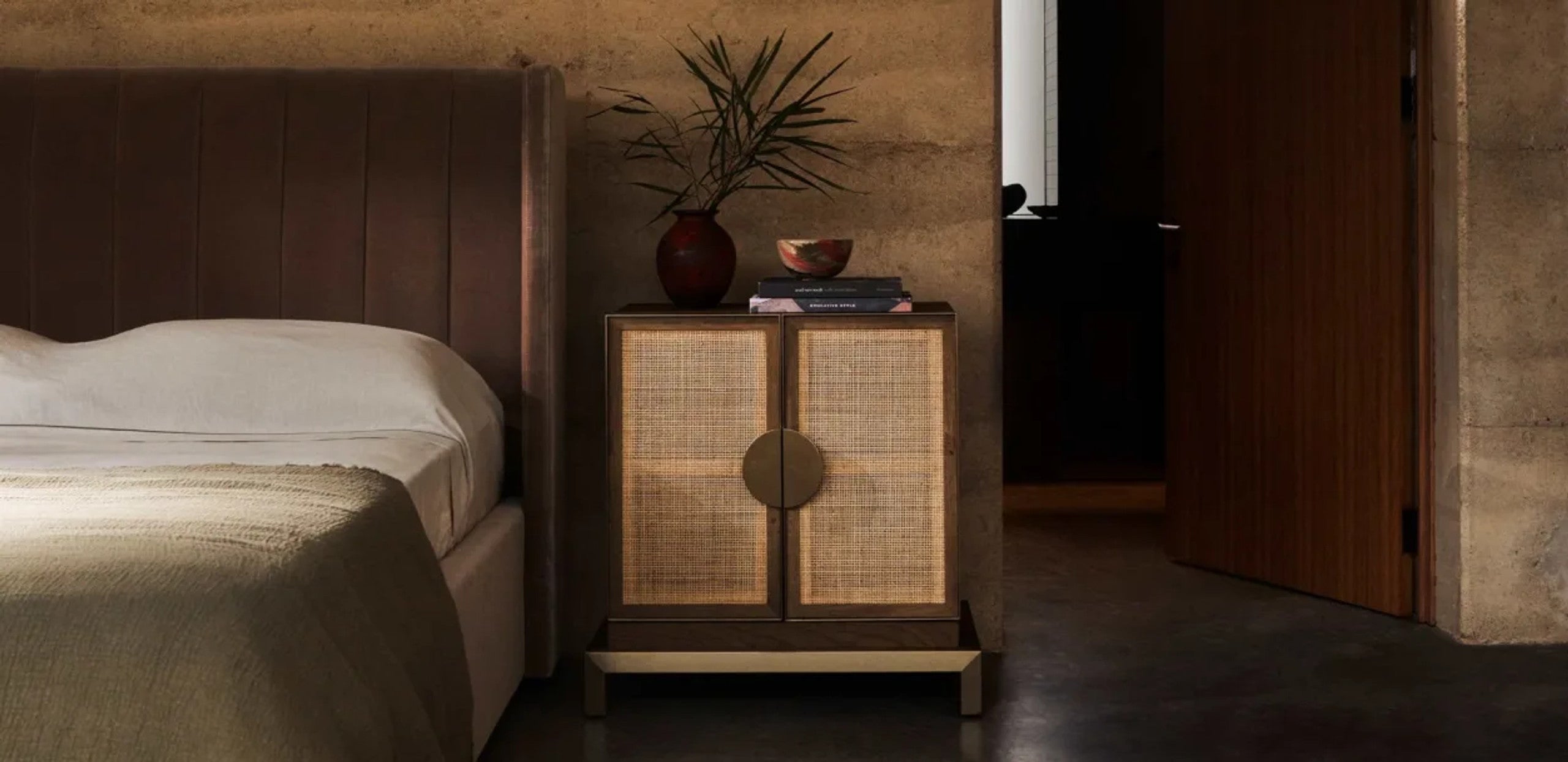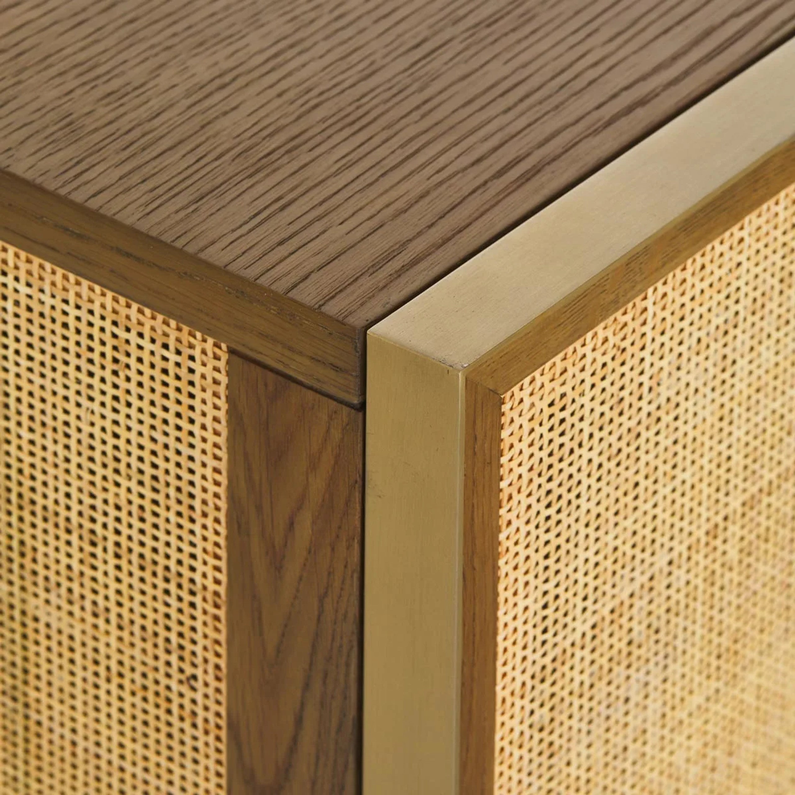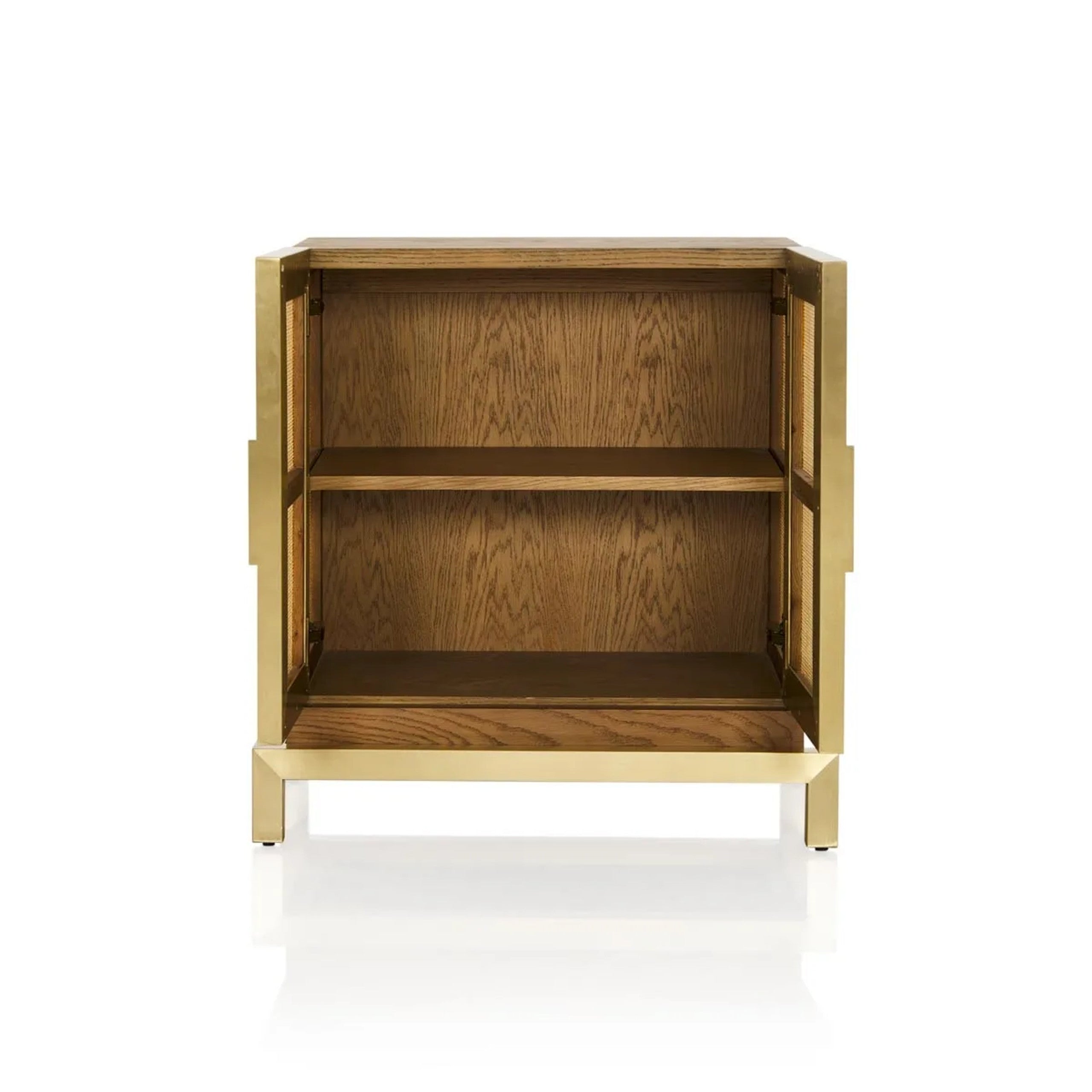 A striking design combining mixed natural materials that enhance its dimensionality.|The Paloma range celebrates a harmonious juxtaposition of scale and texture to deliver timeless allure with outstanding character. Featuring double doors with ample storage the bedside cabinet encapsulates the spirit of coastal California. Combining the delicate texture of natural rattan framed by solid oak and burnished brass accents in geometric form this piece is strikingly unique.