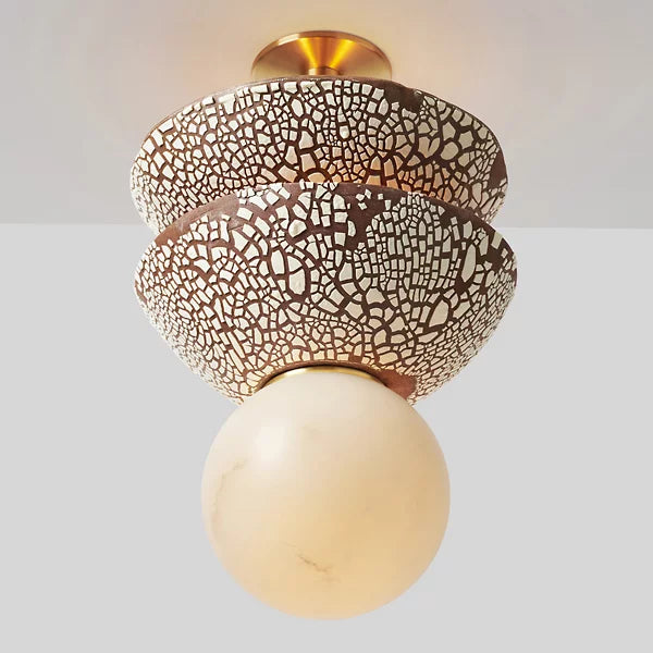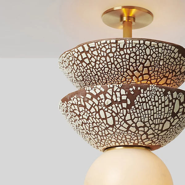 An enchanting example of primitive shapes contrasted with clean-surfaced metalwork. The Petra Double Alabaster Pendant from Rosie Li Studio draws its inspiration from the architectural appeal of Brancusi’s Endless Columns and leverages Li’s background in drawing and design. A circle canopy and stem in stately solid brass extend downward, threading strong lamping through two ceramic dishes with earthen glazes. An alabaster sphere sweeps around the lamping below, offering a final touch of refinement while transforming bright glare into a warm glow.