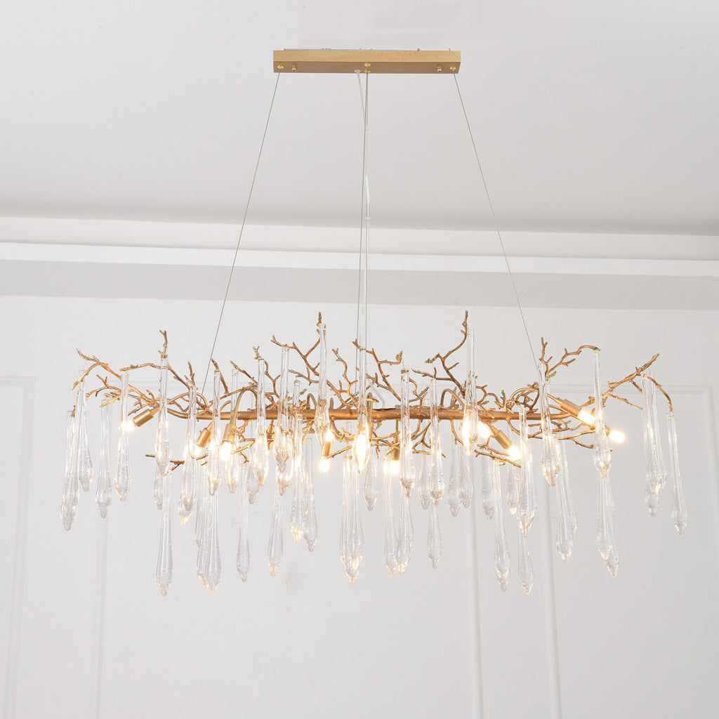 Crafted from brass and adorned with glass drops, this branch chandelier features a stunning crystal droplet design inspired by the beauty of nature. Its unique halo consists of organically formed brass branches dripping with hand-blown glass teardrops, creating a dynamic and captivating setting in any room. The combination of materials and design elements adds an elegant touch while drawing inspiration from the natural world.