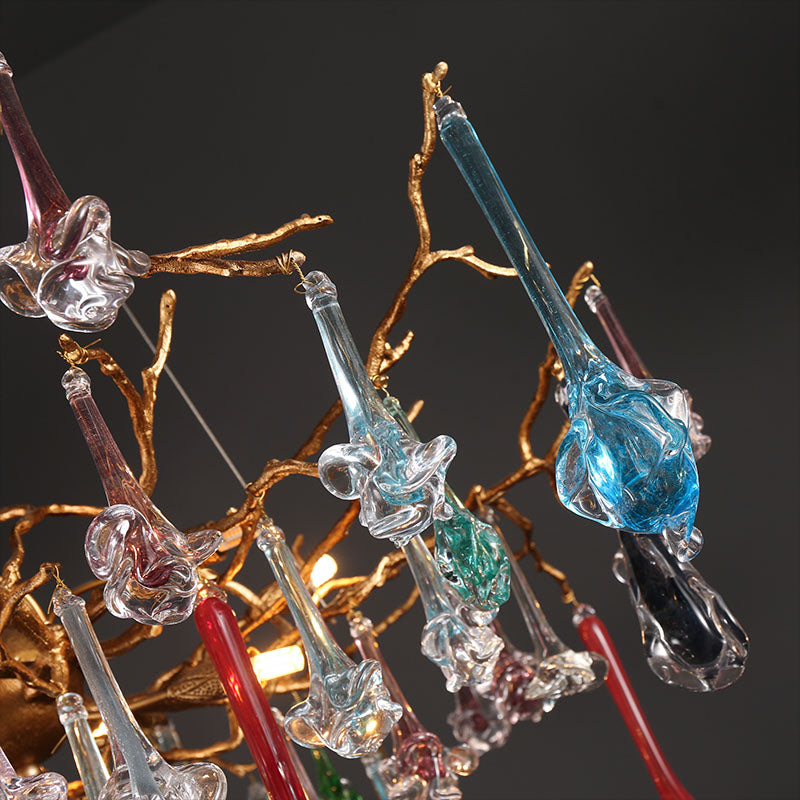 Crafted from brass and glass, this round chandelier features hand-twisted brass branches, meticulously shaped by hand to create a natural and organic appearance. Adorned with beautiful rose-shaped glass drops, this chandelier is well-suited for the dining and kitchen area, adding a touch of elegance and organic beauty to these spaces.