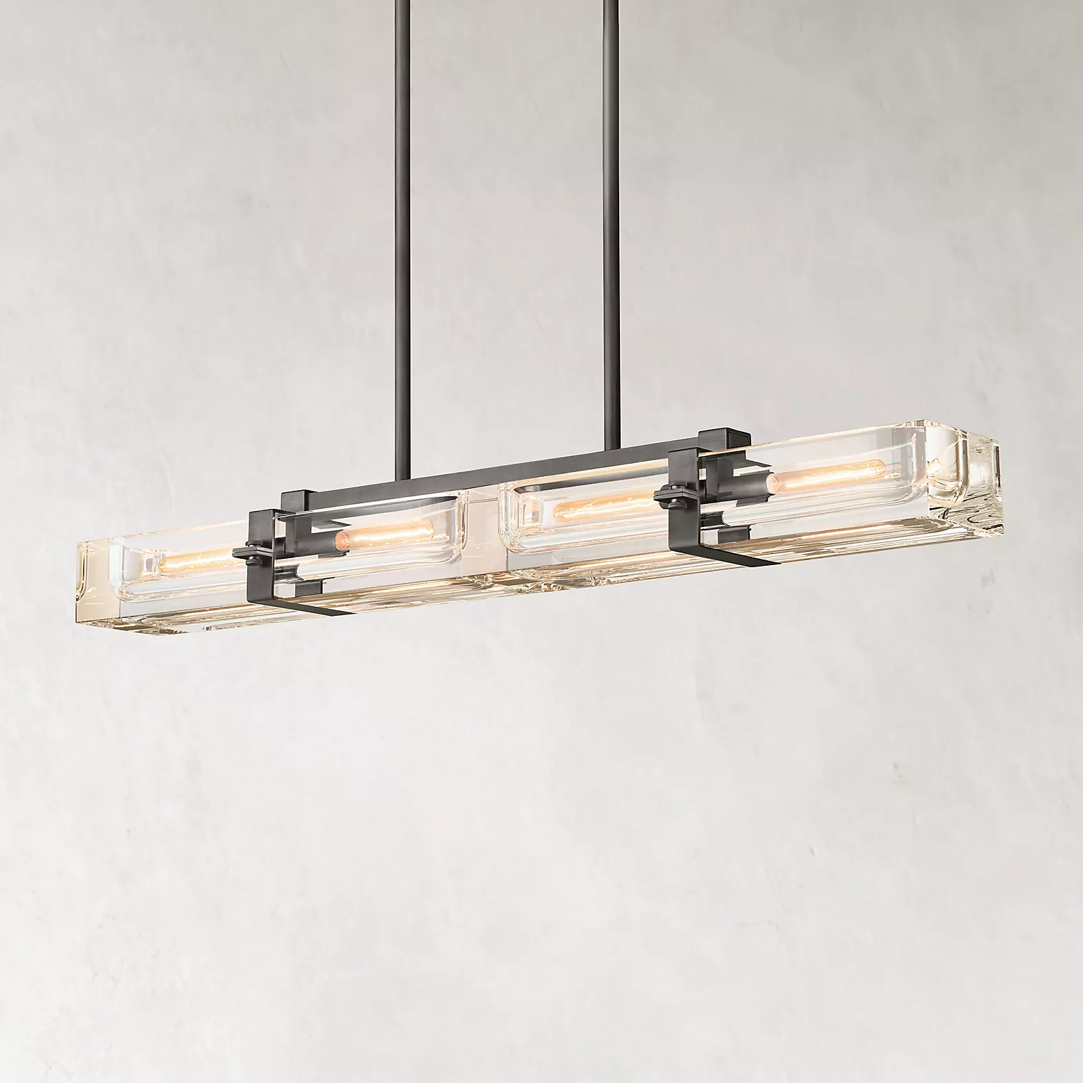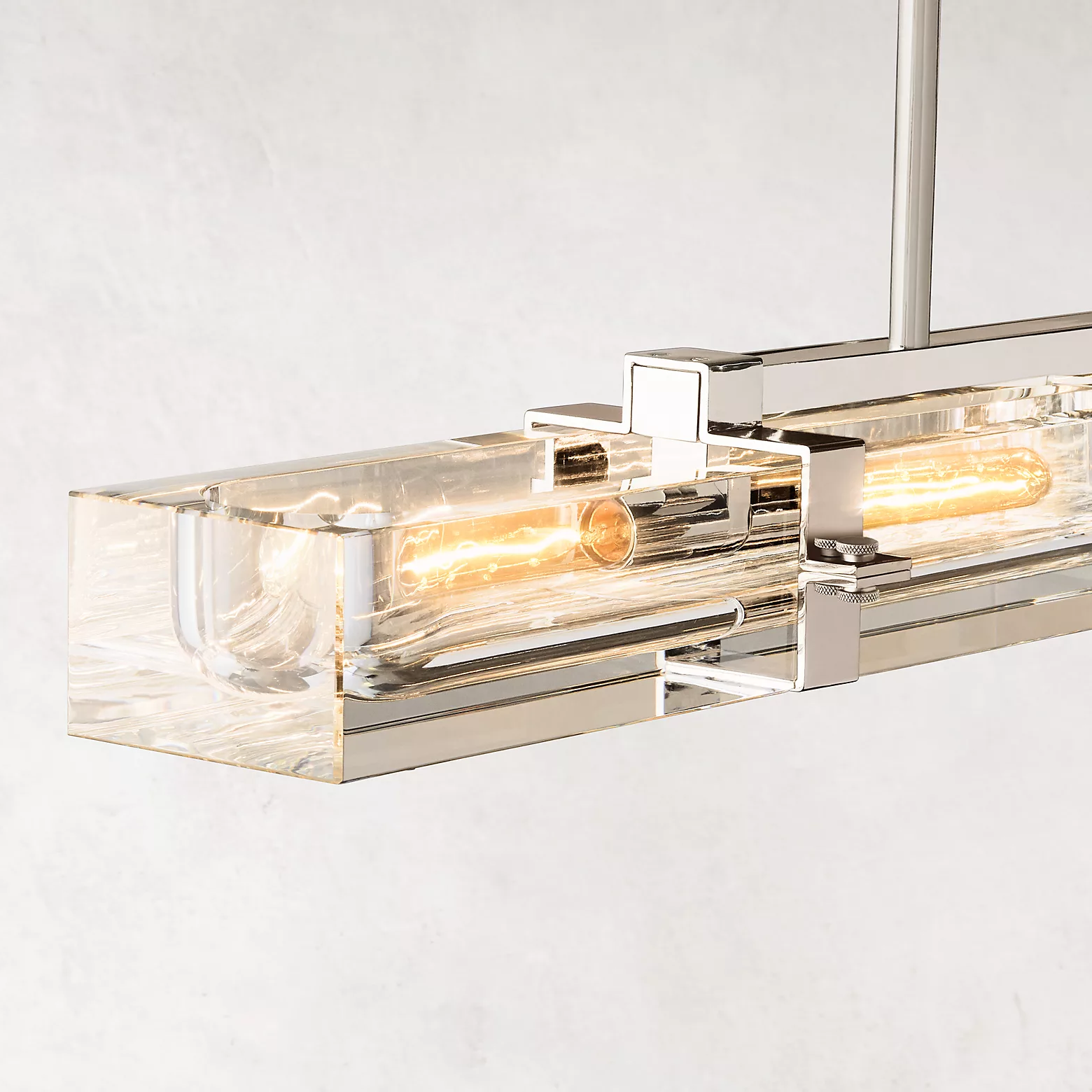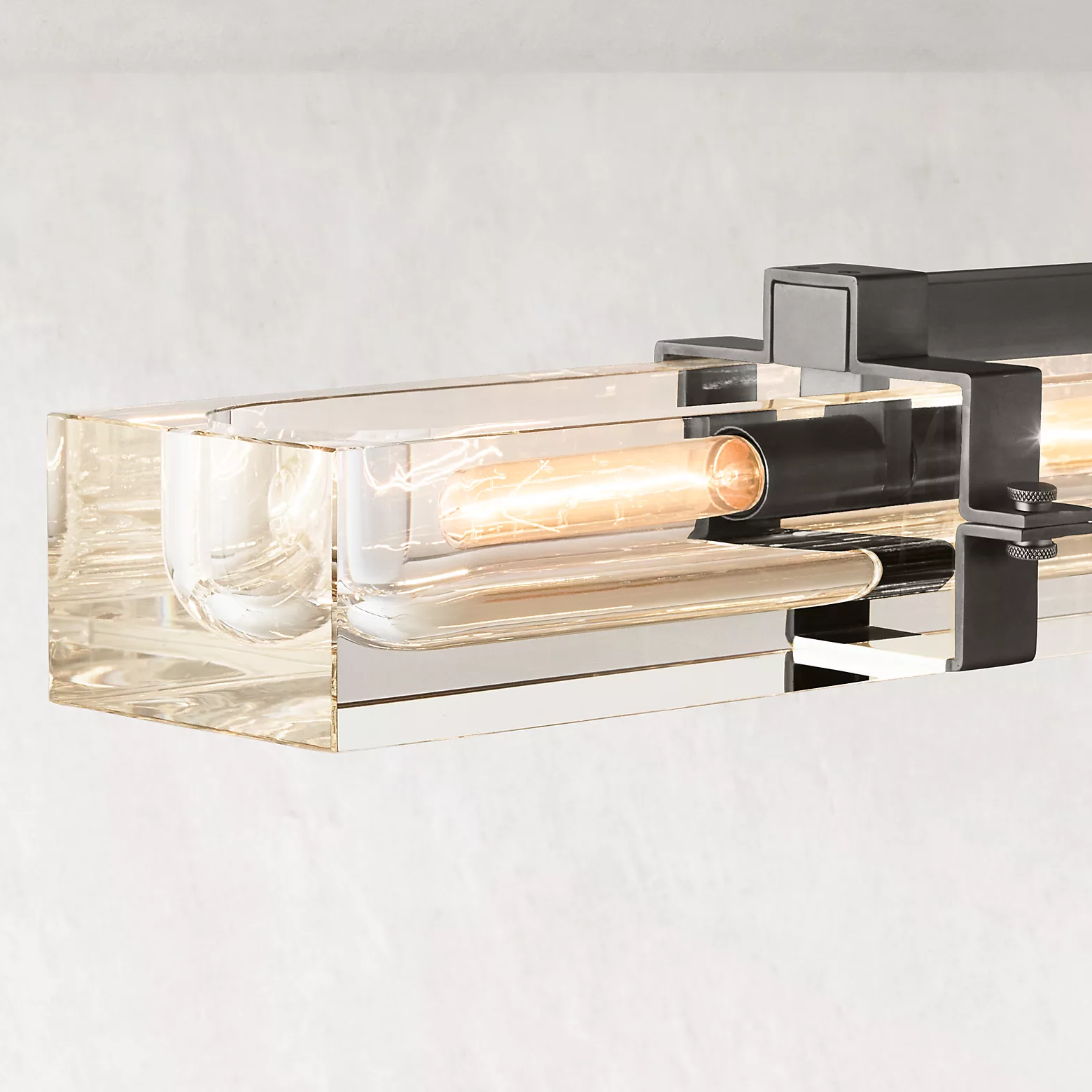 A massive piece of crystal is carved into a recessed channel to accommodate an Edison bulb set in a solid brass frame. The crystal shows its solidity when illuminated, refracting and reflecting the light bulb inside, yet exhibiting a weightless transparency in the dark.