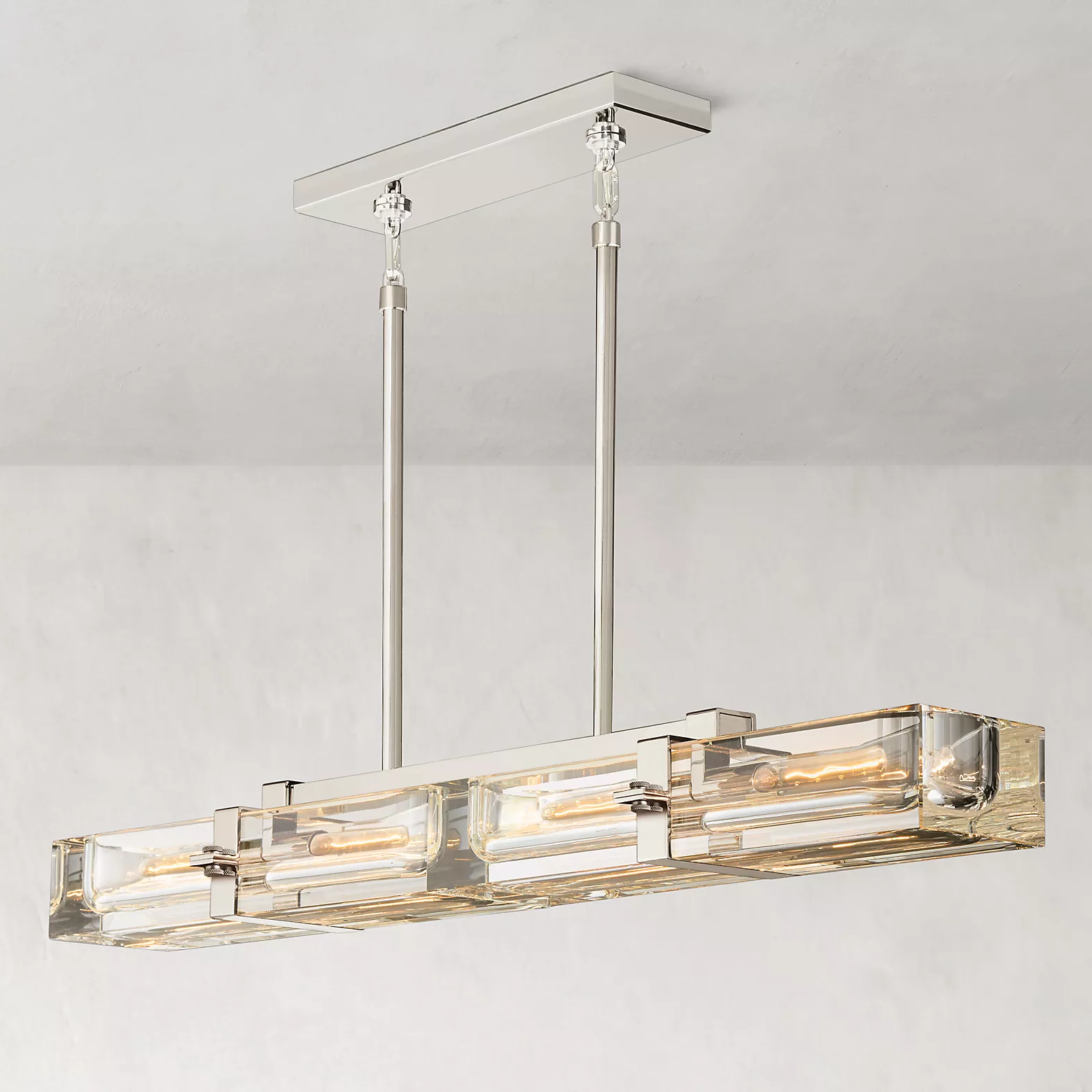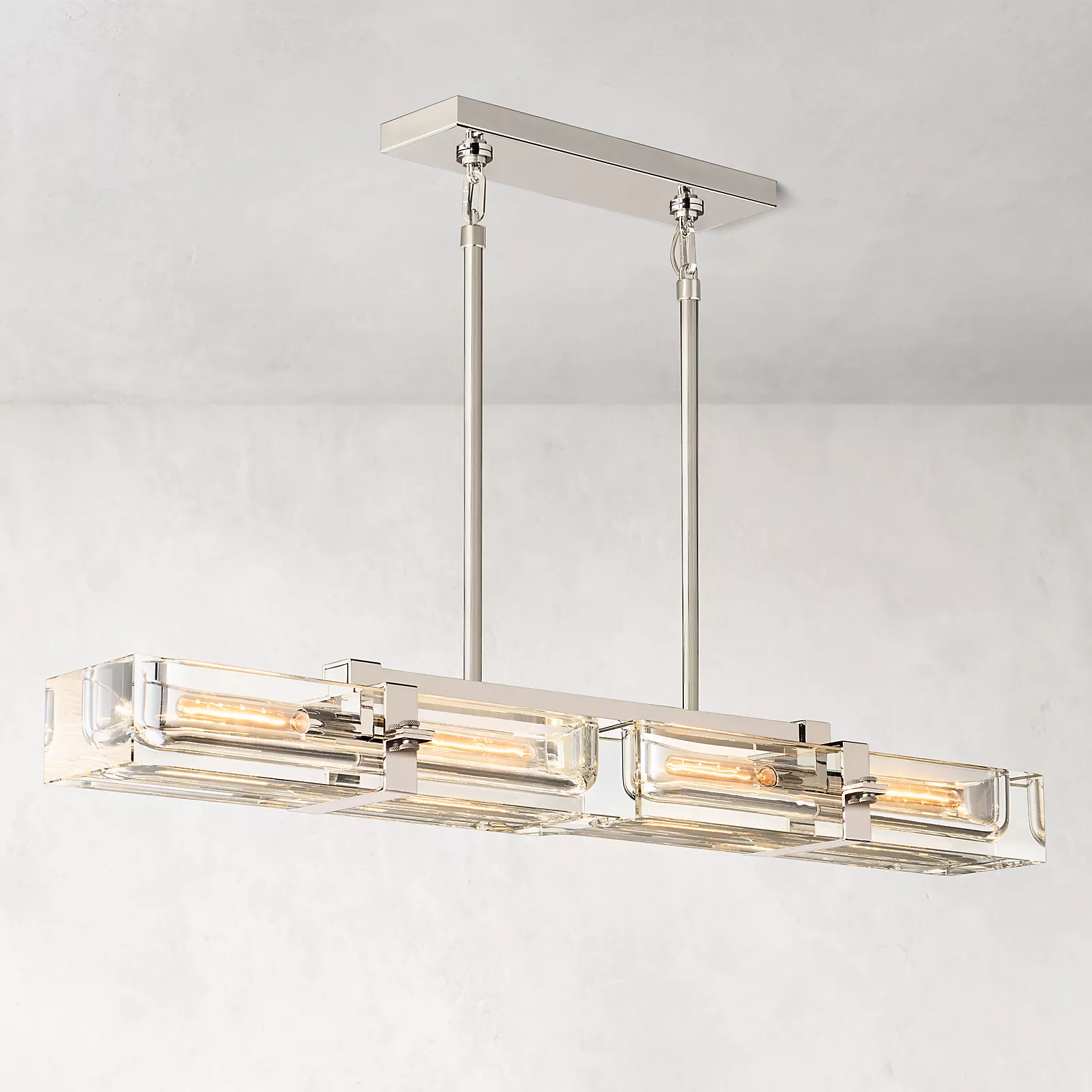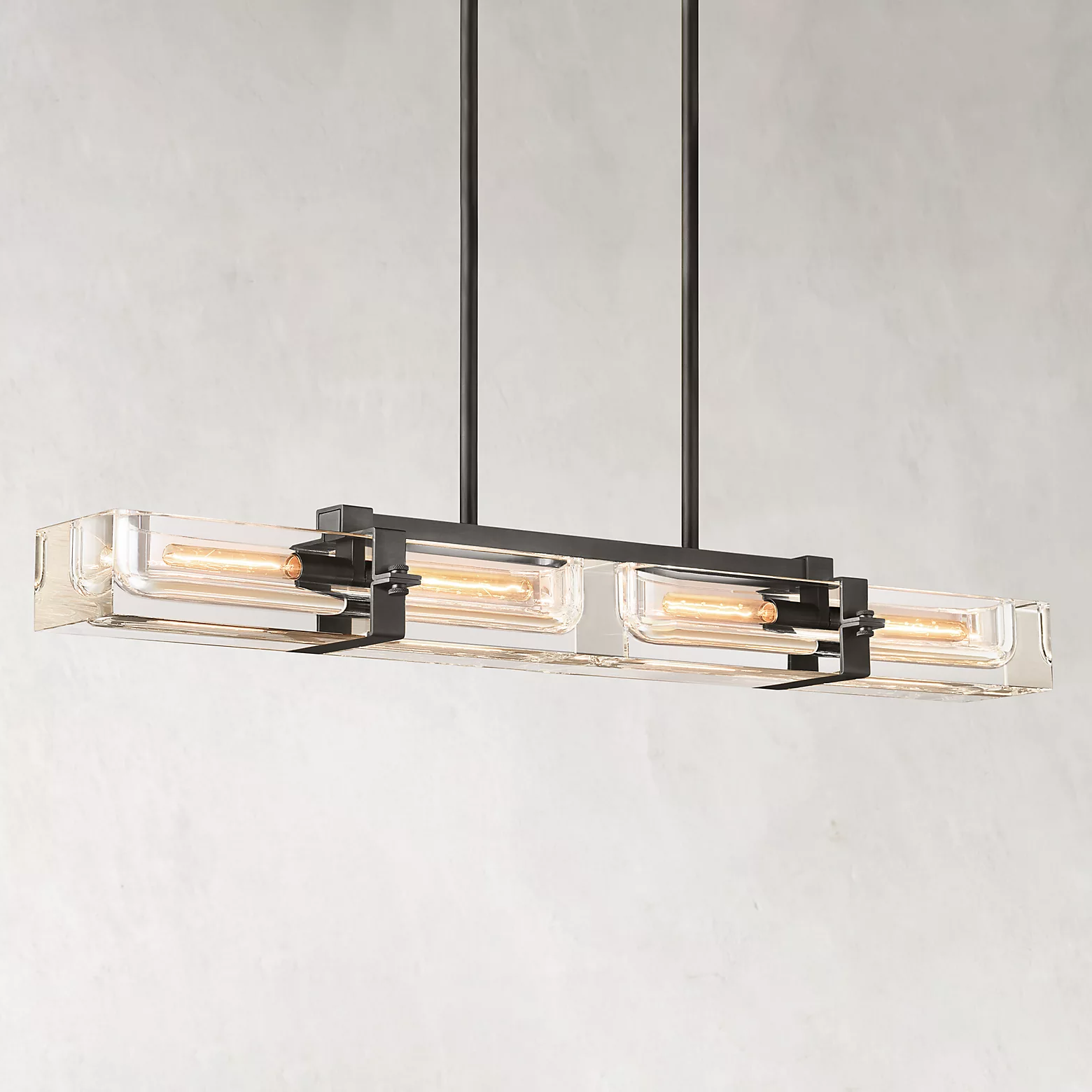 A massive piece of crystal is carved into a recessed channel to accommodate an Edison bulb set in a solid brass frame. The crystal shows its solidity when illuminated, refracting and reflecting the light bulb inside, yet exhibiting a weightless transparency in the dark.