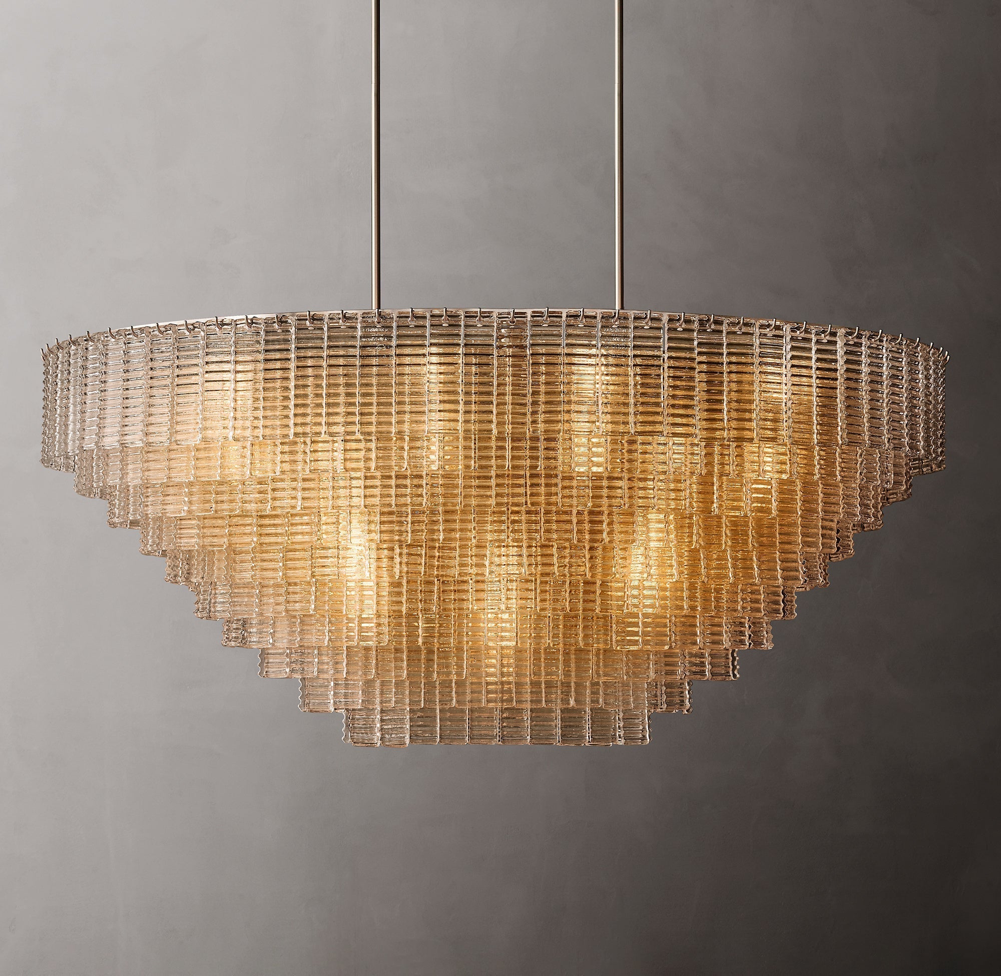 Our chandelier combines traditional glassmaking techniques with modernist style. A study in geometric repetition, the textured cast glass ribbons cascade in concentric circles, casting a warm glow to stunning effect.
