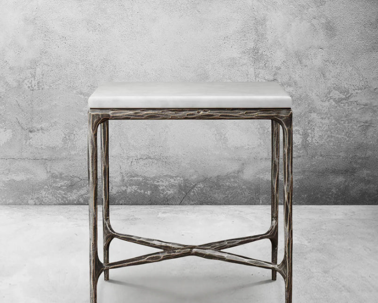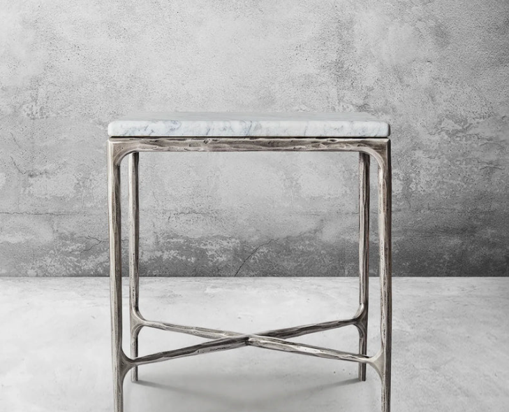 Inspired by the sculptural works of Salvador Dalí and Diego Giacometti, our collection by Julie Lawrence merges the rustic sensibility of hand-forged solid brass or solid stainless steel with cool Italian Carrara marble. Employing an ancient fabrication process, artisans hand hammer the brass bars to reveal an alive, imperfect and organic texture. The pounded, tapered silhouettes are a rich counterpoint to the smooth, honed stone.