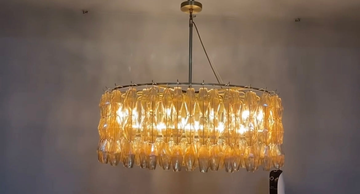 This chandelier is suspended from a tiered steel frame with dozens of hand-blown glass polyhedra on individual hooks. Illuminated from within, the faceted chandeliers dramatically reflect and refract light. A tribute to the Italian lighting style of the 1950s with this minimalist style.