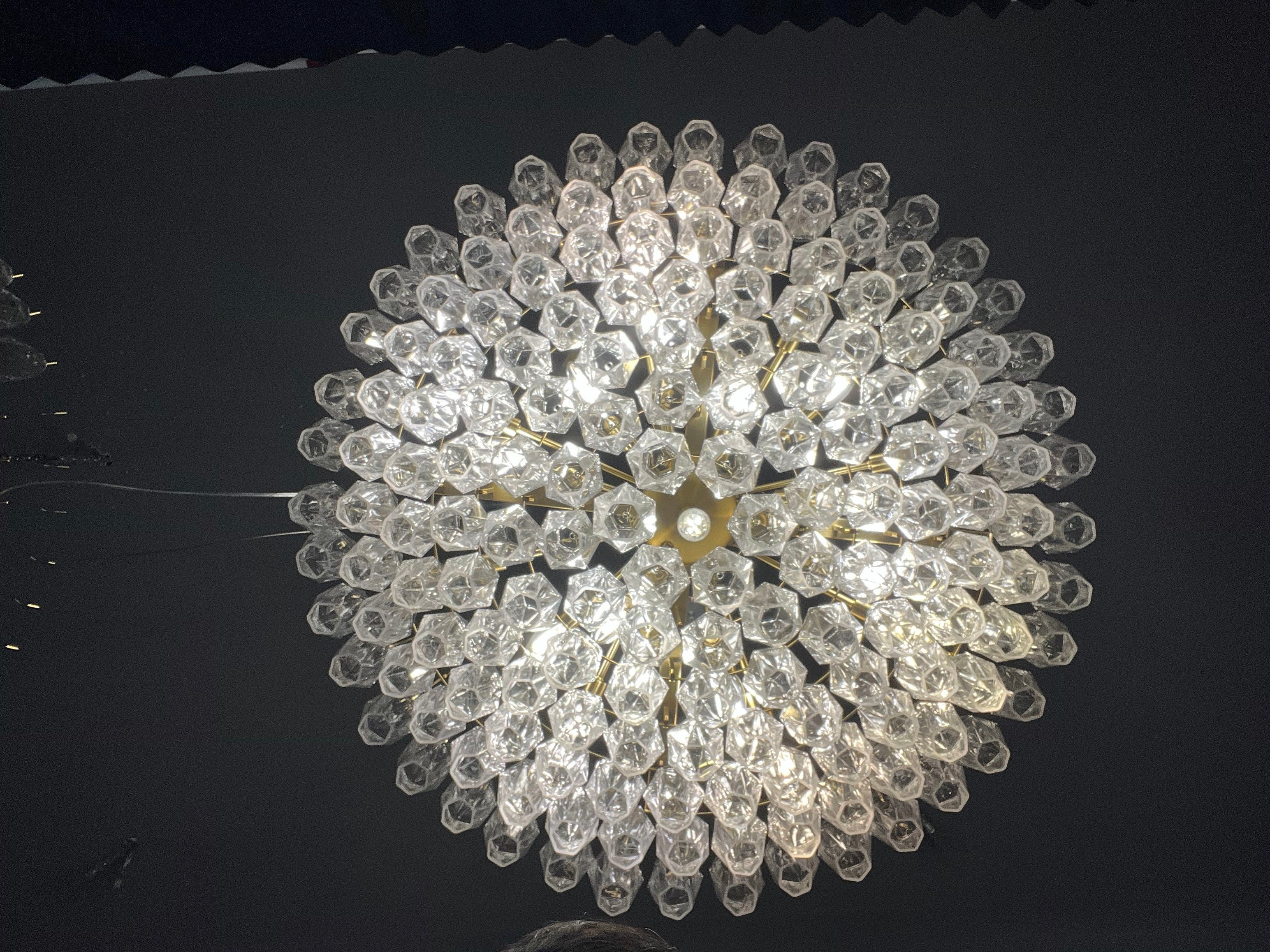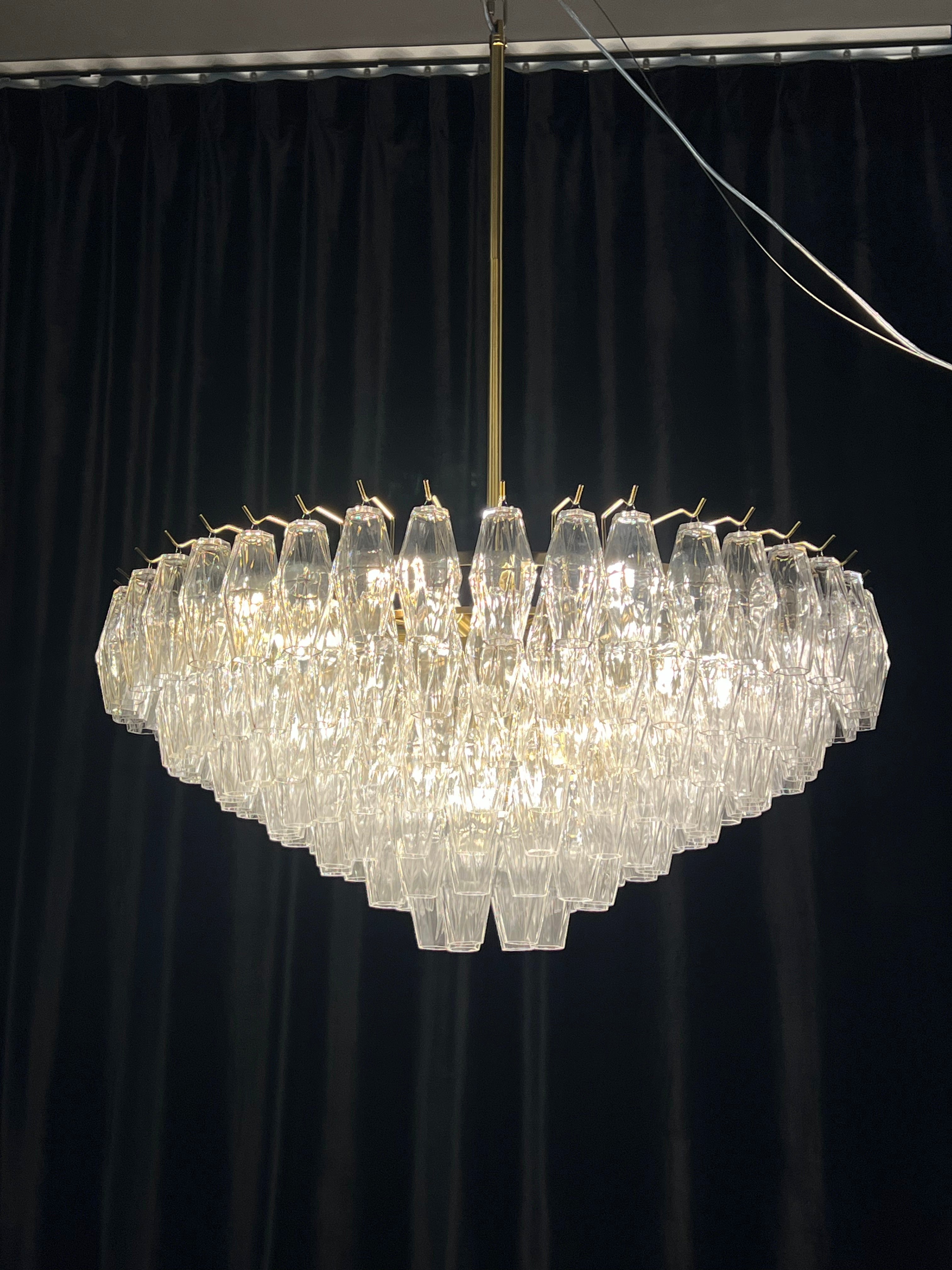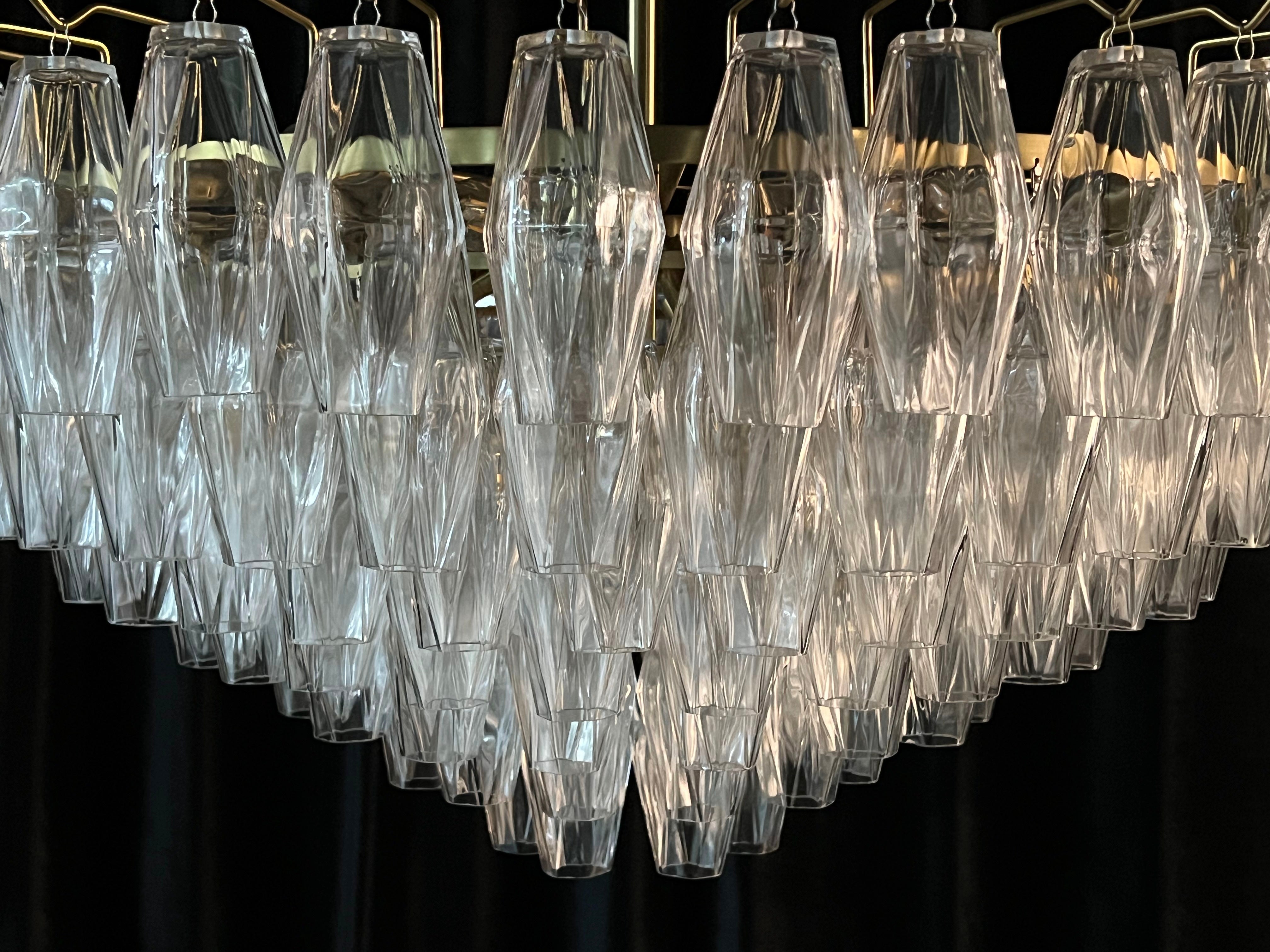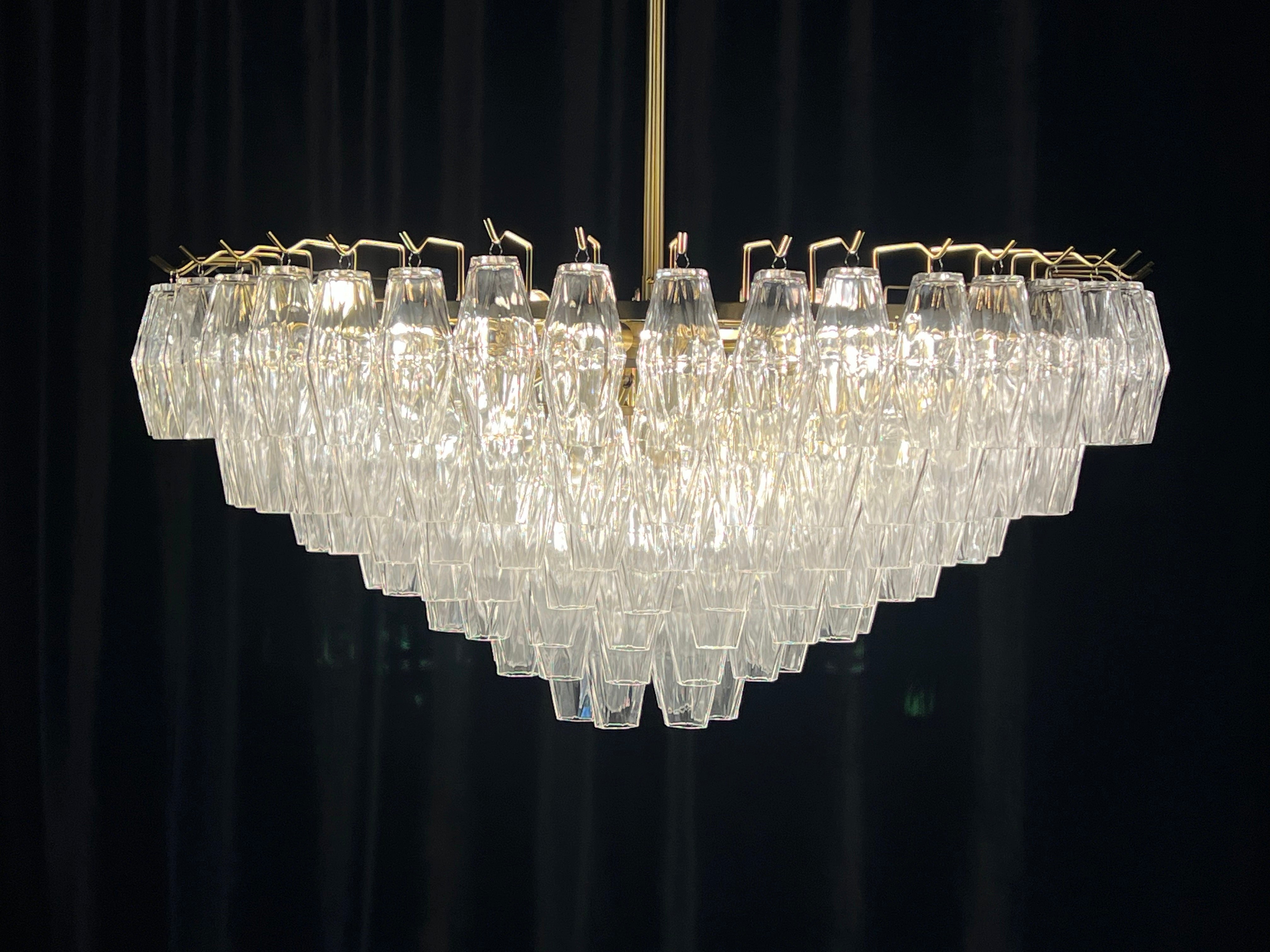 The chandelier is suspended from a tiered steel frame with dozens of hand-blown glass polyhedra on individual hooks. Illuminated from within, the faceted chandeliers dramatically reflect and refract light. A tribute to the Italian lighting style of the 1950s with this minimalist style.